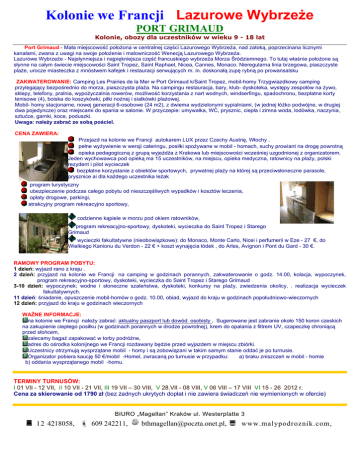 Kolonie we Francji - Lazurowe Wybrzeże PORT GRIMAUD Kolonie, obozy dla uczestników w wieku 9 - 18 lat Port Grimaud - Mała miejscowość położona w centralnej części Lazurowego Wybrzeża, nad zatoką, poprzecinana licznymi kanałami, zwana z uwagi na swoje położenie i malowniczość Wenecją Lazurowego Wybrzeża. Lazurowe Wybrzeże - Najsłynniejsza i najpiękniejsza część francuskiego wybrzeża Morza Śródziemnego. To tutaj właśnie położone są słynne na całym świecie miejscowości Saint Tropez, Saint Raphael, Nicea, Cannes, Monaco. Nieregularna linia brzegowa, piaszczyste plaże, urocze miasteczka z mnóstwem kafejek i restauracji serwujących m. in. doskonałą zupę rybną po prowansalsku ZAKWATEROWANIE: Camping Les Prairies de la Mer w Port Grimaud k/Saint Tropez, mobil-homy Trzygwiazdkowy camping przylegający bezpośrednio do morza, piaszczysta plaża. Na campingu restauracja, bary, klub- dyskoteka, występy zespołów na żywo, sklepy, telefony, pralnia, wypożyczalnia rowerów, możliwość korzystania z nart wodnych, windserfingu, spadochronu, bezpłatne korty tenisowe (4), boiska do koszykówki, piłki nożnej i siatkówki plażowej. Mobil- homy stacjonarne, nowej generacji 6-osobowe (24 m2), z dwiema wydzielonymi sypialniami, (w jednej łóżko podwójne, w drugiej dwa pojedyncze) oraz miejscami do spania w salonie. W przyczepie: umywalka, WC, prysznic, ciepła i zimna woda, lodówka, naczynia, sztućce, garnki, koce, poduszki. Uwaga: należy zabrać ze sobą pościel. CENA ZAWIERA: Przejazd na kolonie we Francji autokarem LUX przez Czechy Austrię, Włochy . pełne wyżywienie w wersji cateringu, posiłki spożywane w mobil - homach, suchy prowiant na drogę powrotną opieka pedagogiczną z grupą wyjeżdża z Krakowa lub miejscowości wcześniej uzgodnionej z organizatorem. Jeden wychowawca pod opieką ma 15 uczestników, na miejscu, opieka medyczna, ratownicy na plaży, polski rezydent i pilot wycieczek bezpłatne korzystanie z obiektów sportowych, prywatnej plaży na której są przeciwsłoneczne parasole, prysznice ai dla każdego uczestnika leżak program turystyczny ubezpieczenie podczas całego pobytu od nieszczęśliwych wypadków i kosztów leczenia, opłaty drogowe, parkingi, atrakcyjny program rekreacyjno sportowy, codzienne kąpiele w morzu pod okiem ratowników, program rekreacyjno-sportowy, dyskoteki, wycieczka do Saint Tropez i Starego Grimaud wycieczki fakultatywne (nieobowiązkowe): do Monaco, Monte Carlo, Nicei i perfumerii w Eze - 27 €, do Wielkiego Kanionu du Verdon - 22 € + koszt wynajęcia łódek , do Arles, Avignon i Pont du Gard - 30 €. RAMOWY PROGRAM POBYTU: 1 dzień: wyjazd rano z kraju . 2 dzień: przyjazd na kolonie we Francji na camping w godzinach porannych, zakwaterowanie o godz. 14.00, kolacja, wypoczynek, program rekreacyjno-sportowy, dyskoteki, wycieczka do Saint Tropez i Starego Grimaud 3-10 dzień: wypoczynek; wodne i słoneczne szaleństwa, dyskoteki, konkursy na plaży, zwiedzenia okolicy, . realizacja wycieczek fakultatywnych. 11 dzień: śniadanie, opuszczenie mobil-homów o godz. 10.00, obiad, wyjazd do kraju w godzinach popołudniowo-wieczornych 12 dzień: przyjazd do kraju w godzinach wieczornych WAŻNE INFORMACJE: na kolonie we Francji należy zabrać: aktualny paszport lub dowód. osobisty , Sugerowane jest zabranie około 150 koron czeskich na zakupienie ciepłego posiłku (w godzinach porannych w drodze powrotnej), krem do opalania z filtrem UV, czapeczkę chroniącą przed słońcem, zalecamy bagaż zapakować w torby podróżne, adres do ośrodka kolonijnego we Francji rozdawany będzie przed wyjazdem w miejscu zbiórki. Uczestnicy otrzymują wysprzątane mobil - homy i są zobowiązani w takim samym stanie oddać je po turnusie. Organizator pobiera kaucję 50 €/mobil -Homel, zwracaną po turnusie w przypadku: a) braku zniszczeń w mobil - homie b) oddania wysprzątanego mobil -homu. TERMINY TURNUSÓW: I 01 VII - 12 VII, II 10 VII - 21 VII, III 19 VII – 30 VIII, IV 28.VII - 08 VIII, V 06 VIII – 17 VIII, VI 15 - 26 2012 r. Cena za skierowanie od 1790 zł (bez żadnych ukrytych dopłat i nie zawiera świadczeń nie wymienionych w ofercie) BIURO „Magellan” Kraków ul. Westerplatte 3 « 12 4218058, ª 609 242211, [email protected], ¡ www.malypodroznik.com,