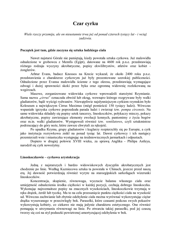Czar cyrku Wiele rzeczy przemija, ale on nieustannie trwa już od ponad czterech tysięcy lat - i wciąż zadziwia. Początek jest tam, gdzie zaczyna się sztuka ludzkiego ciała Nawet najstarsi Górale nie pamiętają, kiedy powstała sztuka cyrkowa. Już malowidła odnalezione w grobowcu z Memfis (Egipt), datowane na 4600 rok p.n.e. przedstawiają różnego rodzaju wyczyny akrobatyczne, popisy ekwilibrystów, atletów oraz kobiet żonglerów. Arhtur Evans, badacz Knossos na Krecie wykazał, że około 2400 roku p.n.e. przedstawienia o charakterze cyrkowym już były prezentowane szerokiej publiczności. Odnalezione przez Evansa malowidła ścienne z tego okresu, przedstawiają wymagające odwagi i dużej sprawności skoki przez byka oraz ogromną widownię rozlokowaną na wzgórzach. Masowe, zorganizowane widowiska cyrkowe wprowadzili starożytni Rzymianie. Sama nazwa „cirrus” oznaczała obwód lub okrąg, wewnątrz którego rozgrywane były walki gladiatorów, bądź wyścigi rydwanów. Niewątpliwie najsłynniejszym cyrkiem rzymskim było Koloseum a największym Cirrus Maximus (mógł pomieścić 150 tysięcy ludzi). Wówczas wspaniałe igrzyska cyrkowe poprzedzała parada ludzi i zwierząt tzw. pompa circensis. Na same widowiska składały się popisy setek tancerzy, linoskoczków, połykaczy mieczy, pokazy akrobatyczne, popisy zawierające elementy ewolucji konnych, pantomimy z życia bogów oraz m.in. walki gladiatorów. Występowali również tzw. ventilatores, czyli sztukmistrze podrzucający do góry noże, które zawsze chwytali za rękojeść. Po upadku Rzymu, grupy gladiatorów i kuglarzy rozpierzchły się po Europie, a cyrk jako instytucja rozrywkowa znikł na ponad tysiąc lat. Dawni cyrkowcy i ich następcy przemierzali wsie i miasteczka występując na średniowiecznych jarmarkach i odpustach. Dopiero w drugiej połowie XVIII wieku, za sprawą Anglika - Philipa Astleya, narodził się cyrk nowożytny. Linoskoczkowie – cyrkowa arystokracja Jedną z najstarszych i bardzo widowiskowych dyscyplin akrobatycznych jest chodzenie po linie. Według Kuzniecowa sztuka ta powstała w Chinach, jeszcze przed naszą erą. Jej dawność potwierdzają również wyryte na staroegipskich sarkofagach wizerunki linoskoczków. Koncentracja, skupienie, równowaga, wyczucie balansu własnego ciała oraz umiejętność odnalezienia środka ciężkości w każdej pozycji, cechują dobrego linoskoczka. Wykonując najrozmaitsze popisy na znacznych wysokościach, linoskoczkowie trzymają w ręku drążek, żerdź lub tyczkę. Ma to na celu przesunięcie punktu ciężkości ciała na wysokość ud. Wówczas zachwianie lub zbytnie odchylenie ciała można wyrównać wykorzystując ciężar drążka wysuwanego w przeciwległy bok. Parasolki, które czasami podczas swych pokazów wykorzystują kobiety, co ciekawe nie mają jedynie charakteru estetycznego. One również pomagają w utrzymaniu równowagi na linie. Po otwarciu takiej parasolki, pod jej czaszą tworzy się coś na styl poduszki powietrznej amortyzującej odchylenia w bok. Akrobatyka na linie to nie tylko chodzenie w tą i z powrotem, to również siadanie, skakanie, wykonywanie salt, czy jeżdżenie na rowerze. Ta forma rozrywki popularna była zwłaszcza w czasach średniowiecza. Huczne jarmarki, odpusty, targi przyciągały tłumy gapiów i niedowiarków zainteresowanych sztuką chodzenia po linie. Akrobaci balansowali na linach rozpiętych na znacznych wysokościach, pomiędzy dachami domów lub wieżami kościołów. Założycielką pierwszego teatru linoskoczków w Paryżu była Marguerite-Antoinette Saqui, córka znanego gimnastyka Jeana-Baptiste Lalanne. Od najmłodszych lat występowała na scenie i zachwycała tłumy publiczności. Poruszała się po ukośnym sznurze, zawieszonym 20 m ponad ziemią, zabawiając m.in. Ludwika XVI, przywódców rewolucji, konsulat i cesarstwo Napoleona, Karola X, czy Napoleona III. Jednym z najwybitniejszych akrobatów XIX wieku był również Francuz - Blondin (Jean-Francois Gravalet). Sławę przyniosło mu przejście po 400 metrowej linie pod wodospadem Niagara. Lina zawieszona była na wysokości 65 metrów a pokonanie dystansu zajęło mu 19 minut. Po tym wyczynie Blondin nie raz jeszcze pokonywał ten dystans a to smażąc jaja na przenośnym piecyku, jeżdżąc na welocypedzie, czy nosząc na plecach kogoś z publiczności. W 1876 roku Maria Spelterini, w wieku 23 lat z zawiązanymi oczami i welonem na głowie przekroczyła linię nad Niagarą. Po przejściu ¼ dystansu przystanęła by pozować fotografom a następnie wróciła tyłem, ale już z odsłoniętymi oczami. Ciekawą postacią był również Jacques Blanc. Występował w stroju Indianina z wielkim pióropuszem na głowie. W 1889 roku przeszedł port Villefranch po 775 metrowej linie, zawieszonej na wysokości 95 m. Natomiast pokonując Sekwanę strzelał z armatki i puszczał fajerwerki. Co ciekawe, w 1910 roku pokonując Zatokę Aniołów spadł do morza z wysokości 80 metrów, bo ktoś w nocy podpalił linę. Jednak Jacques przeżył ten wypadek i dożył 73 lat. Po dziś dzień już niejeden wyczyn linoskoczków został zapisany w Księdze Rekordów Guinness’a. Znalazły się w niej m.in. takie wyczyny jak: najdłuższy spacer po linie zawieszonej przez wąwóz Clermont-Ferrand we Francji (niecałe 3,5 km) – Henri Rochtain, czy spacer na linie rozwieszonej pomiędzy dwoma wieżami World Trade Center, na wysokości 350 m – Philippe Petit. Henri Rochtain podczas innego swojego wyczynu w 1973 roku spędził na linie 185 dni i nocy. Sznur o długości 100 metrów zawieszony był na wysokości 20 metrów. Żonglować każdy może, jeden lepiej drugi gorzej Żonglerka jest jedną z najstarszych sztuk zręcznościowych znanych człowiekowi. Już pierwsze zapisy na jej temat, datowane są na lata 1994-1781 p.n.e. i pochodzą z egipskiego grobowca Beni Zassana. Owe malowidła ścienne przedstawiają tancerki i akrobatów po
