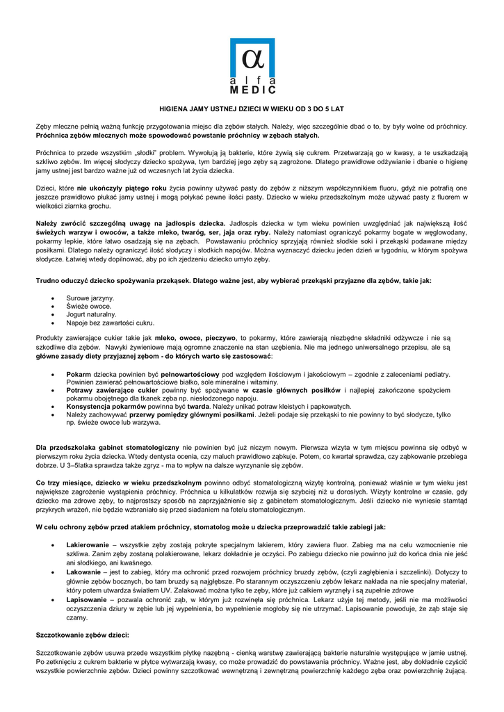 HIGIENA JAMY USTNEJ DZIECI W WIEKU OD 3 DO 5 LAT Zęby mleczne pełnią ważną funkcję przygotowania miejsc dla zębów stałych. Należy, więc szczególnie dbać o to, by były wolne od próchnicy. Próchnica zębów mlecznych może spowodować powstanie próchnicy w zębach stałych. Próchnica to przede wszystkim „słodki” problem. Wywołują ją bakterie, które żywią się cukrem. Przetwarzają go w kwasy, a te u szkadzają szkliwo zębów. Im więcej słodyczy dziecko spożywa, tym bardziej jego zęby są zagrożone. Dlatego prawidłowe odżywianie i dbanie o higienę jamy ustnej jest bardzo ważne już od wczesnych lat życia dziecka. Dzieci, które nie ukończyły piątego roku życia powinny używać pasty do zębów z niższym współczynnikiem fluoru, gdyż nie potrafią one jeszcze prawidłowo płukać jamy ustnej i mogą połykać pewne ilości pasty. Dziecko w wieku przedszkolnym może używać pasty z fluorem w wielkości ziarnka grochu. Należy zwrócić szczególną uwagę na jadłospis dziecka. Jadłospis dziecka w tym wieku powinien uwzględniać jak największą ilość świeżych warzyw i owoców, a także mleko, twaróg, ser, jaja oraz ryby. Należy natomiast ograniczyć pokarmy bogate w węglowodany, pokarmy lepkie, które łatwo osadzają się na zębach. Powstawaniu próchnicy sprzyjają również słodkie soki i przekąski podawane między posiłkami. Dlatego należy ograniczyć ilość słodyczy i słodkich napojów. Można wyznaczyć dziecku jeden dzień w tygodniu, w którym spożywa słodycze. Łatwiej wtedy dopilnować, aby po ich zjedzeniu dziecko umyło zęby. Trudno oduczyć dziecko spożywania przekąsek. Dlatego ważne jest, aby wybierać przekąski przyjazne dla zębów, takie jak: Surowe jarzyny. Świeże owoce. Jogurt naturalny. Napoje bez zawartości cukru. Produkty zawierające cukier takie jak mleko, owoce, pieczywo, to pokarmy, które zawierają niezbędne składniki odżywcze i nie są szkodliwe dla zębów. Nawyki żywieniowe mają ogromne znaczenie na stan uzębienia. Nie ma jednego uniwersalnego przepisu, ale są główne zasady diety przyjaznej zębom - do których warto się zastosować: Pokarm dziecka powinien być pełnowartościowy pod względem ilościowym i jakościowym – zgodnie z zaleceniami pediatry. Powinien zawierać pełnowartościowe białko, sole mineralne i witaminy. Potrawy zawierające cukier powinny być spożywane w czasie głównych posiłków i najlepiej zakończone spożyciem pokarmu obojętnego dla tkanek zęba np. niesłodzonego napoju. Konsystencja pokarmów powinna być twarda. Należy unikać potraw kleistych i papkowatych. Należy zachowywać przerwy pomiędzy głównymi posiłkami. Jeżeli podaje się przekąski to nie powinny to być słodycze, tylko np. świeże owoce lub warzywa. Dla przedszkolaka gabinet stomatologiczny nie powinien być już niczym nowym. Pierwsza wizyta w tym miejscu powinna się odbyć w pierwszym roku życia dziecka. Wtedy dentysta ocenia, czy maluch prawidłowo ząbkuje. Potem, co kwartał sprawdza, czy ząbkowanie przebiega dobrze. U 3–5latka sprawdza także zgryz - ma to wpływ na dalsze wyrzynanie się zębów. Co trzy miesiące, dziecko w wieku przedszkolnym powinno odbyć stomatologiczną wizytę kontrolną, ponieważ właśnie w tym wieku jest największe zagrożenie wystąpienia próchnicy. Próchnica u kilkulatków rozwija się szybciej niż u dorosłych. Wizyty kontrolne w czasie, gdy dziecko ma zdrowe zęby, to najprostszy sposób na zaprzyjaźnienie się z gabinetem stomatologicznym. Jeśli dziecko nie wyniesie stamtąd przykrych wrażeń, nie będzie wzbraniało się przed siadaniem na fotelu stomatologicznym. W celu ochrony zębów przed atakiem próchnicy, stomatolog może u dziecka przeprowadzić takie zabiegi jak: Lakierowanie – wszystkie zęby zostają pokryte specjalnym lakierem, który zawiera fluor. Zabieg ma na celu wzmocnienie nie szkliwa. Zanim zęby zostaną polakierowane, lekarz dokładnie je oczyści. Po zabiegu dziecko nie powinno już do końca dnia nie jeść ani słodkiego, ani kwaśnego. Lakowanie – jest to zabieg, który ma ochronić przed rozwojem próchnicy bruzdy zębów, (czyli zagłębienia i szczelinki). Dotyczy to głównie zębów bocznych, bo tam bruzdy są najgłębsze. Po starannym oczyszczeniu zębów lekarz nakłada na nie specjalny materiał , który potem utwardza światłem UV. Zalakować można tylko te zęby, które już całkiem wyrznęły i są zupełnie zdrowe Lapisowanie – pozwala ochronić ząb, w którym już rozwinęła się próchnica. Lekarz użyje tej metody, jeśli nie ma możliwości oczyszczenia dziury w zębie lub jej wypełnienia, bo wypełnienie mogłoby się nie utrzymać. Lapisowanie powoduje, że ząb staje się czarny. Szczotkowanie zębów dzieci: Szczotkowanie zębów usuwa przede wszystkim płytkę nazębną - cienką warstwę zawierającą bakterie naturalnie występujące w jamie ustnej. Po zetknięciu z cukrem bakterie w płytce wytwarzają kwasy, co może prowadzić do powstawania próchnicy. Ważne jest, aby dokładnie czyścić wszystkie powierzchnie zębów. Dzieci powinny szczotkować wewnętrzną i zewnętrzną powierzchnię każdego zęba oraz powierzchnię żującą. Dzieci powinny szczotkować zęby, co najmniej dwa razy dziennie: szczególnie rano po śniadaniu oraz wieczorem przed pójściem spać. W nocy wydzielanie śliny neutralizującej płytkę nazębną jest obniżone, przez co zęby stają się bardziej wrażliwe na rozwój próc hnicy. Dlatego szczotkowanie zębów przed spaniem jest tak ważne. Prawidłowe szczotkowanie. Dobrze jest, jeżeli do ukończenia 5 roku życia dziecko myje zęby pod opieką rodzica, który stosuje się do poniższych wskazówek: Nałóż na szczoteczkę odrobinę (tj. porcję odpowiadającą wielkości ziarnka groc hu) fluorkowej pasty do zębów. Uważaj, aby dziecko nie połykało pasty. Przy pomocy szczoteczki o najpierw szczotkuj wewnętrzne po