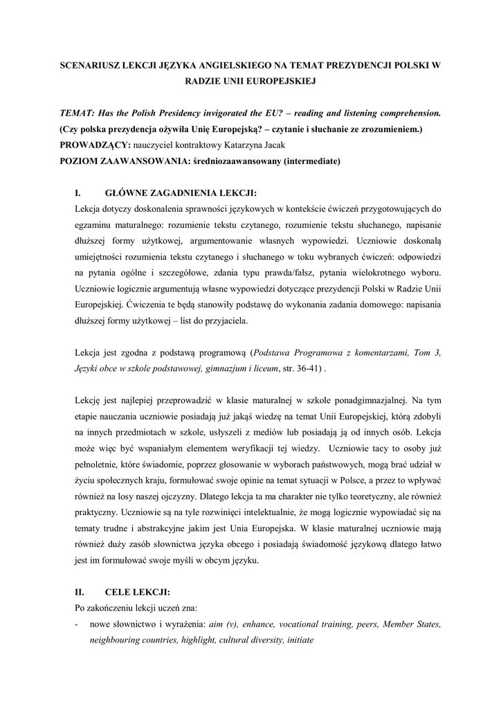 SCENARIUSZ LEKCJI JĘZYKA ANGIELSKIEGO NA TEMAT PREZYDENCJI POLSKI W RADZIE UNII EUROPEJSKIEJ TEMAT: Has the Polish Presidency invigorated the EU? – reading and listening comprehension. (Czy polska prezydencja ożywiła Unię Europejską? – czytanie i słuchanie ze zrozumieniem.) PROWADZĄCY: nauczyciel kontraktowy Katarzyna Jacak POZIOM ZAAWANSOWANIA: średniozaawansowany (intermediate) I. GŁÓWNE ZAGADNIENIA LEKCJI: Lekcja dotyczy doskonalenia sprawności językowych w kontekście ćwiczeń przygotowujących do egzaminu maturalnego: rozumienie tekstu czytanego, rozumienie tekstu słuchanego, napisanie dłuższej formy użytkowej, argumentowanie własnych wypowiedzi. Uczniowie doskonalą umiejętności rozumienia tekstu czytanego i słuchanego w toku wybranych ćwiczeń: odpowiedzi na pytania ogólne i szczegółowe, zdania typu prawda/fałsz, pytania wielokrotnego wyboru. Uczniowie logicznie argumentują własne wypowiedzi dotyczące prezydencji Polski w Radzie Unii Europejskiej. Ćwiczenia te będą stanowiły podstawę do wykonania zadania domowego: napisania dłuższej formy użytkowej – list do przyjaciela. Lekcja jest zgodna z podstawą programową (Podstawa Programowa z komentarzami, Tom 3, Języki obce w szkole podstawowej, gimnazjum i liceum, str. 36-41) . Lekcję jest najlepiej przeprowadzić w klasie maturalnej w szkole ponadgimnazjalnej. Na tym etapie nauczania uczniowie posiadają już jakąś wiedzę na temat Unii Europejskiej, którą zdobyli na innych przedmiotach w szkole, usłyszeli z mediów lub posiadają ją od innych osób. Lekcja może więc być wspaniałym elementem weryfikacji tej wiedzy. Uczniowie tacy to osoby już pełnoletnie, które świadomie, poprzez głosowanie w wyborach państwowych, mogą brać udział w życiu społecznych kraju, formułować swoje opinie na temat sytuacji w Polsce, a przez to wpływać również na losy naszej ojczyzny. Dlatego lekcja ta ma charakter nie tylko teoretyczny, ale również praktyczny. Uczniowie są na tyle rozwinięci intelektualnie, że mogą logicznie wypowiadać się na tematy trudne i abstrakcyjne jakim jest Unia Europejska. W klasie maturalnej uczniowie mają również duży zasób słownictwa języka obcego i posiadają świadomość językową dlatego łatwo jest im formułować swoje myśli w obcym języku. II. CELE LEKCJI: Po zakończeniu lekcji uczeń zna: - nowe słownictwo i wyrażenia: aim (v), enhance, vocational training, peers, Member States, neighbouring countries, highlight, cultural diversity, initiate - techniki pracy z tekstem czytanym i słuchanym: odpowiedzi na pytania ogólne i szczegółowe, zdania typu prawda/fałsz, pytania wielokrotnego wyboru - strukturę napisania dłuższej formy użytkowej – list do przyjaciela Po zakończeniu lekcji uczeń potrafi: - poprawnie stosować nowe słownictwo i wyrażenia - pracować z tekstem czytanym i słuchanym w toku ćwiczeń przygotowujących do matury pisemnej: odpowiedzi na pytania ogólne i szczegółowe, zdania typu prawda/fałsz, pytania wielokrotnego wyboru - napisać dłuższą formę użytkową – list do przyjaciela - wypowiadać się na temat prezydencji polski w Radzie Unii Europejskiej - korzystać z Internetu III. METODY PRACY: Lekcje te dobrze jest przeprowadzić według podejścia komunikacyjnego, a więc połączenia różnych metod: metody konwersacyjnej – włączanie ucznia do uczestnictwa w rozmowach toczących się w języku obcym, metody kognitywnej – przyswajanie języka przez ucznia ma charakter innowacyjny, twórczy, prawo do błędów, metody naturalnej – nauczanie zbliżonej do naturalnej formy komunikacji, wyeliminowanie stresu. IV. - ŚRODKI DYDAKTYCZNE: kserokopia fragmentu Programu polskiej prezydencji w Radzie Unii Europejskiej wraz z autorskimi ćwiczeniami zaczerpnięta ze strony http://pl2011.eu/sites/default/files/users/shared/o_prezydencja/programme_of_the_polish_pres idency_of_the_council_of_the_eu.pdf - film wideo zaczerpnięty ze strony http://tvnewsroom.consilium.europa.eu/event/polish-eu-presidency/inauguration-of-the-polishpresidency-celebrations-part-7/ - CD z fragmentem Ody do radości - karta pracy przygotowana przez nauczyciela – dłuższa forma użytkowa (list do przyjaciela - strona internetowa nauczyciela (www.kjacak.u2.pl) - strony internetowe słowników www.ldoceonline.pl) - tablica interaktywna/rzutnik językowych (www.ling.pl, www.megaslownik.pl, V. PRZEBIEG LEKCJI: a) WPROWADZENIE: - nauczyciel puszcza uczniom płytę CD z fragmentem Ody do radości i prosi uczniów o rozpoznanie melodii (nauczyciel - uczniowie). Uczniowie odgadują tytuł słyszanej melodii. Nauczyciel podaje uczniom angielski odpowiednik Ody do radości (Ode to Joy). Następnie nauczyciel zadaje uczniom pytania (nauczyciel - uczniowie): 1. Who composed Ode to Joy? 2. How old is it? 3. What organization does it symbolise? - uczeń zapisuje temat lekcji na tablicy. Nauczyciel omawia problematykę lekcji oraz jej cel. - uczniowie wykonują test interaktywny na temat podstawowych informacji o polskiej prezydencji w Radzie Unii Europejskiej (praca indywidualna) (www.kjacak.u2.pl, zakładka test ze słownictwa → test 1). Następnie uczniowie porównują swoje odpowiedzi (praca w parach). - uczniowie sprawdzają ćwiczenie z kluczem, analiza ćwiczenia. Nauczyciel nagradza uczniów, którzy wykonali ćwiczenie poprawnie. Uczniowie otrzymują oceny za aktywność. b) ROZWINIĘCIE: ROZUMIENIE TEKSTU CZYTANEGO - nauczyciel rozdaje uczniom fragmenty Programu polskiej prezydencji w Radzie Unii Europejskiej wraz z ćwiczeniami (KARTA PRACY 1). Następnie podaje uczniom podstawowe informacje na temat tego programu.. - uczniowie przez minutę analizują otrzymany tekst. Nauczyciel zadaje ogólne pytania dotyczące tekstu (nauczyciel - uczniowie): 1. How is the text divided? 2. What section is it about? 3. What documents are mentioned in the article? 4. Are there any non-EU countries mentioned in the article? 5. What is the 