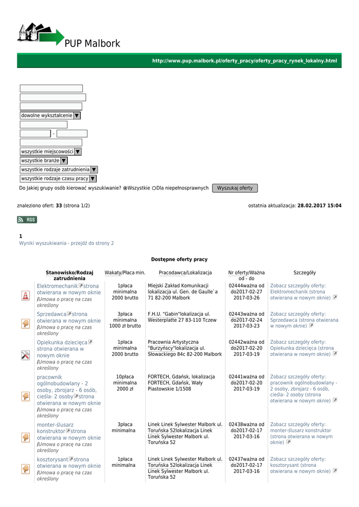 PUP Malbork http://www.pup.malbork.pl/oferty_pracy/oferty_pracy_rynek_lokalny.html Ukryj wyszukiwarke dowolne wykształcenie ▼ wszystkie miejscowości ▼ wszystkie branże ▼ wszystkie rodzaje zatrudnienia ▼ wszystkie rodzaje czasu pracy ▼ Do Jakiej grupy osób kierować wyszukiwanie? Wszystkie Dla niepełnosprawnych Wyszukaj oferty znaleziono ofert: 33 (strona 1/2) ostatnia aktualizacja: 28.02.2017 15:04 1 Wyniki wyszukiwania - przejdź do strony 2 Dostępne oferty pracy Stanowisko/Rodzaj zatrudnienia Wakaty/Płaca min. Pracodawca/Lokalizacja Nr oferty/Ważna od - do 02444ważna od do2017-02-27 2017-03-26 Elektromechanik strona otwierana w nowym oknie /Umowa o pracę na czas 1płaca minimalna 2000 brutto Miejski Zakład Komunikacji lokalizacja ul. Gen. de Gaulle`a 71 82-200 Malbork 3płaca minimalna 1000 zł brutto Szczegóły Zobacz szczegóły oferty: Elektromechanik (strona otwierana w nowym oknie) F.H.U. "Gabin"lokalizacja ul. Westerplatte 27 83-110 Tczew 02443ważna od do2017-02-24 2017-03-23 Zobacz szczegóły oferty: Sprzedawca (strona otwierana w nowym oknie) 1płaca minimalna 2000 brutto Pracownia Artystyczna "Burzyńscy"lokalizacja ul. Słowackiego 84c 82-200 Malbork 02442ważna od do2017-02-20 2017-03-19 Zobacz szczegóły oferty: Opiekunka dziecięca (strona otwierana w nowym oknie) 10płaca minimalna 2000 zł FORTECH, Gdańsk, lokalizacja FORTECH, Gdańsk, Wały Piastowskie 1/1508 02441ważna od do2017-02-20 2017-03-19 Zobacz szczegóły oferty: pracownik ogólnobudowlany 2 osoby, zbrojarz - 6 osób, cieśla- 2 osoby (strona otwierana w nowym oknie) 3płaca minimalna Linek Linek Sylwester Malbork ul. Toruńska 52lokalizacja Linek Linek Sylwester Malbork ul. Toruńska 52 02438ważna od do2017-02-17 2017-03-16 Zobacz szczegóły oferty: monter-ślusarz konstruktor (strona otwierana w nowym oknie) 1płaca minimalna Linek Linek Sylwester Malbork ul. Toruńska 52lokalizacja Linek Linek Sylwester Malbork ul. Toruńska 52 02437ważna od do2017-02-17 2017-03-16 Zobacz szczegóły oferty: kosztorysant (strona otwierana w nowym oknie) określony Sprzedawca strona otwierana w nowym oknie /Umowa o pracę na czas określony Opiekunka dziecięca strona otwierana w nowym oknie /Umowa o pracę na czas określony pracownik ogólnobudowlany - 2 osoby, zbrojarz - 6 osób, cieśla- 2 osoby strona otwierana w nowym oknie /Umowa o pracę na czas określony monter-ślusarz konstruktor strona otwierana w nowym oknie /Umowa o pracę na czas określony kosztorysant strona otwierana w nowym oknie /Umowa o pracę na czas określony Stanowisko/Rodzaj zatrudnienia sprzedawca - 3 osoby strona otwierana w nowym oknie /Umowa o pracę na czas Wakaty/Płaca min. Nr oferty/Ważna od - do 02436ważna od do2017-02-17 2017-03-16 Szczegóły Zobacz szczegóły oferty: sprzedawca - 3 osoby (strona otwierana w nowym oknie) 3płaca minimalna PHU Małgorzata Osuchowska Malbork ul. Starościńska 1 lokalizacja PHU Małgorzata Osuchowska Malbork ul. Starościńska 1 2płaca minimalna Linek Linek Sylwester Malbork lokalizacja Linek Linek Sylwester Malbork 02435ważna od do2017-02-16 2017-03-07 Zobacz szczegóły oferty: sprzedawca (strona otwierana w nowym oknie) 3płaca minimalna Linek Linek Sylwester Malbork telefon 502248030 [email protected] Linek Linek Sylwester Malbork telefon 502248030 [email protected] 02434ważna od do2017-02-16 2017-03-07 Zobacz szczegóły oferty: ślusarz-spawacz (strona otwierana w nowym oknie) 3płaca minimalna Linek Linek Sylwester Malbork lokalizacja Linek Linek Sylwester Malbork 02433ważna od do2017-02-16 2017-03-07 Zobacz szczegóły oferty: pomocnik spawacza (strona otwierana w nowym oknie) 2płaca minimalna E. Jackiewicz, Siedemnastka Malbork, ul. Sprzymierzonych 119lokalizacja E. Jackiewicz, Siedemnastka Malbork, ul. Sprzymierzonych 119 02432ważna od do2017-02-16 2017-03-15 Zobacz szczegóły oferty: sprzedawca (strona otwierana w nowym oknie) 1płaca minimalna Fabax Malbork ul. Koszykowa 32 608498529lokalizacja Fabax Malbork ul. Koszykowa 32 608498529 02431ważna od do2017-02-15 2017-03-14 Zobacz szczegóły oferty: ślusarz spawacz (strona otwierana w nowym oknie) 1płaca minimalna Fabax Malbork ul. Koszykowa 32 lokalizacja Fabax Malbork ul. Koszykowa 32 02430ważna od do2017-02-15 2017-03-14 Zobacz szczegóły oferty: pracownik działu technologii produkcji (strona otwierana w nowym oknie) 1płaca minimalna Oferta zamknięta. Dostępna dla osób bezrobotnych zarejestrowanych w tutejszym 02429ważna od do2017-02-15 2017-03-14 Zobacz szczegóły oferty: Elektryk (strona otwierana w nowym oknie) 02428ważna od do2017-02-15 2017-03-14 Zobacz szczegóły oferty: Operator maszyn (strona otwierana w nowym oknie) określony sprzedawca strona otwierana w nowym oknie /Umowa o pracę na czas Pracodawca/Lokalizacja określony ślusarz-spawacz strona otwierana w nowym oknie /Umowa o pracę na czas określony pomocnik spawacza strona otwierana w nowym oknie /Umowa o pracę na czas określony sprzedawca strona otwierana w nowym oknie /Umowa o pracę na czas określony ślusarz spawacz strona otwierana w nowym oknie /Umowa o pracę na czas określony pracownik działu technologii produkcji strona otwierana w nowym oknie /Umowa o pracę na czas określony Elektryk strona otwierana w nowym oknie /Umowa o pracę na czas określony Operator maszyn strona otwierana w nowym oknie /Umowa o pracę na czas urzędzie 1płaca minimalna określony tokarz-fezer strona otwierana w nowym oknie /Umowa na okres próbny operator maszyn strona otwierana w nowym oknie /Umowa na okres próbny mechanik-- ślusarz strona otwierana w nowym oknie /Umowa na okres próbny Pracownik produkcji zwierzęcej strona otwierana w nowym oknie /Umowa o pracę na czas urzędzie określony lokalizacja Malbork 1płaca minimalna Prino-Plast Sp. z o.o, JV Malbork, Al. Wojska Polskiego 48 lokalizacja Prino-Plast Sp. z o.o, JV Malbork, Al. Wojska Polskiego 48 02427ważna od do2017-02-15 2017-03-13 Zobacz szczegóły oferty: toka