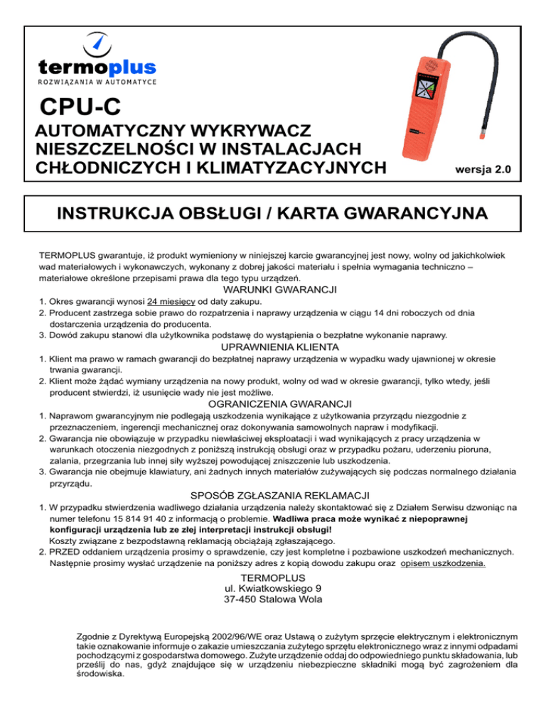 CPU-C AUTOMATYCZNY WYKRYWACZ NIESZCZELNOŚCI W INSTALACJACH CHŁODNICZYCH I KLIMATYZACYJNYCH wersja 2.0 INSTRUKCJA OBSŁUGI / KARTA GWARANCYJNA TERMOPLUS gwarantuje, iż produkt wymieniony w niniejszej karcie gwarancyjnej jest nowy, wolny od jakichkolwiek wad materiałowych i wykonawczych, wykonany z dobrej jakości materiału i spełnia wymagania techniczno – materiałowe określone przepisami prawa dla tego typu urządzeń. WARUNKI GWARANCJI 1. Okres gwarancji wynosi 24 miesięcy od daty zakupu. 2. Producent zastrzega sobie prawo do rozpatrzenia i naprawy urządzenia w ciągu 14 dni roboczych od dnia dostarczenia urządzenia do producenta. 3. Dowód zakupu stanowi dla użytkownika podstawę do wystąpienia o bezpłatne wykonanie naprawy. UPRAWNIENIA KLIENTA 1. Klient ma prawo w ramach gwarancji do bezpłatnej naprawy urządzenia w wypadku wady ujawnionej w okresie trwania gwarancji. 2. Klient może żądać wymiany urządzenia na nowy produkt, wolny od wad w okresie gwarancji, tylko wtedy, jeśli producent stwierdzi, iż usunięcie wady nie jest możliwe. OGRANICZENIA GWARANCJI 1. Naprawom gwarancyjnym nie podlegają uszkodzenia wynikające z użytkowania przyrządu niezgodnie z przeznaczeniem, ingerencji mechanicznej oraz dokonywania samowolnych napraw i modyfikacji. 2. Gwarancja nie obowiązuje w przypadku niewłaściwej eksploatacji i wad wynikających z pracy urządzenia w warunkach otoczenia niezgodnych z poniższą instrukcją obsługi oraz w przypadku pożaru, uderzeniu pioruna, zalania, przegrzania lub innej siły wyższej powodującej zniszczenie lub uszkodzenia. 3. Gwarancja nie obejmuje klawiatury, ani żadnych innych materiałów zużywających się podczas normalnego działania przyrządu. SPOSÓB ZGŁASZANIA REKLAMACJI 1. W przypadku stwierdzenia wadliwego działania urządzenia należy skontaktować się z Działem Serwisu dzwoniąc na numer telefonu 15 814 91 40 z informacją o problemie. Wadliwa praca może wynikać z niepoprawnej konfiguracji urządzenia lub ze złej interpretacji instrukcji obsługi! Koszty związane z bezpodstawną reklamacją obciążają zgłaszającego. 2. PRZED oddaniem urządzenia prosimy o sprawdzenie, czy jest kompletne i pozbawione uszkodzeń mechanicznych. Następnie prosimy wysłać urządzenie na poniższy adres z kopią dowodu zakupu oraz opisem uszkodzenia. TERMOPLUS ul. Kwiatkowskiego 9 37-450 Stalowa Wola Zgodnie z Dyrektywą Europejską 2002/96/WE oraz Ustawą o zużytym sprzęcie elektrycznym i elektronicznym takie oznakowanie informuje o zakazie umieszczania zużytego sprzętu elektronicznego wraz z innymi odpadami pochodzącymi z gospodarstwa domowego. Zużyte urządzenie oddaj do odpowiedniego punktu składowania, lub prześlij do nas, gdyż znajdujące się w urządzeniu niebezpieczne składniki mogą być zagrożeniem dla środowiska. 1. INFORMACJE OGÓLNE. Wykrywacz nieszczelności CPU-C jest przeznaczonydo diagnozowania nieszczelności w instalacjach chłodniczych, klimatyzacjach samochodowych oraz domowych urządzeniach chłodniczych. Pozwala precyzyjnie określić miejsce i wielkość nieszczelności, a elastyczna końcówka, pozwala badać miejsca trudno dostępne. 2. ZASTOSOWANIE. Wykrywacz przeznaczony jest do diagnozowania nieszczelności w instalacjach chłodniczych, klimatyzacjach samochodowych oraz domowych urządzeniach chłodniczych. Pozwala precyzyjnie określić miejsce i wielkość nieszczelności, a elastyczna końcówka, pozwala badać miejsca trudno dostępne. Wykrywa między innymi: + chlorowcowęglowodory CFC: np. R12, R11, R500, R503 + chlorofluorowęglowodory HCFC: np. R22, R123, R124, R502 + fluoropochodne węglowodorów HFC np. R134a, R404a, R125 + mieszanki takie, jak AZ-50. HP62. MP39 itd… + tlenek etylu w szpitalnym wyposażeniu do sterylizacji (wykryje gaz nośny zawierający halogeny). + SF-6 w wyłącznikach obwodów wysokiego napięcia + większość gazów zawierających chlor, fluor i brom (gazy halogenowe) + środki czyszczące używane do czyszczenia na sucho, jak np. perchloroetylen. 3. WŁAŚCIWOŚCI MIERNIKA. ? automatyczne dostosowanie pomiarów do warunków otoczenia ? 7 poziomów czułości ? wysoka czułość pozwalająca wykryć nieszczelność już od 3gr/rok ? wykrywanie WSZYSTKICH czynników chłodniczych oraz ich mieszanin ? wbudowana pompka mechaniczna zapewniająca skuteczny przepływ powietrza przez końcówkę pomiarową co skraca czas pomiaru ? 6-punktowa skala LED wizualizująca poziom nieszczelności ? solidna i odporna na wilgoć i zanieczyszczenia klawiatura membranowa ? trójkolorowy wskaźnik napięcia baterii ? bezprzewodowy i przenośny, działa na 2 alkaiczne baterie R14 ? elastyczna nierdzewna sonda o długości 35,5 cm ? estetyczna walizka z trzema zamiennymi końcówkami pomiarowymi w komplecie ? dwuletnia gwarancja 1 4. RYSUNEK POGLĄDOWY MIERNIKA oraz FUNKCJE KLAWISZY 1. Końcówka pomiarowa (czujnik) 2. Osłona czujnika 3. Wyłącznik zasilania 4. Klawisz RESET 5. Klawisz “Zwiększ czułość” 6. Klawisz “Zmniejsz czułość” 7. 7-punktowa skala wskaźników LED 8. Elastyczna sonda 5. DANE TECHNICZNE Zestaw CPU-C zawiera: ? miernik nieszczelności ? walizka pomiarowa ? 2 dodatkowe końcówki pomiarowe (czujniki) ? 2 baterie alkaiczne ? instrukcja obsługi ? karta gwarancyjna Dane użytkowe: ? Obudowa: odporna na wysokie skażenia otoczenia ? Wymiary: 22,9 x 6,5 x 6,5 cm ? Długość sondy pomiarowej: 35,5cm ? Waga: 560 g ? Zakres temperatury pracy: 0...+52°C Dane techniczne: ? Zasilanie: 3VDC (2 baterie alkaiczne R14) ? Żywotność baterii: minimum 30 godzin nieprzerwanej pracy ? Żywotność końcówki pomiarowej: minimum 20 godzin ? Czułość nieszczelności: poniżej 3gr/rok dla wszystkich czynników CFC/HCFC/HFC. ? Cykl pracy: ciągły, bez ograniczeń ? Czas reakcji: natychmiastowy ? Czas powrotu do stanu początkowego: dwie sekundy 2 6. ZASADA DZIAŁANIA MIERNIKA CPU-C CPU-C jest miernikiem do badania nieszczelności w instalacjach chłodni