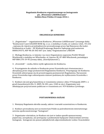 RegulaminKonkursuorganizowanegonaInstagramie pn.„WiosenneLAKIERowanie” GoldenRosePolska24maja2016r. §1 ORGANIZACJAKONKURSU 1.„Organizator”–organizatoremKonkursu„WiosenneLAKIEowanie”(zwanegodalej: “Konkursem”)jestGOLDENROSESp.zo.o.zsiedzibąwŁodzi,ul.Lodowa126A,93-232 ,wpisanadorejestruprzedsiębiorcówprowadzonegoprzezSądRejonowydlaŁodziŚródmieściawŁodzi–XXWydziałKrajowegoRejestruSądowegopodnumerem 0000139375,NIP98-20-302-667(zw.dalej“Organizatorem”)REGON 2.ObsługęKonkursu,wimieniuinarzeczOrganizatorazapewniaPLAN2Witold WasilewskizsiedzibąweWłocławku,ul.Lipowa2E,87-800Włocławek,posiadająca NIP888-270-19-95(zwanydalej:„Koordynatorem”). 3.„Uczestnik”–osoba,którawyślezgłoszeniedoKonkursu. 4.PrzystąpieniedoudziałuwKonkursieprzezUczestnikajestrównoznacznez akceptacjąprzezniegopostanowieńRegulaminuKonkursu.PrzystępującdoKonkursu UczestnikzobowiązujesiędoprzestrzeganiapostanowieńRegulaminu.Naruszenie przezUczestnikategozobowiązaniastanowipodstawędowykluczeniaUczestnikaz Konkursu. 5.Konkursniejestgrąhazardowąwrozumieniuustawyzdnia19listopada2009r.o grachhazardowych(Dz.U.2009,Nr201,poz.1540zezm.).Organizatorjest składającymprzyrzeczeniepublicznewrozumieniuart.919KodeksuCywilnego. §2 POSTANOWIENIAOGÓLNE 1.NiniejszyRegulaminokreślazasady,zakresiwarunkiuczestnictwawKonkursie. 2.KonkursprowadzonyjestnaterytoriumPolskizapośrednictweminternetowego serwisuspołecznościowego“Instagram”. 3.Organizatoroświadcza,żeKonkursniejestwżadensposóbsponsorowany, popierany,zarządzany,anipowiązanyzpodmiotamibędącymiwłaścicielamiserwisu Instagram.InstagramnieponosijakiejkolwiekodpowiedzialnościwobecUczestników zaprzeprowadzenieKonkursu.Wszelkiedaneosobowewymaganeipowierzaneprzez UżytkownikówsąprzekazywaneOrganizatorowi,aniewłaścicielowiserwisuInstagram. ̨ WszelkieinformacjeoUczestnikuudostępnianelubzbieranewzwiązkuzKonkursem będąprzetwarzaneprzezOrganizatora,anieInstagram. 4.Konkursrozpoczynasięodmomentuogłoszeniazapośrednictwemserwisuwdniu 24maja2016rokugodzina15:00itrwadodnia26maja2016r.godzina23:59.Prace zgłoszonewtymokresieuprawniajądoubieganiasięonagrodękonkursową. 5.KonkursodbywasięnaterenieRzeczypospolitejPolskiej. 6.Konkursniejestprowadzonywcelachzarobkowych. §3 UCZESTNICYKONKURSU 1.WKonkursiemogąbraćudziałwszystkieosobyfizyczneprzebywającena terenieRzeczpospolitejPolskiej,któresąosobamipełnoletnimilubsąosobamipowyżej 13rokużycia,aponiżej18rokużycialubposiadającymiograniczonązdolnośćdo czynnościprawnych,aleposiadającymizgodęprzedstawicielaustawowegonaudziałw Konkursie(zwanedalej:„Uczestnikiem”)posiadającekontoosobistewserwisie Instagram,założoneiprowadzonezgodniezregulaminemserwisuInstagram(zwane dalej:„Kontem”). 2.UczestnikamiKonkursuniemogąbyćpracownicyiprzedstawicieleOrganizatora, Koordynatoraorazinnychpodmiotówbiorącychbezpośredniudziałwprzygotowaniui prowadzeniuKonkursunazlecenieOrganizatora.Wprzypadku,gdyOrganizator stwierdzi,żewrywalizacjikonkursowejbrałaudziałosobaniespełniającawarunków uczestnictwa,zostanieonawykluczonazKonkursuorazpozbawionaewentualnej NagrodywKonkursie. 3.UczestnikmożebraćudziałwKonkursiejedynieprzyużyciujednegoKonta. 4.UczestnikpodczastrwaniaKonkursumożeprzedstawićdowolnąilośćprac konkursowych. 5.UdziałwKonkursiejestcałkowiciedobrowolnyorazdarmowy. 6.BiorącudziałwKonkursie,Uczestnikzaświadcza,żejestjedynymautorem opublikowanejprzezsiebiepracykonkursowejiposiadapełneprawaautorskiedo wspomnianejpublikacji. 7.OsobyspełniająceopisanepowyżejwymaganiauczestnictwawKonkursiemogą przystąpićdoKonkursu,akażdezgłoszenieUczestnikadoKonkursunapowyższych warunkachokreślonychwRegulaminiebędziejednoznacznezfaktem,iżUczestnik zapoznałsięztreściąRegulaminuigoakceptuje. §4 PRZYZNAWANIENAGRÓD 1.WKonkursieprzyznanychzostanieprzezOrganizatora4(słownie:cztery) równorzędnenagrodywpostaci„GoldenBox”(zwanedalej:„GoldenBox”) GoldenBoxbędziezawierał: -5lakierówRichColor -SexyBlackMascara -PomadkaVelvetMatte -HighlighterStick 2.LaureaciKonkursuniemająprawadowymianyNagrodynanagrodęinnegorodzaju, aniżądaniawypłaceniaekwiwalentupieniężnegoNagrody.LaureatKonkursuniema prawadoprzeniesieniaprawadoNagrodynaosobytrzecie. 3.Wartośćwygranejwkonkursienagrodywolnajestodpodatkudochodowegoodosób fizycznychstosowniedotreściart21ust1pkt68ustawyopodatkudochodowymod osóbfizycznych. 4.JednemuUczestnikowiKonkursumożezostaćprzyznananiewięcejniżjedna Nagroda. 5.JeślinagrodaniezostaniewydanawKonkursiezprzyczynniezależnychod Organizatora,bądźtaka,codoktórejzwycięzcaKonkursuutraciprawozprzyczyn wskazanychwniniejszymRegulaminie,pozostaniedodyspozycjiOrganizatora. 6.Organizatorzastrzegamożliwośćzmianynagrody,jeśliprzyznaniejejbędzie niemożliwezprzyczynniezależnychodOrganizatora.WtymwypadkuOrganizator obowiązujesiędoprzyznanianagrodyowartościidentycznejlubzbliżonejdonagród wymienionychwyżej. §5 ZAŁOŻENIAKONKURSOWE 1.Uczestnikcelemudziałuwkonkursiewinien: a)obserwowaćkonto:PanLakier(tzn.miećlubzałożyćkontowserwisieInstagram, wyszukaćprofil„PanLakier”ikliknąć„obserwuj”), b)wykonaćzdjęciepaznokcipomalowanychlakieremmarkiGoldenRose c)zamieścićzdjęcienaswoimprofiluwserwisieInstagramorazoznaczyćje#PanLakier i#GoldenRosePolska. 2.Wszystkiezgłoszenia,zawierającetreściobraźliwelubobelżywe,naruszająceczyjeś prawaautorskie;zawierającetreścierotyczne,niecenzuralne,ośmieszające, nieprzyzwoite,naruszającepowszechnieakceptowanezasadymoralności,naruszające godnośćosobistą,nawiązaniadosymbolireligijnych,etnicznychlubrasowych,atakże zawierającetreścireklamująceproduktylubusługikonkurencyjnewstosunkudo produktówiusługoferowanychprzezOrganizatorazostanązniejusunięte. 3.WybierającZwycięzców,Organizatorbędziebrałpoduwagęwyłączniezdjęcia przesłanewregulaminowymczasieokreślonymw§1punkt4niniejszegoRegulaminu. 4.WybierającZwycięzców,Organizatorkierowaćsiębędzieo
