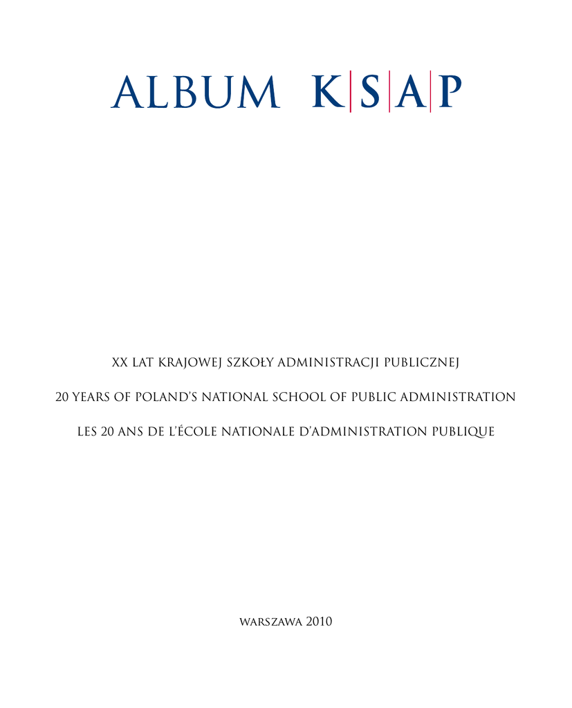 XX lat Krajowej Szkoły Administracji Publicznej 20 Years of Poland’s National School of Public Administration LES 20 ANS DE L’ÉCOLE NATIONALE D’ADMINISTRATION PUBLIQUE warszawa 2010 Opracowanie graficzne i skład: KotBury Opracowanie tekstu: Jolanta Florczak, Sebastian Szulfer Wybór zdjęć: Sebastian Szulfer Zdjęcia: archiwum KSAP archiwum PAP — str. 78, 90, 102, 130, 150, 162, 174, 216 i 236 http://commons.wikimedia.org (domena publiczna) — str. 140, 190, 202 i 226 Agnieszka Zabłocka — str. 231 Sebastian Szulfer — str: 239-241, 247-255 i 258-263 ISBN 978-83-61713-56-2 Krajowa Szkoła Administracji Publicznej ul. Wawelska 56 00-922 Warszawa tel. +48 22 60 80 100 www.ksap.gov.pl 1996 Konferencja „służba cywilna i etyKa w życiu Publicznym” Dyrektor KSAP z Premierem Włodzimierzem Cimoszewiczem 14–15 marca The Director of KSAP with Prime Minister Włodzimierz Cimoszewicz CONFERENCE ENTITLED “THE CIVIL Service and Ethics in the Public Life” La Directrice de la KSAP avec le Premier ministre Włodzimierz Cimoszewicz 14-15th March Conférence “la fonction publique et l’éthique dans la vie publique” 14-15 mars 60 Drugi dzień konferencji, za stołem prezydialnym od lewej: Z-ca Dyrektora KSAP Krzysztof Kiciński, Harry Swain – Kanada, Dyrektor KSAP, Christian Vigouroux – Francja, Howard Wilson – Kanada The second day of the Conference, at the presidential table, from left to right: Deputy Director of KSAP Krzysztof Kiciński, Harry Swain – Canada, Director of KSAP, Christian Vigouroux – France, Howard Wilson – Canada Deuxième jour de conférence, à la table du présidium, à partir de la gauche: Krzysztof Kiciński, Directeur adjoint de la KSAP, Harry Swain – Canada, la Directrice de la KSAP, Christian Vigouroux – France, Howard Wilson – Canada 61 1996 Promocja Sapere Aude Przekazanie Sztandaru KSAP (przekazują od lewej: Piotr Mück, Krzysztof Sajdak; przyjmują: Rafał Albiński, Piotr Śmiech) 11 kwietnia Graduation of The 4th year class Sapere Aude Handing over of the National School’s Banner (handing over, from left to right: Piotr Mück, Krzysztof Sajdak; accepting: Rafał Albiński, Piotr Śmiech) 11th April Promotion Sapere Aude 11 avril Remise du drapeau de la KSAP (à partir de la gauche: le remettent: Piotr Mück, Krzysztof Sajdak; le reçoivent: Rafał Albiński, Piotr Śmiech) 62 Najlepsi absolwenci Promocji „Sapere Aude”, od lewej: Piotr Miklis, Krzysztof Sajdak, Sławomir Kacprzak, Piotr Łysoń, Agnieszka Kita The best graduates of the “Sapere Aude” Year Class, from left to right: Piotr Miklis, Krzysztof Sajdak, Sławomir Kacprzak, Piotr Łysoń, Agnieszka Kita Les meilleurs élèves de la Promotion “Sapere Aude”, à partir de la gauche: Piotr Miklis, Krzysztof Sajdak, Sławomir Kacprzak, Piotr Łysoń, Agnieszka Kita 63 1996 Absolwenci IV Promocji (w kolejności alfabetycznej): The graduates of the 4th Year Class (in alphabetical order): Les diplômés de la IVème Promotion (par ordre alphabétique): Elżbieta Bieńkowska, Krzysztof Błaszczyk, Mirosław Broiło, Maria Budkus, Łukasz Burczyk, Marek Cynk, Wojciech Gruba, Zofia Janiszewska, Andrzej Januszewski, Andrzej Jarema, Anna Jarucka, Michał Jarucki, Sławomir Kacprzak, Marek Kalupa, Andrzej Kania, Agnieszka Kaźmierczak, Mariusz Kaźmierczak, Wojciech Kijowski, 64 Zbigniew Klepacki, Bogdan Klimaszewski, Maciej Kuczyński, Piotr Łuczka, Piotr Łysoń, Andrzej Malinowski, Iwona Marczyk-Stępniewska, Piotr Miklis, Piotr Mück, Małgorzata Nowicka, Małgorzata Paszkiewicz, Remigiusz Paszkiewicz, Jacek Pękacik, Wojciech Piech, Krzysztof Sajdak, Andrzej Sanderski, Jolanta Srebrakowska, Wiesław Starostka, Jolanta Stawska, Barbara Wadach, Grzegorz Wałdoch, Dariusz Wencel, Adam Wojczulis, Dorota Wojtaś-Szymańska, Przemysław Wyganowski, Marcin Zembaty, Paweł Zołoteńki, Izabela Żarczyńska 65 1996 VI inauguracja 4 września VI Inauguration 4th September VIème inauguration 4 septembre 66 Powitanie Premiera Portugalii Antónia Guterresa w KSAP Welcoming Prime Minister of Portugal, António Guterres to KSAP Accueil du Premier ministre du Portugal António Guterres à la KSAP 67 1996 Przemawia gość honorowy Premier Portugalii António Guterres The speech of the guest of honour – Prime Minister of Portugal, António Guterres Discours de l’invité d’honneur, António Guterres, Premier ministre du Portugal 68 Poczet sztandarowy KSAP, słuchacze: Jarosław Borowski, Rafał Albiński, Piotr Śmiech. Przemawia gość honorowy Prezydent RP Aleksander Kwaśniewski The KSAP Colour Party, students: Jarosław Borowski, Rafał Albiński, Piotr Śmiech. The speech of the guest of honour – Preident of the Polish Republic, Aleksander Kwaśniewski Garde au drapeau de la KSAP, les élèves: Jarosław Borowski, Rafał Albiński, Piotr Śmiech. Discours de l’invité d’honneur, Aleksander Kwaśniewski, Président de la République de Pologne 69 1996 70 sPotKanie z marszałKiem sejmu rP józefem zycHem 10 października The meeting with the Sejm Marshal, Mr. Józef Zych 10th October Rencontre avec Józef Zych, Maréchal du Sejm de la République de Pologne 10 octobre Dyrektor KSAP przedstawia pracowników i słuchaczy, od lewej: Danuta Żelewska – kier. Sekcji Studiów, Hanna Osińska-Kierzkowska – prac. Działu Kadr, Teresa Przybyłowicz – kier. hotelu, Leszek Suchorzewski – kier. Działu Języków Obcych, Jan Zieliński – Radca Prawny, oraz słuchacze I roku: Leszek Jeliński, Zuzanna Bębenek, Jarosław Wyszyński The Director introduces employees and students, from the left: Danuta Żelewska – Manager of the Studies Section, Hanna Osińska-Kierzkowska – employed in the HR Department, Teresa Przybyłowicz – Hotel manager, Leszek Suchorzewski – Head of the Foreign Languages Dept., Jan Zieliński – Legal Advisor, and first-year students: Leszek Jeliński, Zuzanna Bębenek and Jarosław Wyszyński La Directrice de la KSAP présente les empl