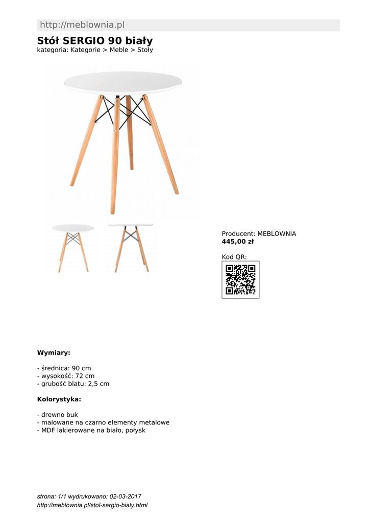 http://meblownia.pl Stół SERGIO 90 biały kategoria: Kategorie > Meble > Stoły Producent: MEBLOWNIA 445,00 zł Kod QR: Wymiary: - średnica: 90 cm - wysokość: 72 cm - grubość blatu: 2,5 cm Kolorystyka: - drewno buk - malowane na czarno elementy metalowe - MDF lakierowane na biało, połysk strona: 1/1 wydrukowano: 02-03-2017 http://meblownia.pl/stol-sergio-bialy.html