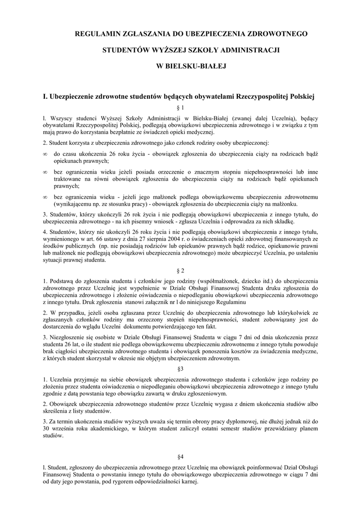 REGULAMIN ZGŁASZANIA DO UBEZPIECZENIA ZDROWOTNEGO STUDENTÓW WYśSZEJ SZKOŁY ADMINISTRACJI W BIELSKU-BIAŁEJ I. Ubezpieczenie zdrowotne studentów będących obywatelami Rzeczypospolitej Polskiej §1 l. Wszyscy studenci WyŜszej Szkoły Administracji w Bielsku-Białej (zwanej dalej Uczelnią), będący obywatelami Rzeczypospolitej Polskiej, podlegają obowiązkowi ubezpieczenia zdrowotnego i w związku z tym mają prawo do korzystania bezpłatnie ze świadczeń opieki medycznej. 2. Student korzysta z ubezpieczenia zdrowotnego jako członek rodziny osoby ubezpieczonej: • do czasu ukończenia 26 roku Ŝycia - obowiązek zgłoszenia do ubezpieczenia ciąŜy na rodzicach bądź opiekunach prawnych; • bez ograniczenia wieku jeŜeli posiada orzeczenie o znacznym stopniu niepełnosprawności lub inne traktowane na równi obowiązek zgłoszenia do ubezpieczenia ciąŜy na rodzicach bądź opiekunach prawnych; • bez ograniczenia wieku - jeŜeli jego małŜonek podlega obowiązkowemu ubezpieczeniu zdrowotnemu (wynikającemu np. ze stosunku pracy) - obowiązek zgłoszenia do ubezpieczenia ciąŜy na małŜonku. 3. Studentów, którzy ukończyli 26 rok Ŝycia i nie podlegają obowiązkowi ubezpieczenia z innego tytułu, do ubezpieczenia zdrowotnego - na ich pisemny wniosek - zgłasza Uczelnia i odprowadza za nich składkę. 4. Studentów, którzy nie ukończyli 26 roku Ŝycia i nie podlegają obowiązkowi ubezpieczenia z innego tytułu, wymienionego w art. 66 ustawy z dnia 27 sierpnia 2004 r. o świadczeniach opieki zdrowotnej finansowanych ze środków publicznych (np. nie posiadają rodziców lub opiekunów prawnych bądź rodzice, opiekunowie prawni lub małŜonek nie podlegają obowiązkowi ubezpieczenia zdrowotnego) moŜe ubezpieczyć Uczelnia, po ustaleniu sytuacji prawnej studenta. §2 1. Podstawą do zgłoszenia studenta i członków jego rodziny (współmałŜonek, dziecko itd.) do ubezpieczenia zdrowotnego przez Uczelnię jest wypełnienie w Dziale Obsługi Finansowej Studenta druku zgłoszenia do ubezpieczenia zdrowotnego i złoŜenie oświadczenia o niepodleganiu obowiązkowi ubezpieczenia zdrowotnego z innego tytułu. Druk zgłoszenia stanowi załącznik nr l do niniejszego Regulaminu 2. W przypadku, jeŜeli osoba zgłaszana przez Uczelnię do ubezpieczenia zdrowotnego lub którykolwiek ze zgłaszanych członków rodziny ma orzeczony stopień niepełnosprawności, student zobowiązany jest do dostarczenia do wglądu Uczelni dokumentu potwierdzającego ten fakt. 3. Niezgłoszenie się osobiste w Dziale Obsługi Finansowej Studenta w ciągu 7 dni od dnia ukończenia przez studenta 26 lat, o ile student nie podlega obowiązkowemu ubezpieczeniu zdrowotnemu z innego tytułu powoduje brak ciągłości ubezpieczenia zdrowotnego studenta i obowiązek ponoszenia kosztów za świadczenia medyczne, z których student skorzystał w okresie nie objętym ubezpieczeniem zdrowotnym. §3 1. Uczelnia przyjmuje na siebie obowiązek ubezpieczenia zdrowotnego studenta i członków jego rodziny po złoŜeniu przez studenta oświadczenia o niepodleganiu obowiązkowi ubezpieczenia zdrowotnego z innego tytułu zgodnie z datą powstania tego obowiązku zawartą w druku zgłoszeniowym. 2. Obowiązek ubezpieczenia zdrowotnego studentów przez Uczelnię wygasa z dniem ukończenia studiów albo skreślenia z listy studentów. 3. Za termin ukończenia studiów wyŜszych uwaŜa się termin obrony pracy dyplomowej, nie dłuŜej jednak niŜ do 30 września roku akademickiego, w którym student zaliczył ostatni semestr studiów przewidziany planem studiów. §4 l. Student, zgłoszony do ubezpieczenia zdrowotnego przez Uczelnię ma obowiązek poinformować Dział Obsługi Finansowej Studenta o powstaniu innego tytułu do obowiązkowego ubezpieczenia zdrowotnego w ciągu 7 dni od daty jego powstania, pod rygorem odpowiedzialności karnej. 2. W przypadku powstania innego tytułu do ubezpieczenia zdrowotnego Uczelnia ma obowiązek zaprzestania opłacania składek. co jest równoznaczne z wyrejestrowaniem ubezpieczonego studenta z ubezpieczenia zdrowotnego wraz ze zgłoszonymi przez niego członkami rodziny. 3. Z chwilą ustania innego tytułu do zgłoszenia do ubezpieczenia zdrowotnego, student moŜe zostać ponownie zgłoszony do ubezpieczenia zdrowotnego przez Uczelnię, po spełnieniu wymogów określonych w § 2 niniejszego Regulaminu. 4. W przypadku zbiegu tytułów do objęcia obowiązkiem ubezpieczenia zdrowotnego, gdy w ramach kaŜdego z tych tytułów składka finansowana jest z budŜetu państwa, składka jest opłacana wyłącznie z tytułu, który powstał najwcześniej. JeŜeli tytuły powstały równocześnie, składka jest opłacana z pierwszego zgłoszonego tytułu do objęcia ubezpieczeniem zdrowotnym. §5 l. Student, który został zgłoszony do ubezpieczenia zdrowotnego przez Uczelnię, ma obowiązek poinformować Dział Obsługi Finansowej Studenta o zmianie danych zawartych w formularzu zgłoszeniowym do ubezpieczenia zdrowotnego w ciągu 7 dni od daty powstania zmiany lub uzyskania dokumentu potwierdzającego ten fakt, pod rygorem odpowiedzialności karnej. 2. Do danych, o których mowa w ust. l naleŜą: numer dokumentu potwierdzającego toŜsamość, nazwisko, imię kod tytułu ubezpieczenia (tj. orzeczony stopień niepełnosprawności), adres zamieszkania, oddział Narodowego Funduszu Zdrowia. 3. Zmiany danych, o których mowa w ust. l. dokonuje się na przeznaczonych do tego celu formularzach, po przedstawieniu dokumentów potwierdzających ten fakt. §6 l. Prawo do świadczeń opieki zdrowotnej dla studentów wygasa po upływie 4 miesięcy od zakończenia nauki lub skreślenia z listy studentów. 2. Prawo do świadczeń opieki zdrowotnej dla członków rodziny studenta ustaje po upływie 30 dni od dnia wygaśnięcia obowiązku ubezpieczenia zdrowotnego. §7 l. Dokumentem potwierdzającym opłacanie składek za studenta przez Uczelnię jest wypełniony dokument RMUA (wystarczający jest dol