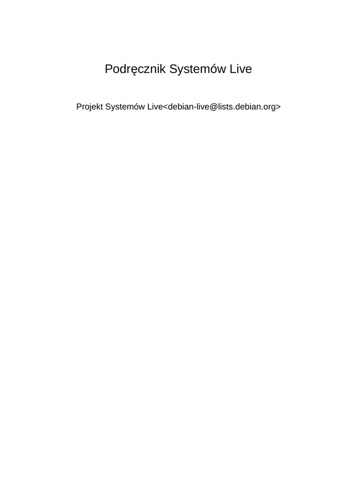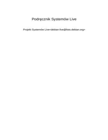 Podręcznik Systemów Live Projekt Systemów Live<[email protected]> Copyright © 2006-2015 Projekt Systemów Live Ten program jest wolnym oprogramowaniem: możesz go rozprowadzać dalej i / lub modyfikować zgodnie z warunkami Powszechnej Licencji Publicznej GNU opublikowanej przez Free Software Foundation, według wersji 3 tej Licencji lub (według Twojego wyboru) dowolnej późniejszej wersji Ten program jest rozpowszechniany w nadziei, że będzie użyteczny, ale BEZ JAKIEJKOLWIEK GWARANCJI; bez nawet domyślnej gwarancji PRZYDATNOŚCI HANDLOWEJ albo PRZYDATNOŚCI DO OKREŚLONYCH ZASTOSOWAŃ. Patrz GNU General Public License aby uzyskać więcej szczegółów. Powinieneś otrzymać kopię Licencji GNU General Public License wraz z tym programem. Jeśli nie, odwiedź ‹http://www.gnu.org/licenses/›. Pełny tekst licencji GNU General Public można znaleźć w pliku /usr/share/commonlicenses/GPL-3. ii Contents Contents O tym podręczniku 2 O tym podręczniku 3 1. O tym podręczniku 1.1 Dla niecierpliwych . . . . . . . . . . . 1.2 Definicje . . . . . . . . . . . . . . . . . 1.3 Autorzy . . . . . . . . . . . . . . . . . 1.4 Wnoszenie wkładu do tego dokumentu 1.4.1 Nanoszenie zmian . . . . . . . 1.4.2 Tłumaczenie . . . . . . . . . . . . . . . . . . . . . . . . . . . . . . . . . . . . . . . . . . . . . . . . . . . . . . . . . . . . . . . . . . . . . . . . . . . . . . . . . . . . . . . . . . . . . . . . . . . . . . . . . . . . . . . . . . . . . . . . . . . . O Live Systems Project 3 3 4 5 5 6 7 9 2. O Live Systems Project 2.1 Motywacja . . . . . . . . . . . . . . . . . . . . . . . . . . . . . 2.1.1 Co jest nie tak w moim dotychczasowym systemie live? 2.1.2 Czemu tworzyć nasz własny system live? . . . . . . . 2.2 Filozofia . . . . . . . . . . . . . . . . . . . . . . . . . . . . . . 2.2.1 Tylko niezmienione pakiety z działu Debian “main” . . 2.2.2 Bez konfiguracji pakietów systemu live . . . . . . . . . 2.3 Kontakt . . . . . . . . . . . . . . . . . . . . . . . . . . . . . . . . . . . . . . . . . . . . . . . . . . . . . . . . . . . . . . . . . . . . . . . 9 9 9 9 10 10 10 10 Użytkownik 11 Instalacja 12 3. Instalacja 3.1 Wymagania . . . . . . . . . . . . 3.2 Instalowanie live-build . . . . . . 3.2.1 Z repozytorium Debiana . 3.2.2 Ze źródła . . . . . . . . . 3.2.3 Ze zrzutów deweloperskich 3.3 Instalowanie live-boot i live-config 3.3.1 Z repozytorium Debiana . 3.3.2 Ze źródła . . . . . . . . . 3.3.3 Ze zrzutów deweloperskich 12 12 12 12 12 13 13 13 14 15 . . . . . . . . . . . . . . . . . . . . . . . . . . . . . . . . . . . . . . . . . . . . . . . . . . . . . . . . . . . . . . . . . . . . . . . . . . . . . . . . . . . . . . . . . . . . . . . . . . . . . . . . . . . . . . . . . . . . . . . . . . . . . . . . . . . . . . . . . . . . . . . . . . . . . . . . . . . . . . . . . . . . . . . . . . . . . . . . . . . . . . . . . . . . . . . . . . . . iii Contents Podstawy 16 4. Podstawy 4.1 Co to jest system live? . . . . . . . . . . . . . . . . . . . . . 4.2 Pobieranie prekompilowanych obrazów . . . . . . . . . . . 4.3 Using the web live image builder . . . . . . . . . . . . . . . 4.3.1 Używanie i przestrogi dotyczące Web buildera . . . 4.4 Pierwsze kroki: budowanie obrazu ISO-hybrydy . . . . . . . 4.5 Korzystanie z hybrydowego obrazu ISO live . . . . . . . . . 4.5.1 Wypalanie obrazu ISO na fizycznym nośniku . . . . 4.5.2 Kopiowanie obrazu ISO-hybrydy na nośnik USB . . 4.5.3 Wykorzystanie przestrzeni pozostałej na nośniku USB 4.5.4 Uruchamianie nośnika live . . . . . . . . . . . . . . . 4.6 Używanie wirtualnej maszyny do testowania . . . . . . . . . 4.6.1 Testowanie obrazu ISO z użyciem QEMU . . . . . . 4.6.2 Testowanie obrazu ISO z użyciem VirtualBox’a . . . 4.7 Budowanie i używanie obrazu HDD . . . . . . . . . . . . . . 4.8 Budowanie obrazu netboot . . . . . . . . . . . . . . . . . . 4.8.1 Serwer DHCP . . . . . . . . . . . . . . . . . . . . . . 4.8.2 Serwer TFTP . . . . . . . . . . . . . . . . . . . . . . 4.8.3 Serwer NFS . . . . . . . . . . . . . . . . . . . . . . . 4.8.4 Netboot testing HowTo . . . . . . . . . . . . . . . . . 4.8.5 Qemu . . . . . . . . . . . . . . . . . . . . . . . . . . 4.9 Webbooting . . . . . . . . . . . . . . . . . . . . . . . . . . . 4.9.1 Getting the webboot files . . . . . . . . . . . . . . . . 4.9.2 Uruchamianie obrazów webboot . . . . . . . . . . . 16 16 17 17 17 18 19 19 19 19 20 20 21 21 22 23 24 25 25 25 26 26 26 27 . . . . . . . . . . . . . . . . . . . . . . . . . . . . . . . . . . . . . . . . . . . . . . . . . . . . . . . . . . . . . . . . . . . . . . . . . . . . . . . . . . . . . . . . . . . . . . . . . . . . . . . . . . . . . . . . . . . . . . . . . . . . . . . . . . . . . . . . . . . . . . . . . . . . . . . . . . . . . . . . Przegląd narzędzi 28 5. Przegląd narzędzi 5.1 Pakiet live-build . . . . . 5.1.1 Polecenie lb config 5.2 Wcięcia . . . . . . . . . 5.2.1 Polecenie lb build 5.2.2 Polecenie lb clean 5.3 Pakiet live-boot . . . . . 5.4 Pakiet live-config . . . . 28 28 28 29 29 29 30 30 . . . . . . . . . . . . . . . . . . . . . . . . . . . . . . . . . . . . . . . . . . . . . . . . . . . . . . . . . . . . . . . . . . . . . . . . . . . . . . . . . . . . . . . . . . . . . . . . . . . . . . . . . . . . . . . . . . . . . . . . . . . . . . . . . . . . . . . . . . . . . . . . . . . . . . . . . . . . . . . . . . . . . . . . . . . . . . . . . . . . . . . . . . . Zarządzanie konfiguracją 31 6. Zarządzanie konfiguracją 6.1 Radzenie sobie ze zmianami konfiguracji . . . . . . . . . . . . . . . . . 6.1.1 Czemu używać automatycznych skryptów? Co one robią? . . . . 31 31 31 iv Contents 6.1.2 Użyj przykładowych automatycznych skryptów . . . . . . . . . . 6.2 Klonowanie konfiguracji opublikowanej przez Git . . . . . . . . . . . . . 31 32 Dostosowywanie zawartości 34 7. Opis dostosowywania 7.1 Konfiguracja podczas kompilacji vs. podczas uruchamiania systemu . . 7.2 Etapy kompilacji . . . . . . . . . . . . . . . . . . . . . . . . . . . .