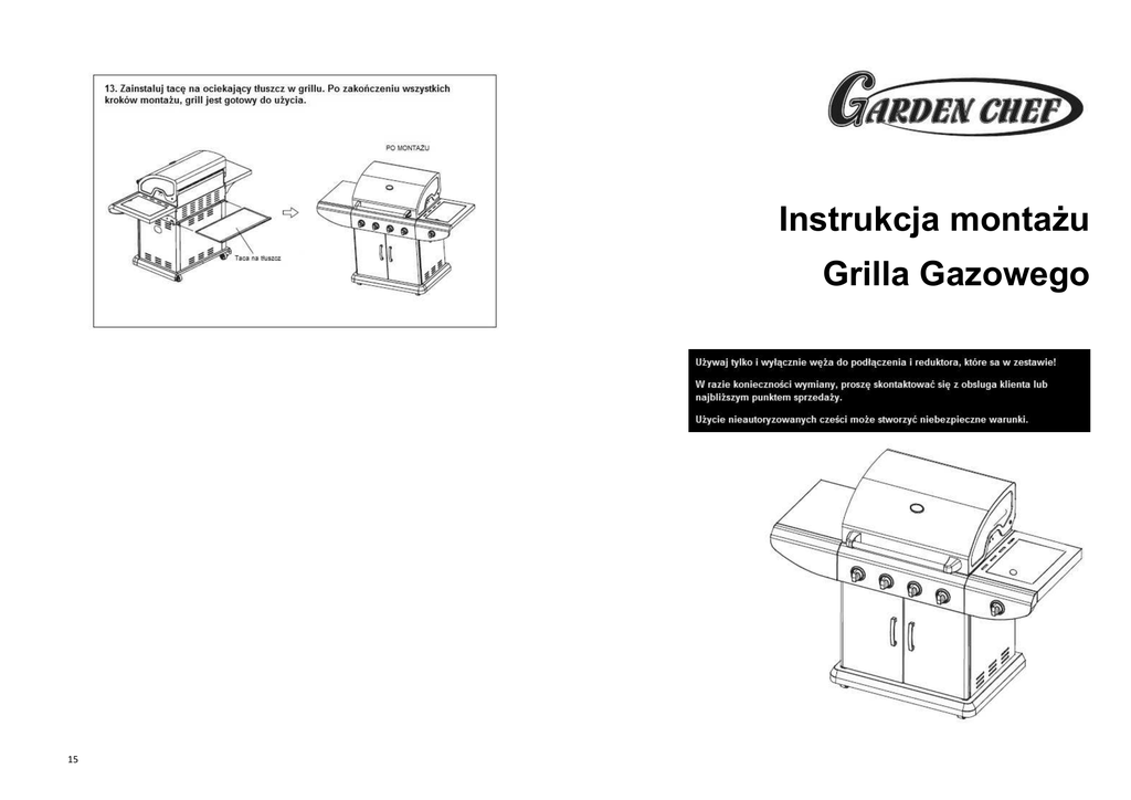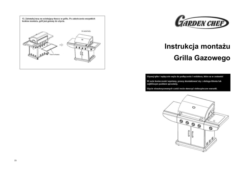 Instrukcja montażu Grilla Gazowego 15 KOD URZĄDZENIA CAŁKOWITA MOC CIEPLNA FH824103, FH824101 15.5 kW (1106 g/h) (WSZYSTKIE KATEGORIE GAZU) KATEGORIA GAZU: I3+(28-30/37) RODZAJE GAZU: BUTAN CIŚNIENIE GAZU 28-30 mbar ROZMIAR WTRYSKU: 0.89 mm dla grilla KOD IDENTYFIKACYJNY: 359BT848 I3B/P(30) PROPAN 37 mbar MIESZANKI GAZU LPG 30 mbar 0.89 mm dla grilla NUMER SERYJNY KOD DATY Urządzenie kod-08-0000000 DO UŻYTKU NA ZEWNĄTRZ I W DOBRZE WENTYLOWANYCH POMIESZCZENIACH UWAGA: CZĘŚCI MOGĄ BYĆ BARDZO GORĄCE TRZYMAJ DZIECI W BEZPIECZNEJ ODLEGLOŚCI OD GRILLA PRZED UŻYCIEM URZĄDZENIA ZAPOZNAJ SIĘ Z INSTRUKCJĄ KOD URZĄDZENIA FH824103, FH824101 CAŁKOWITA MOC CIEPLNA 15.5 kW (1106g/h) (WSZYSTKIE KATEGORIE GAZU) KATEGORIA GAZU: I3B/P(36) TYP GAZU: MIESZANKI GAZU LPG CIŚNIENIE GAZU: ROZMIAR WTRYSKU: 36 mbar 0.81 mm dla grilla KOD IDENTYFIKACYJNY: 0.85 mm dla bocznego palnika 359BT848 NUMER SERYJNY KOD DATY Urządzenie kod-08-0000000 DO UŻYTKU NA ZEWNĄTRZ I W DOBRZE WENTYLOWANYCH POMIESZCZENIACH UWAGA: CZEŚCI GRILLA MOGĄ BYĆ BARDZO GORĄCE TRZYMAJ DZIECI W BEZPIECZNEJ ODLEGŁOŚCI OD GRILLA PRZED UŻYCIEM URZĄDZENIA ZAPOZNAJ SIĘ Z INSTRUKCJĄ Zakręć zawór butli z gazem lub zamknij reduktor po użyciu. Użycie tego urządzenia w zamkniętych pomieszczeniach może być niebezpieczne i jest ZABRONIONE. Zapłon: 1.5 Volt bateria jest źródłem wieloiskrowego zapłonu na palniki. 1. Otwórz pokrywę przed próba zapalenia grilla. 1 14 2. Przed próba zapalenia bocznego palnika otwórz jego pokrywę. 3. Garnki/rondle pomiędzy 15cm a 22cm musza być używane wyłącznie na bocznym palniku. UWAGA: Ślady na pokrywie to olej zabezpieczający stal nierdzewną, można użyć suchej szmatki, aby je wytrzeć. WAŻNE: Przeczytaj uważnie następujące instrukcje i upewnij się że grill jest odpowiednio zmontowany, zainstalowany i zadbany. Nie zastosowanie się do tych instrukcji może doprowadzić do poważnego uszkodzenia ciała i/lub zniszczenia rzeczy znajdujących się w pobliżu grilla. Jeżeli masz jakiekolwiek pytania odnośnie złożenia lub używania grilla, skontaktuj się z sprzedawcą. W trakcie użytku grill gazowy oraz butla gazowa musza być postawione na płaskim podłożu. Twój grill może być używany z butlami gazowymi od 11kg do 15kg. Grill przystosowany jest do spalania gazu propan/butan w proporcji 50/50. PODŁĄCZENIE BUTLI GAZOWEJ DO GRILLA Butla gazowa musi być umieszczona z tylnej lewej strony urządzenia, nie pod bocznym palnikiem. Nie wolno umieszczać butli w szafce urządzenia. Grill przystosowany jest do pracy przy użyciu niskiego ciśnienia butanu lub propanu oraz mieszanek LPG, podłączonych przez odpowiedni reduktor i giętki wąż. Wąż powinien być zabezpieczony objemkami metalowymi przy grillu i przy reduktorze. Ten grill pracuje przy użyciu gazu propan/butan o ciśnieniu 36 mbar. REDUKTOR I WĄŻ Używaj wyłącznie reduktora i węża zatwierdzonego do użycia przy gazie propan/butan i przy odpowiednim ciśnieniu. Reduktor nie powinien być używany przez okres dłuższy niż 10 lat od daty produkcji. Zaleca się wymianę reduktora do 10 lat od daty produkcji. Użycie niewłaściwego reduktora lub węża jest niebezpieczne; zawsze upewnij się że masz odpowiednie części przed montażem i użyciem grilla. Wąż musi spełniać normy kraju, w którym jest używany. Długość węża powinna wynosić maksymalnie 1.5 m. Uszkodzony lub zużyty wąż należy wymienić. Upewnij się że wąż nie jest w żadnym miejscu zagięty i że nie dotyka żadnego elementu grilla z wyjątkiem podłączenia. PRZECHOWYWANIE URZĄDZENIA Przechowywanie grilla wewnątrz jest dozwolone jedynie, kiedy butla jest odłączona i usunięta z urządzenia. Kiedy grill nie będzie używany przez dłuższy okres czasu, powinien być przechowywany w oryginalnym opakowaniu w suchym niezakurzonym miejscu. 13 2 BUTLA GAZOWA Z butlą gazowa należy obchodzić się ostrożnie, nie należy jej upuścić! Jeżeli butla nie jest w użyciu, powinna być odłączona. Butle gazowe powinny być przechowywane na zewnątrz, w stojącej pozycji i poza zasięgiem dzieci. Nie wolno przechowywać butli w miejscu, gdzie temperatura może osiągnąć 50C. Nie trzymaj butli blisko płomieni lub innych źródeł zapłonu. NIE PAL w pobliżu butli. Ustaw butle jak najdalej od grilla po prawej stronie bez naciągania węża. Ten grill jest zaprojektowany do użytku na zewnątrz, z dala od łatwopalnych materiałów. Ważne jest przestrzeganie powyższych zaleceń. Minimalny dystans pomiędzy tyłem i bokiem grilla a innym przedmiotem to 1 m. Wentylacyjne otwory w grillu nie mogą być uszkodzone. Grill powinien stać na stabilnym podłożu. Grill nie powinien być wystawiany na bezpośrednie działanie słońca i deszczu. Nie wolno modyfikować żadnych części grilla, a wszystkie naprawy i serwis powinny być przeprowadzane przez osobę posiadającą odpowiednie kwalifikacje. Podłączenie do Urządzenia Przed podłączeniem upewnij się że w butli gazowej, reduktorze, palniku i na częściach palnika nie ma żadnych odłamków. Pająki i inne insekty mogą zagnieżdżać się i blokować otwór palnika. Zapchanie palnika może doprowadzić do pożaru pod urządzeniem. Czyść otwory palnika czyszczącym płynem do rur. Podłącz wąż do urządzenia kluczem do nakrętek, aby zacisnąć go wokół przyłącza. Jeżeli wąż jest wymieniany, musi być zabezpieczony przy grillu i reduktorze objemkami. Odłącz reduktor od butli (zgodnie z wskazówkami załączonymi do reduktora), kiedy grill jest nieużywany. Grill musi być używany w dobrze wentylowanym miejscu. Przepływ spalanego powietrza do palnika w trakcie użytku grilla musi być bezproblemowy. TEN GRIL JEST WYŁĄCZNIE DO UŻYTKU ZEWNĘTRZNEGO. PRZED UŻYCIEM UPEWNIJ SIĘ ŻE NIE MA ŻADNYCH WYCIEKÓW Przy sprawdzaniu nie używaj płomienia, zawsze używaj roztworu wody z mydłem 3 12 SPRAWDZENIE WYCIEKÓW Aby sprawdzić czy urządzenie