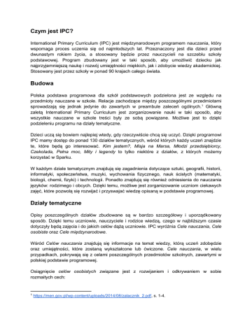 Czym jest IPC? International Primary Curriculum (IPC) jest międzynarodowym programem nauczania, który wspomaga proces uczenia się od najmłodszych lat. Przeznaczony jest dla dzieci przed dwunastym rokiem życia, a stosowany będzie przez nauczycieli na szczeblu szkoły podstawowej. Program zbudowany jest w taki sposób, aby umożliwić dziecku jak najprzyjemniejszą naukę i rozwój umiejętności miękkich, jak i zdobycie wiedzy akademickiej. Stosowany jest przez szkoły w ponad 90 krajach całego świata. Budowa Polska podstawa programowa dla szkół podstawowych podzielona jest ze względu na przedmioty nauczane w szkole. Relacje zachodzące między poszczególnymi przedmiotami sprowadzają się jednak jedynie do zawartych w preambule zaleceń ogólnych.1 Główną zaletą International Primary Curriculum jest zorganizowanie nauki w taki sposób, aby wszystkie nauczane w szkole treści były ze sobą powiązane. Możliwe jest to dzięki podzieleniu programu na działy tematyczne. Dzieci uczą się bowiem najlepiej wtedy, gdy rzeczywiście chcą się uczyć. Dzięki programowi IPC mamy dostęp do ponad 130 działów tematycznych, wśród których każdy uczeń znajdzie te, które będą go interesować. Kim jestem?, Misja na Marsa, Młodzi przedsiębiorcy, Czekolada, Pełna moc, Mity i legendy to tylko niektóre z działów, z których możemy korzystać w Sparku. W każdym dziale tematycznym znajdują się zagadnienia dotyczące sztuki, geografii, historii, informatyki, społeczeństwa, muzyki, wychowania fizycznego, nauk ścisłych (matematyki, biologii, chemii, fizyki) i technologii. Ponadto znajdują się również odniesienia do nauczania języków: rodzimego i obcych. Dzięki temu, możliwe jest zorganizowanie uczniom ciekawych zajęć, które pozwolą się rozwijać i przyswajać wiedzę opisaną w podstawie programowej. Działy tematyczne Opisy poszczególnych działów zbudowane są w bardzo szczegółowy i uporządkowany sposób. Dzięki temu uczniowie, nauczyciele i rodzice wiedzą, czego w najbliższym czasie dotyczyły będą zajęcia i do jakich celów dążą uczniowie. IPC wyróżnia Cele nauczania, Cele osobiste oraz Cele międzynarodowe. Wśród Celów nauczania znajdują się informacje na temat wiedzy, którą uczeń zdobędzie oraz umiejętności, które zostaną wykształcone lub ćwiczone. Cele nauczania, w wielu przypadkach, pokrywają się z celami poszczególnych przedmiotów szkolnych, zawartymi w polskiej podstawie programowej. Osiągnięcie celów osobistych związane jest z rozwijaniem i odkrywaniem w sobie rozmaitych cech: 1 https://men.gov.pl/wp-content/uploads/2014/08/zalacznik_2.pdf, s. 1-4. ● ● ● ● ● ● ● ● Wnikliwości. (Zadawanie pytań, pomocnych w zdobywaniu wiedzy oraz wykorzystywanie ich w jak najlepszy sposób. Wyciąganie wniosków na podstawie otrzymanych odpowiedzi i odnoszenie ich do szerszej perspektywy.) Elastyczności. (Umiejętność odnalezienia się w niesprzyjającej sytuacji i zaproponowanie oraz przyjęcie nowych ról, pomysłów i strategii. Poruszanie w obszarach nieszablonowego myślenia i wykorzystywanie go w różnych sytuacjach.) Konsekwencji. (Wykonywanie przedsięwziętych zadań do końca. Umiejętność radzenia sobie z porażką i podjęcia kolejnej próby.) Moralności. (Znajomość problemów moralnych, pojawiających się przy omawianym zagadnieniu oraz akceptowanie odmiennych standardów moralnych. Możliwość rozwoju osobistego i zmiany poglądów oraz poparcia swoich zachowań.) Komunikatywności. (Umiejętność swobodnego wyrażania myśli i komunikacji przy pomocy różnych narzędzi. Znajomość więcej niż jednego języka oraz umiejętność komunikacji z szerszym gronem zróżnicowanych odbiorców.) Refleksji. (Odnajdywanie problemów w procesie kształcenia oraz używanie różnych technik rozwiązywania napotkanych problemów. Umiejętność wyciągania wniosków i odnoszenia ich do własnego życia. Świadomość i rozwój swoich zalet oraz zrozumienie i wyeliminowanie wad.) Otwartości. (Znajomość i umiejętność wykorzystania różnych punktów widzenia, kultur i tradycji oraz zrozumienie różnych postaw ludzkich. Umiejętność zaadaptowania się do sytuacji w oparciu o potrzeby grupy.) Szacunku. (Zrozumienie potrzeb innych ludzi, istot żywych oraz środowiska naturalnego. Okazywanie szacunku ludziom, zwierzętom i naturze oraz działanie w oparciu o ich potrzeby.) Różne działy wymagają zaangażowania w różnych dziedzinach. Pojawiać się będą tematy, realizowane przez 6 do 8 tygodni, które stawiają nacisk na nauki ścisłe, a zagadnienia z zakresu sztuki pomijają. Analogicznie jednak, inne kilkutygodniowe działy skupiać się będą na historii i sztuce, a pomijają zagadnienia z nauk ścisłych. Umożliwia to całkowite skupienie na danym zagadnieniu, bez obowiązku przechodzenia na kolejnych lekcjach z jednego tematu na inny. Aby w pełni zrealizować zagadnienia zawarte w polskiej podstawie programowej, oprócz zajęć realizowanych w ramach IPC, organizowane będą również spotkania, które pomogą uczniom posiąść wiedzę niezbędną do przejścia na kolejny etap edukacji. Spotkania prowadzone będą jednak w duchu i przy wsparciu IPC. Sposób pracy 1. Wstęp - każdy dział tematyczny wprowadzony będzie w atrakcyjny dla ucznia sposób. Pierwsze spotkanie z tematem powinno ucznia zaciekawić i sprawić, że chętnie będzie uczestniczył w kolejnych spotkaniach. Wprowadzenie może zająć godzinę, dwie, cały dzień lub nawet cały tydzień, w zależności od wieku i potrzeb uczniów. 2. Zbieranie plonów - kolejnym etapem jest sprawdzenie jak dużo o omawianym temacie już wiedzą uczniowie. Może się zdarzyć, że podczas Misji na Marsa objawi nam się uczeń, który jest bardzo zainteresowany kosmosem i będzie mógł w znaczny sposób pomóc innym uczniom. Zbieranie plonów jest pomocne dla dalszego planowania działań i pozwala zaoszczędzić czas,