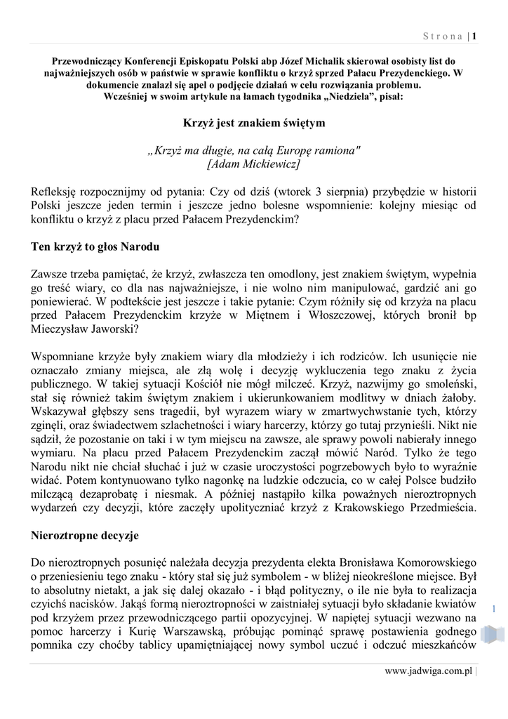 Strona |1 Przewodniczący Konferencji Episkopatu Polski abp Józef Michalik skierował osobisty list do najważniejszych osób w państwie w sprawie konfliktu o krzyż sprzed Pałacu Prezydenckiego. W dokumencie znalazł się apel o podjęcie działań w celu rozwiązania problemu. Wcześniej w swoim artykule na łamach tygodnika „Niedziela”, pisał: Krzyż jest znakiem świętym „Krzyż ma długie, na całą Europę ramiona" [Adam Mickiewicz] Refleksję rozpocznijmy od pytania: Czy od dziś (wtorek 3 sierpnia) przybędzie w historii Polski jeszcze jeden termin i jeszcze jedno bolesne wspomnienie: kolejny miesiąc od konfliktu o krzyż z placu przed Pałacem Prezydenckim? Ten krzyż to głos Narodu Zawsze trzeba pamiętać, że krzyż, zwłaszcza ten omodlony, jest znakiem świętym, wypełnia go treść wiary, co dla nas najważniejsze, i nie wolno nim manipulować, gardzić ani go poniewierać. W podtekście jest jeszcze i takie pytanie: Czym różniły się od krzyża na placu przed Pałacem Prezydenckim krzyże w Miętnem i Włoszczowej, których bronił bp Mieczysław Jaworski? Wspomniane krzyże były znakiem wiary dla młodzieży i ich rodziców. Ich usunięcie nie oznaczało zmiany miejsca, ale złą wolę i decyzję wykluczenia tego znaku z życia publicznego. W takiej sytuacji Kościół nie mógł milczeć. Krzyż, nazwijmy go smoleński, stał się również takim świętym znakiem i ukierunkowaniem modlitwy w dniach żałoby. Wskazywał głębszy sens tragedii, był wyrazem wiary w zmartwychwstanie tych, którzy zginęli, oraz świadectwem szlachetności i wiary harcerzy, którzy go tutaj przynieśli. Nikt nie sądził, że pozostanie on taki i w tym miejscu na zawsze, ale sprawy powoli nabierały innego wymiaru. Na placu przed Pałacem Prezydenckim zaczął mówić Naród. Tylko że tego Narodu nikt nie chciał słuchać i już w czasie uroczystości pogrzebowych było to wyraźnie widać. Potem kontynuowano tylko nagonkę na ludzkie odczucia, co w całej Polsce budziło milczącą dezaprobatę i niesmak. A później nastąpiło kilka poważnych nieroztropnych wydarzeń czy decyzji, które zaczęły upolityczniać krzyż z Krakowskiego Przedmieścia. Nieroztropne decyzje Do nieroztropnych posunięć należała decyzja prezydenta elekta Bronisława Komorowskiego o przeniesieniu tego znaku - który stał się już symbolem - w bliżej nieokreślone miejsce. Był to absolutny nietakt, a jak się dalej okazało - i błąd polityczny, o ile nie była to realizacja czyichś nacisków. Jakąś formą nieroztropności w zaistniałej sytuacji było składanie kwiatów pod krzyżem przez przewodniczącego partii opozycyjnej. W napiętej sytuacji wezwano na pomoc harcerzy i Kurię Warszawską, próbując pominąć sprawę postawienia godnego pomnika czy choćby tablicy upamiętniającej nowy symbol uczuć i odczuć mieszkańców www.jadwiga.com.pl | 1 Strona |2 Warszawy i Polski, co podkopało jeszcze zaufanie do całej sprawy. Każde działanie ukrywające prawdziwe intencje musi w tym kraju budzić podejrzenia, bo to jest nasze dziedzictwo i nasza wewnętrzna siła, bo oszukiwano nas od wieków. I sprawujący władzę muszą o tym pamiętać. Ten krzyż to nasza pamięć Krzyż „smoleński" - jego znaczenie można zrozumieć na prostym przykładzie krzyża pogrzebnego, na którym jest nazwisko i data śmierci żegnanej osoby. Wszyscy wiedzą, że to tylko symbol, znak oznaczający wydarzenie czy miejsce spoczynku. Na tym miejscu bliscy z czasem budują pomnik albo grobowiec, a krzyż zostaje przeniesiony w inne miejsce lub w sposób godny - zniszczony. W tym przypadku krzyż należało uszanować i w taki sposób zastąpić, aby nie było po nim pustki. Wcześniej jednak trzeba koniecznie dać społeczeństwu do zrozumienia, że ci, których pamięć przypomina, są szanowani i wszystkim nam drodzy. Bo to była elita Narodu, która udawała się nie byle gdzie i nie po byle co - ale do Katynia, aby uczcić zadeptywaną pamięć niewinnie wymordowanych, z którymi od dziesięcioleci utożsamia się cały Naród. Czy wolno lekceważyć i ośmieszać ujawnione emocje? Nie wolno, zanim się nie odczyta głębokiego ich znaczenia [...] Za przykładem krzyża Roku Świętego W 1983 r. obchodzony był w całym Kościele Rok Święty dla podkreślenia 1950. rocznicy śmierci Pana Jezusa, czyli naszego Odkupienia. W Bazylice św. Piotra w Rzymie umieszczono z tej okazji zwykły, drewniany krzyż. Po zakończeniu Roku Świętego uznano, że trzeba wrócić do poprzedniego stanu, ale co zrobić z krzyżem? Przecież tysiące pielgrzymów modliło się przed nim przez cały rok. Z pomysłem zgłosiła się do Papieskiej Rady ds. Laikatu grupa młodzieży z Centro s. Lorenzo: są gotowi przejąć krzyż Roku Świętego, jeśli Papież go im przekaże, i pójść z nim do młodzieży różnych krajów w ramach przygotowań do Światowych Dni Młodzieży. Ten krzyż wędruje do dziś po świecie, gromadzi na modlitwie młodzież, jest symbolem zaufania do młodych Jana Pawła II, który go im powierzył. A może i krzyż z Krakowskiego Przedmieścia w Warszawie mógłby stać się ożywczym symbolem szacunku dla ofiar Katynia: tych z roku 1940 i tych z roku 2010, którzy nie zdołali im oddać hołdu w 70. rocznicę mordu. Przecież w Katyniu ma powstać kaplica sanktuarium pamięci ofiar. Ale taką decyzję - każdą decyzję w ważnych sprawach - można podejmować po rozważnej konsultacji, refleksji w duchu szczerości i prawdy. Z tłumem się nie dyskutuje - powie mędrzec. Tak, ale Narodu się nie lekceważy. W rytm życia Narodu i w rytm jego serca trzeba się pokorniej wsłuchiwać. Abp Józef Michalik Artykuł można przeczytać w „Niedzieli” nr 33/2010 www.jadwiga.com.pl | 2