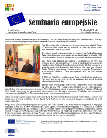 chc Seminaria europejskie 5. seminarium koordynator: Joanna Różycka-Thiriet 18 listopada 2015 roku [email protected] Seminarium 18 listopada poświęcone było stosunkom między Unią Europejską i Turcją. Naszymi gośćmi była Pinar Elman z Polskiego Instytutu Stosunków Międzynarodowych i Karol Wasilewski z Centrum Inicjatyw Międzynarodowych. Pinar Elman stwierdziła, że to zawsze przyjemność rozmawiać o relacjach TurcjaUE. W ostatnich latach temat tureckiej akcesji nie był zbyt gorący. Raczej mówiło się o partnerstwie. Teraz to się zmienia. Oczywiście z powodu kryzysu uchodźców czy pojawienia się Państwa Islamskiego Turcja i Unia Europejska mają wspólne tematy. Zanim jednak analityczka PISM zajęła się kwestiami bieżącymi, przypomniała o początkach relacji turecko-unijnych. Obie strony łączą obopólne zobowiązania i współzależności. W 1963 roku podpisano umowę stowarzyszeniową. To jedna z najstarszych umów zawartych przez Europejską Wspólnotę Gospodarczą (poprzedniczkę UE). Bez wchodzenia w szczegóły, porozumienie to zawierało jasne polityczne cele – stopniową integrację Turcji z EWG oraz coraz głębsza integrację wewnątrz europejską. To powtarzano w późniejszych traktatach z Turcją podpisywanych przez wszystkie państwa członkowskie. W 1999 roku Rada UE w Helsinkach uznała Turcję za kandydata do członkostwa. Przy czym kraj ten ma wejść do Unii na podstawie tych samych kryteriów członkostwa co inni kandydaci. Zdaniem Karola Wasilewskiego, kiedy mówimy o członkostwie Turcji w UE, trzeba się cofnąć do roku 1959 – wtedy państwo to złożyło wniosek o stowarzyszenie. Jego efektem była wspomniana umowa z Ankary z 1963, której podstawą prawną były przepisy zawarte w Traktacie o EWG. Już wtedy istniało ograniczenie, że stowarzyszenie zarezerwowane jest dla krajów europejskich. Podpisując takie porozumienie potwierdzono europejskość Turcji. Dla przypomnienia stowarzyszenia odmówiono Maroku. Jednak naprawdę wszystko zaczęło się od modernizacji Turcji. Turecka republika zbudowana została na kemalizmie, a jej celem było dołączenie do cywilizacji zachodniej. Tak więc dążenie Turcji do UE ma nie tylko uzasadnienie polityczne, gospodarcze, ale to też kwestia tożsamości. Kolejna część spotkania dotyczyła negocjacji akcesyjnych, jakie Turcja prowadzi z Unią. Karol Wasilewski przypomniał, że negocjacje rozpoczęto w 2005 roku, a ostatni rozdział otwarto w 2013. Ogółem, dotychczas otwarto negocjacje w 14 rozdziałach, a w jednym zamknięto. Część rozdziałów jest zamrożona, co jest konsekwencją problemu cypryjskiego (sam Cypr blokuje 6 rozdziałów). Zarówno kanclerz Niemiec Angela Merkel, jak i prezydent Francji Nicolas Sarkozy nie należeli do zwolenników członkostwa Turcji w UE. Preferowali strategiczne partnerstwo z Turcją. François Hollande miał zmienić francuskie podejście, ale tak się nie stało. Wydaje się, iż teraz istnieje szansa na przyspieszenie negocjacji, co związane jest np. z kryzysem uchodźców. Działania Fundacji Schumana są współfinansowane przez Unię Europejską, w ramach Programu Europa dla Obywateli Seminaria objęte są patronatem Przedstawicielstwa Komisji Europejskiej w Polsce Turcy zwracają uwagę, że skoro proces akcesji rozpoczęto, to trzeba go dokończyć. Ale z drugiej strony np. poprzedni prezydent Abdullah Gül mówił, że zamknięcie negocjacji nie oznacza automatycznie wejścia do Unii - może sama Turcja będzie chciała referendum w tej sprawie. Lecz rozdziały mają zostać zamknięte. Pinar Elman przytoczyła cytat z generała de Gaulle’a o Wielkiej Brytanii (blokował jej członkostwo w Europejskiej Wspólnocie Gospodarczej) – Brytyjczycy nie są Europejczykami, nie chcą dalszej integracji; to za duży kraj, jego przyłączenie zaburzy równowagę. To samo mówi się dzisiaj o Turcji. Turkowie znudzili się opieszałością UE w przyjmowaniu Turcji (zmiana nastawienia zbiegła się z okresem rozwoju gospodarczego w kraju). Teraz, przynajmniej oficjalnie, następuje w Turcji zmiana kursu. Przejawem tego, że Turcja jest już zintegrowana z Europą, jest unia celna z UE; Turcja uznaje też decyzje Europejskiego Trybunału Praw Człowieka. Decyzje podejmowane w ramach Unii mają wpływ na Turcję, ale ona sama nie może oddziaływać na UE nie będąc jej członkiem. Na przykład obecnie negocjowana jest umowa z USA (TTIP). Jeśli zostanie zawarta, amerykańskie towary trafią do Turcji, ale tureckie produkty na amerykańskim rynku będą w gorszej sytuacji, gdyż Turcja nie ma wpływu na negocjacje tego porozumienia. Jak się ułożą turecko-unijne stosunki w przyszłości? Zdaniem Karola Wasilewskiego przyszłość relacji UE-Turcja zależy od tego, czym Unia chce być. Współzależność obu stron jest widoczna. Unia potrzebuje Turcji, żeby mieć wpływy na Bliskim Wschodzie. Gdyby dziś Turcja była już państwem członkowskim, to pewnie problemy UE związane z tym regionem świata byłyby mniejsze. Wydaje się, że obecnie Turcja jest tym partnerem, który jest silniejszy. W opinii Karola Wasilewskiego Turcja jest krajem zachodnioeuropejskim. Jest także członkiem Rady Europy i NATO. Partia rządząca ma wizję kraju do 2033 roku. Najważniejszy cel to wprowadzenie Turcji do klubu 10 największych gospodarek na świecie. Dlatego państwo to potrzebuje ogromnej transformacji gospodarczej np. powinno produkować własną broń, a nie kupować ją na zewnątrz. Podczas gdy Unia nie może się zdecydować, czym chce być, Turcja prze naprzód. Może ich drogi się rozejdą. Prowadząca zadała pytanie o polskie poparcie dla członkostwa Turcji w Unii, które nie do końca wydaje się zrozumiałe (np. w kontekście polskiej niechęci do uchodźców reprezentujących inne kultury). W odpowiedzi Karol Wasilewski przypomniał starą anegdotę o tym, jak podczas zaborów w Turcji ciągle oczekiwano na posła z Lechistanu. 