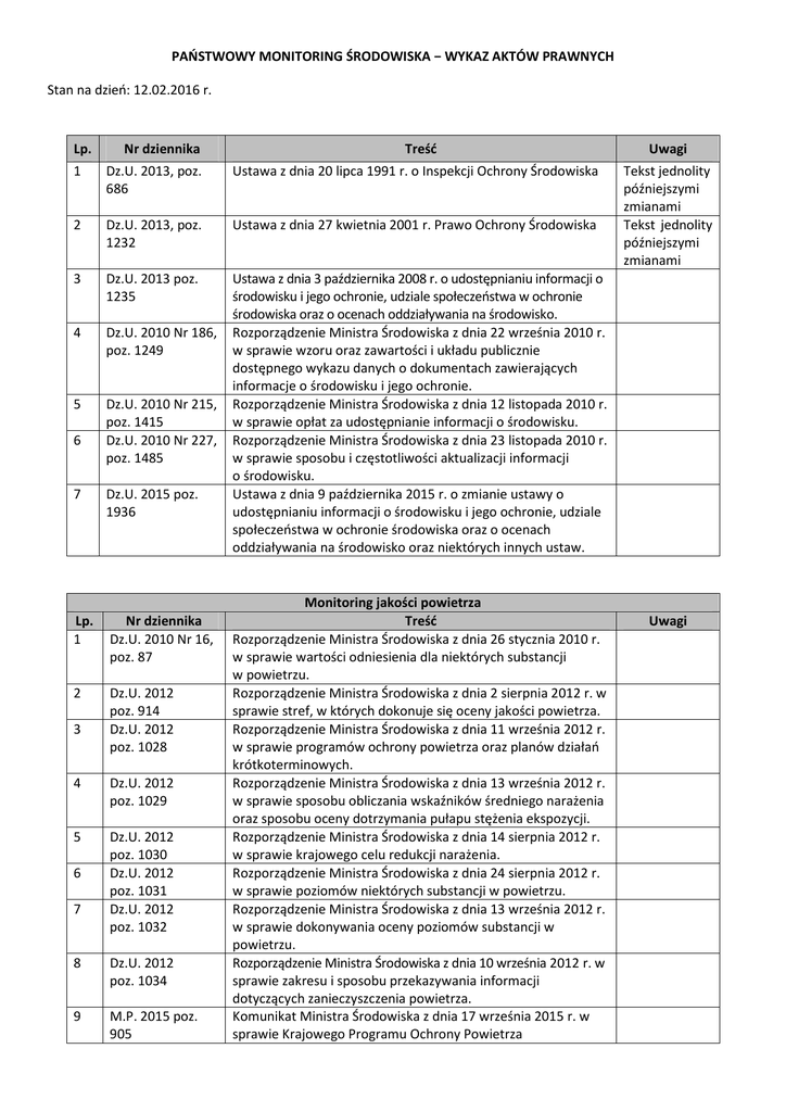 PAŃSTWOWY MONITORING ŚRODOWISKA − WYKAZ AKTÓW PRAWNYCH Stan na dzień: 12.02.2016 r. Lp. Nr dziennika Treść 1 Dz.U. 2013, poz. 686 Ustawa z dnia 20 lipca 1991 r. o Inspekcji Ochrony Środowiska 2 Dz.U. 2013, poz. 1232 Ustawa z dnia 27 kwietnia 2001 r. Prawo Ochrony Środowiska 3 Dz.U. 2013 poz. 1235 4 Dz.U. 2010 Nr 186, poz. 1249 5 Dz.U. 2010 Nr 215, poz. 1415 Dz.U. 2010 Nr 227, poz. 1485 Ustawa z dnia 3 października 2008 r. o udostępnianiu informacji o środowisku i jego ochronie, udziale społeczeństwa w ochronie środowiska oraz o ocenach oddziaływania na środowisko. Rozporządzenie Ministra Środowiska z dnia 22 września 2010 r. w sprawie wzoru oraz zawartości i układu publicznie dostępnego wykazu danych o dokumentach zawierających informacje o środowisku i jego ochronie. Rozporządzenie Ministra Środowiska z dnia 12 listopada 2010 r. w sprawie opłat za udostępnianie informacji o środowisku. Rozporządzenie Ministra Środowiska z dnia 23 listopada 2010 r. w sprawie sposobu i częstotliwości aktualizacji informacji o środowisku. Ustawa z dnia 9 października 2015 r. o zmianie ustawy o udostępnianiu informacji o środowisku i jego ochronie, udziale społeczeństwa w ochronie środowiska oraz o ocenach oddziaływania na środowisko oraz niektórych innych ustaw. 6 7 Dz.U. 2015 poz. 1936 Lp. 1 Nr dziennika Dz.U. 2010 Nr 16, poz. 87 2 Dz.U. 2012 poz. 914 Dz.U. 2012 poz. 1028 3 4 Dz.U. 2012 poz. 1029 5 Dz.U. 2012 poz. 1030 Dz.U. 2012 poz. 1031 Dz.U. 2012 poz. 1032 6 7 8 Dz.U. 2012 poz. 1034 9 M.P. 2015 poz. 905 Monitoring jakości powietrza Treść Rozporządzenie Ministra Środowiska z dnia 26 stycznia 2010 r. w sprawie wartości odniesienia dla niektórych substancji w powietrzu. Rozporządzenie Ministra Środowiska z dnia 2 sierpnia 2012 r. w sprawie stref, w których dokonuje się oceny jakości powietrza. Rozporządzenie Ministra Środowiska z dnia 11 września 2012 r. w sprawie programów ochrony powietrza oraz planów działań krótkoterminowych. Rozporządzenie Ministra Środowiska z dnia 13 września 2012 r. w sprawie sposobu obliczania wskaźników średniego narażenia oraz sposobu oceny dotrzymania pułapu stężenia ekspozycji. Rozporządzenie Ministra Środowiska z dnia 14 sierpnia 2012 r. w sprawie krajowego celu redukcji narażenia. Rozporządzenie Ministra Środowiska z dnia 24 sierpnia 2012 r. w sprawie poziomów niektórych substancji w powietrzu. Rozporządzenie Ministra Środowiska z dnia 13 września 2012 r. w sprawie dokonywania oceny poziomów substancji w powietrzu. Rozporządzenie Ministra Środowiska z dnia 10 września 2012 r. w sprawie zakresu i sposobu przekazywania informacji dotyczących zanieczyszczenia powietrza. Komunikat Ministra Środowiska z dnia 17 września 2015 r. w sprawie Krajowego Programu Ochrony Powietrza Uwagi Tekst jednolity późniejszymi zmianami Tekst jednolity późniejszymi zmianami Uwagi Monitoring jakości śródlądowych wód powierzchniowych oraz wód podziemnych Lp. 1 Nr dziennika Dz.U. 2015, poz. 469 Treść Ustawa z dnia z dnia 18 lipca 2001 r. - Prawo wodne 2 Dz.U. 2015, poz. 2295 Ustawę z dnia 16 grudnia 2015 r. o zmianie ustawy -Prawo wodne oraz ustawy o zmianie ustawy-Prawo wodne oraz niektórych innych ustaw 3 Dz.U. 2002 Nr 176, poz. 1455 4 Dz.U. 2002 Nr 204, poz. 1728 5 Dz.U. 2002 Nr 241, poz. 2093 6 Dz.U. 2011 Nr 36, poz. 191 Dz.U. 2011 Nr 86, poz. 478 Rozporządzenie Ministra Środowiska z dnia 4 października 2002 r. w sprawie wymagań, jakim powinny odpowiadać wody śródlądowe będące środowiskiem życia ryb w warunkach naturalnych. Rozporządzenie Ministra Środowiska z dnia 27 listopada 2002 r. w sprawie wymagań, jakim powinny odpowiadać wody powierzchniowe wykorzystywane do zaopatrzenia ludności w wodę przeznaczoną do spożycia. Rozporządzenie Ministra Środowiska z dnia 23 grudnia 2002r. w sprawie kryteriów wyznaczania wód wrażliwych na zanieczyszczenie związkami azotu ze źródeł rolniczych. Rozporządzenie Ministra Środowiska z dnia 2 lutego 2011 r. w sprawie profilu wody w kąpielisku. Rozporządzenie Ministra Zdrowia z dnia 8 kwietnia 2011 r. w sprawie nadzoru nad jakością wody w kąpielisku i miejscu wykorzystywanym do kąpieli. Rozporządzenie Ministra Środowiska z dnia 10 listopada 2011 r. w sprawie wykazu substancji priorytetowych w dziedzinie polityki wodnej. Rozporządzenie Ministra Środowiska z dnia 22 październik 2014 r. w sprawie sposobu klasyfikacji stanu jednolitych części wód powierzchniowych oraz środowiskowych norm jakości dla substancji priorytetowych. Rozporządzenie Ministra Środowiska z dnia 9 listopada 2011 r. w sprawie klasyfikacji stanu ekologicznego, potencjału ekologicznego i stanu chemicznego jednolitych części wód powierzchniowych. Rozporządzenie Ministra Środowiska z dnia 15 listopada 2011 r. w sprawie form i sposobu prowadzenia monitoringu jednolitych części wód powierzchniowych i podziemnych. Rozporządzenie Ministra Środowiska z dnia 21 listopada 2013 r. zmieniające rozporządzenie w sprawie form i sposobu prowadzenia monitoringu jednolitych części wód powierzchniowych i podziemnych 7 8 Dz.U. 2011 Nr 254, poz. 1528 9 Dz.U. 2014 poz. 1482 10 Dz.U. 2011 Nr 258, poz. 1482 11 Dz.U. 2011 Nr 258, poz. 1550 12 Dz.U. 2013 poz. 1558 13 Dz.U. 2015 poz. 2295 poz. 2295 Ustawę z dnia 16 grudnia 2015 r. o zmianie ustawy Prawo wodne oraz ustawy o zmianie ustawy-Prawo wodne oraz niektórych innych ustaw 14 Dz.U. 2016 poz. 85 Rozporządzenie Ministra Środowiska z dnia 21 grudnia 2015 r. w sprawie kryteriów i sposobu oceny stanu jednolitych części wód podziemnych Uwagi tekst jednolity z późniejszymi zmianami Monitoring jakości śródlądowych wód powierzchniowych oraz wód podziemnych Wykaz Rozporządzeń Dyrektorów Regionalnych Zarządów Gospodarki Wodnej Lp. Nr dziennika 1 Dz.Urz. Woj. Wlkp. 2012, poz. 3143 2 Dz.Urz. Woj. Wlkp. 2012, poz. 3193 3 Dz.Urz. Woj. Wlkp. 2013, poz. 4767 4 Dz.Urz. Woj. Wlkp. 2012, poz. 3847 5 Dz