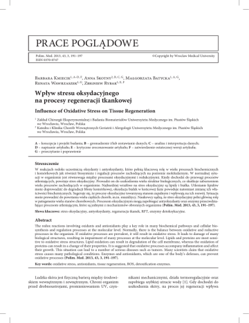 prace poglądowe Polim. Med. 2013, 43, 3, 191–197 ISSN 0370-0747 © Copyright by Wroclaw Medical University Barbara Kmiecik1, A–D, F, Anna Skotny2, B, C, G, Małgorzata Batycka1, A, G, Renata Wawrzaszek1, G, Zbigniew Rybak1, E, F Wpływ stresu oksydacyjnego na procesy regeneracji tkankowej Influence of Oxidative Stress on Tissue Regeneration 1Zakład Chirurgii Eksperymentalnej i Badania Biomateriałów Uniwersytetu Medycznego im. Piastów Śląskich we Wrocławiu, Wrocław, Polska 2Katedra i Klinika Chorób Wewnętrznych Geriatrii i Alergologii Uniwersytetu Medycznego im. Piastów Śląskich we Wrocławiu, Wrocław, Polska A – koncepcja i projekt badania; B – gromadzenie i/lub zestawianie danych; C – analiza i interpretacja danych; D – napisanie artykułu; E – krytyczne zrecenzowanie artykułu; F – zatwierdzenie ostatecznej wersji artykułu; G – przeczytanie i poprawienie Streszczenie W reakcjach redoks uczestniczą oksydanty i antyoksydanty, które pełnią kluczową rolę w wielu procesach biochemicznych i komórkowych jak również biosyntezie i regulacji procesów zachodzących na poziomie molekularnym. W normalnej sytuacji w organizmie jest równowaga między procesami oksydacyjnymi i redukcyjnymi. Kiedy dochodzi do przewagi procesów utleniających, powstaje stres oksydacyjny. Prowadzi on do uszkodzenia wielu struktur biologicznych, co skutkuje zaburzeniem wielu procesów zachodzących w organizmie. Najbardziej wrażliwe na stres oksydacyjny są lipidy i białka. Utlenianie lipidów może doprowadzić do degradacji błony komórkowej, oksydacja białek w końcowej fazie powoduje natomiast zmianę ich właściwości biochemicznych. Sugeruje się, że procesy oksydacyjne towarzyszą stanom zapalnym i wpływają na ich rozwój. Sytuacja może prowadzić do powstania wielu ciężkich chorób, m.in. miażdżycy. Naukowcy sądzą, że stres oksydacyjny pełni główną rolę w patogenezie wielu stanów chorobowych. Procesom oksydacyjnym mogą zapobiegać antyoksydanty oraz enzymy przeciwdziałające procesom utleniającym, które są jednymi z mechanizmów obronnych organizmu (Polim. Med. 2013, 43, 3, 191–197). Słowa kluczowe: stres oksydacyjny, antyoksydanty, regeneracja tkanek, RFT, enzymy detoksykacyjne. Abstract The redox reactions involving oxidants and antioxidants play a key role in many biochemical pathways and cellular biosynthesis and regulation processes at the molecular level. Normally, there is the balance between oxidative and reductive processes in the organism. If oxidative processes are prevalent, it will result in oxidative stress. It leads to damage of many biological structures, resulting in impairment of many processes at the molecular level. Lipids and proteins are most sensitive to oxidative stress structures. Lipid oxidation can result in degradation of the cell membrane, whereas the oxidation of proteins can result in a change of their properties. It is suggested that oxidative processes accompany inflammation and affect their growth. This situation can lead to a number of serious diseases such as tumors. Many scientists claim that oxidative stress causes many pathological conditions. Enzymes and antioxidants, which are one of the body’s defenses, can prevent oxidative processes (Polim. Med. 2013, 43, 3, 191–197). Key words: oxidative stress, antioxidants, tissue regeneration, ROS, detoxification enzymes. Ludzka skóra jest fizyczną barierą między środowiskiem wewnętrznym i zewnętrznym. Chroni organizm przed drobnoustrojami, promieniowaniem UV, czyn- nikami mechanicznymi, działa termoregulacyjnie oraz zapobiega szybkiej utracie wody [1]. Gdy dochodzi do uszkodzenia skóry, na proces jej regeneracji wpływa 192 B. Kmiecik et al. negatywnie lub pozytywnie wiele czynników [2]. Stres oksydacyjny jest definiowany jako brak równowagi między wytwarzaniem wolnych rodników i ich eliminacją poprzez mechanizmy obronne (enzymy, antyoksydanty). Brak stabilności pomiędzy procesami oksydacyjnymi i redukcyjnymi prowadzi do uszkodzenia ważnych biomolekuł i komórek (m.in. DNA, białka, lipidy), co ma potencjalny wpływ na cały organizm. Reaktywne formy tlenu (RFT) to produkty prawidłowego metabolizmu komórkowego, które pełnią istotną rolę w stymulacji szlaków sygnałowych w komórkach roślinnych i zwierzęcych w odpowiedzi na zmiany wewnątrz- i zewnątrzkomórkowe w warunkach środowiskowych [3]. Epidermalne komórki T Najbardziej zewnętrzną warstwą skóry jest naskórek, w którym można znaleźć m.in. γδ komórki T oraz dendrytyczne komórki epidermalne T (DETCs) [4]. Komrki γδ T biorą udział we wczesnej i szybkiej odpowiedzi na uszkodzenia tkanki, stąd ich obecność w skórze, płucach i jelitach. Pierwszymi komórkami reagującymi na powstały uraz są komórki epitelialne. Przekazują sygnał o powstaniu uszkodzenia pozostałym strukturom. Uraz i stres aktywuje keratynocyty, co prowadzi do wydzielania antygenów charakterystycznych dla komórek DETCs. Szybka odpowiedź skóry na reakcje komórek γδT powoduje ich dynamiczną zmianę morfologiczną w pierwszych godzinach uszkodzenia tkanki [4]. Komórki te pełnią również istotną rolę w procesach alergicznych i chorobach zapalnych skóry. Także w tych przypadkach odnotowuje się stres oksydacyjny, który bierze udział w uczuleniowych reakcjach chemicznych. Prawdopodobnie zmniejszający się stosunek form zredukowanych do utlenionych jest stymulującym sygnałem dla komórek dendrytycznych do ich dojrzewania i późniejszego reagowania [5]. Stres oksydacyjny W układach biologicznych reduktor i utleniacz są nazywane odpowiednio antyoksydantami i oksydantami. Oksydanty mogą powodować uszkodzenia lipidów, DNA i białek. Komórka może neutralizować ich działanie enzymami lub antyoksydantami [6]. Antyoksydanty są związkami stanowiącymi mechanizmy ochronne zapobiegające nadmiernym procesom utleniającym lub stresowi oksydacyjnemu. Organizm w sposób 