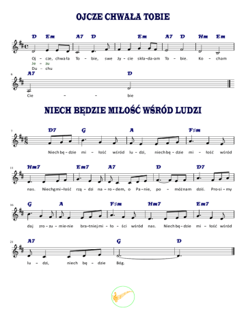 OJCZE CHWAŁA TOBIE D Em A7 D Em cze, chwa ła zu chu bie, Oj Je Du D Hm Em To swe ży cie skła da am A7 6 A7 To bie. Ko cham D Cie bie NIECH BĘDZIE MIŁOŚĆ WŚRÓD LUDZI D7 7 6 8 G Niech bę dzie 11 Hm7 mi nas. Niechg mi łość G rzą 21 dzi na lu wśród lu niech bę dzi, mie nie dzie mi Pa nie, po móż nam Hm7 bra tniej mi ło nas. Niech bę dzie G D dzi, niech bę dzie Bóg. C dziś. Pro si my E m7 wśród D7 ści wśród łość ro dem, o D F ♯m A7 A7 A zro zu F ♯m daj łość E m7 16 A mi łość wśród