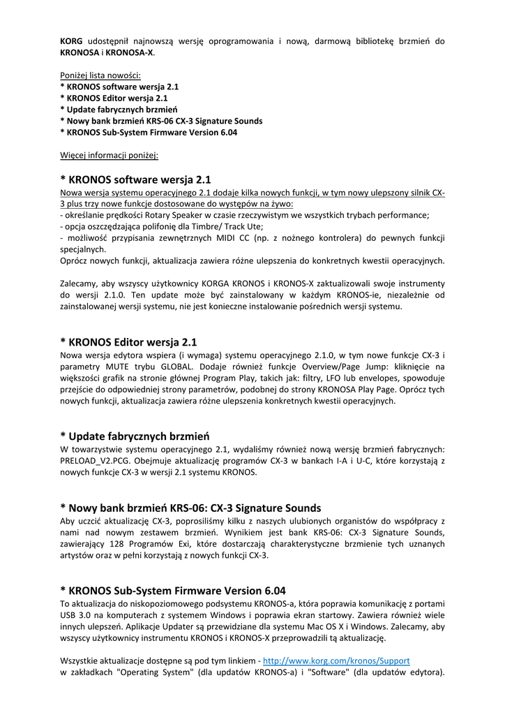 KORG udostępnił najnowszą wersję oprogramowania i nową, darmową bibliotekę brzmień do KRONOSA i KRONOSA‐X. Poniżej lista nowości: * KRONOS software wersja 2.1 * KRONOS Editor wersja 2.1 * Update fabrycznych brzmień * Nowy bank brzmień KRS‐06 CX‐3 Signature Sounds * KRONOS Sub‐System Firmware Version 6.04 Więcej informacji poniżej: * KRONOS software wersja 2.1 Nowa wersja systemu operacyjnego 2.1 dodaje kilka nowych funkcji, w tym nowy ulepszony silnik CX‐ 3 plus trzy nowe funkcje dostosowane do występów na żywo: ‐ określanie prędkości Rotary Speaker w czasie rzeczywistym we wszystkich trybach performance; ‐ opcja oszczędzająca polifonię dla Timbre/ Track Ute; ‐ możliwość przypisania zewnętrznych MIDI CC (np. z nożnego kontrolera) do pewnych funkcji specjalnych. Oprócz nowych funkcji, aktualizacja zawiera różne ulepszenia do konkretnych kwestii operacyjnych. Zalecamy, aby wszyscy użytkownicy KORGA KRONOS i KRONOS‐X zaktualizowali swoje instrumenty do wersji 2.1.0. Ten update może być zainstalowany w każdym KRONOS‐ie, niezależnie od zainstalowanej wersji systemu, nie jest konieczne instalowanie pośrednich wersji systemu. * KRONOS Editor wersja 2.1 Nowa wersja edytora wspiera (i wymaga) systemu operacyjnego 2.1.0, w tym nowe funkcje CX‐3 i parametry MUTE trybu GLOBAL. Dodaje również funkcje Overview/Page Jump: kliknięcie na większości grafik na stronie głównej Program Play, takich jak: filtry, LFO lub envelopes, spowoduje przejście do odpowiedniej strony parametrów, podobnej do strony KRONOSA Play Page. Oprócz tych nowych funkcji, aktualizacja zawiera różne ulepszenia konkretnych kwestii operacyjnych. * Update fabrycznych brzmień W towarzystwie systemu operacyjnego 2.1, wydaliśmy również nową wersję brzmień fabrycznych: PRELOAD_V2.PCG. Obejmuje aktualizację programów CX‐3 w bankach I‐A i U‐C, które korzystają z nowych funkcje CX‐3 w wersji 2.1 systemu KRONOS. * Nowy bank brzmień KRS‐06: CX‐3 Signature Sounds Aby uczcić aktualizację CX‐3, poprosiliśmy kilku z naszych ulubionych organistów do współpracy z nami nad nowym zestawem brzmień. Wynikiem jest bank KRS‐06: CX‐3 Signature Sounds, zawierający 128 Programów Exi, które dostarczają charakterystyczne brzmienie tych uznanych artystów oraz w pełni korzystają z nowych funkcji CX‐3. * KRONOS Sub‐System Firmware Version 6.04 To aktualizacja do niskopoziomowego podsystemu KRONOS‐a, która poprawia komunikację z portami USB 3.0 na komputerach z systemem Windows i poprawia ekran startowy. Zawiera również wiele innych ulepszeń. Aplikacje Updater są przewidziane dla systemu Mac OS X i Windows. Zalecamy, aby wszyscy użytkownicy instrumentu KRONOS i KRONOS‐X przeprowadzili tą aktualizację. Wszystkie aktualizacje dostępne są pod tym linkiem ‐ http://www.korg.com/kronos/Support w zakładkach "Operating System" (dla updatów KRONOS‐a) i "Software" (dla updatów edytora).