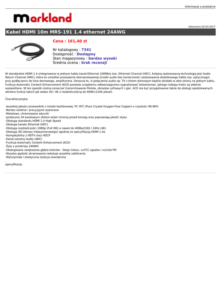 Informacje o produkcie Utworzono 02-03-2017 Kabel HDMI 10m MRS-191 1.4 ethernet 24AWG Cena : 161,40 zł Nr katalogowy : 7341 Dostępność : Dostępny Stan magazynowy : bardzo wysoki Średnia ocena : brak recenzji W standardzie HDMI 1.4 zintegrowano w jednym kablu kanał Ethernet 100Mb/s tzw. Ethernet Channel (HEC). Kolejną zastosowaną technologią jest Audio Return Channel (ARC), która to umożliwi przesyłanie skompresowanej ścieżki audio bez konieczności zastosowania dodatkowego kabla (np. optycznego) przy podłączeniu do kina domowego, amplitunera. Oznacza to, iż połączenie audio np. TV z kinem domowym będzie działało w obie strony na jednym kablu. Funkcja Automatic Content Enhancement (ACE) pozwala urządzeniu odtwarzającemu sygnalizować telewizorowi, jakiego rodzaju treści są właśnie wyświetlane. W ten sposób można oznaczać transmitowanie filmów, obrazów cyfrowych i gier. ACE ma być przygotowane także do obsługi spodziewanych wkrótce funkcji takich jak wideo 3D i 4K z rozdzielczością do 4096×2160 pikseli. . Charakterystyka: -wysokiej jakości przewodnik z miedzi beztlenowej: PC OFC (Pure Crystal Oxygen-Free Copper) o czystości 99.96% -Bardzo solidnie i precyzyjnie wykonane -Metalowe, chromowane wtyczki -pozłacane 24 karatowym złotem wtyki chronią przed korozją oraz poprawiają jakość styku -Obsługa standardu HDMI 1.4 High Speed -Obsługa kanału Ethernet (HEC) -Obsługa rozdzielczości 1080p (Full HD) a nawet do 4096x2160 / 24Hz (4K) -Obsługa 3D (obrazu trójwymiarowego) zgodnej ze specyfikacją HDMI 1.4a -Kompatybilny z HDTV oraz HDCP -Kanał zwrotny Audio (ARC) -Funkcja Automatic Content Enhancement (ACE) -Żyły o przekroju 24AWG -Obsługiwana zwiększona głębia kolorów - Deep Colour, xvYCC zgodne i xvColorTM -Wysoka gęstość ekranowania redukuje wszelkie zakłócenia -Wytrzymała i elastyczna izolacja zewnętrzna . specyfikacja: