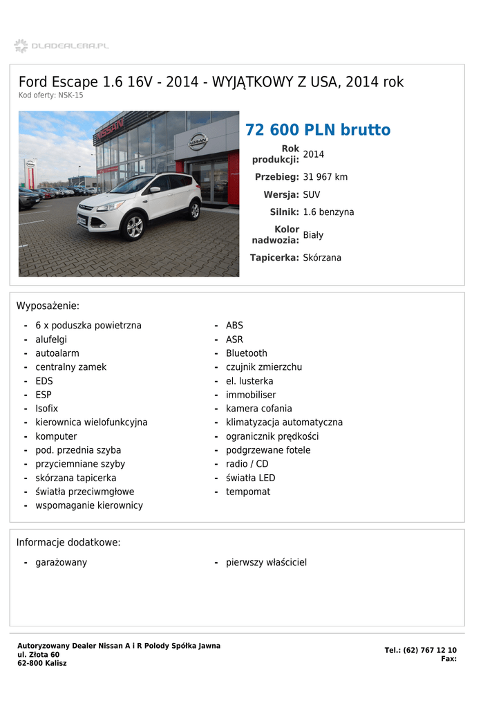 Ford Escape 1.6 16V - 2014 - WYJĄTKOWY Z USA, 2014 rok Kod oferty: NSK-15 72 600 PLN brutto Rok 2014 produkcji: Przebieg: 31 967 km Wersja: SUV Silnik: 1.6 benzyna Kolor Biały nadwozia: Tapicerka: Skórzana Wyposażenie: - 6 x poduszka powietrzna alufelgi autoalarm centralny zamek EDS ESP Isofix kierownica wielofunkcyjna komputer pod. przednia szyba przyciemniane szyby skórzana tapicerka światła przeciwmgłowe wspomaganie kierownicy - ABS ASR Bluetooth czujnik zmierzchu el. lusterka immobiliser kamera cofania klimatyzacja automatyczna ogranicznik prędkości podgrzewane fotele radio / CD światła LED tempomat Informacje dodatkowe: - garażowany - pierwszy właściciel Autoryzowany Dealer Nissan A i R Polody Spółka Jawna ul. Złota 60 62-800 Kalisz Tel.: (62) 767 12 10 Fax: