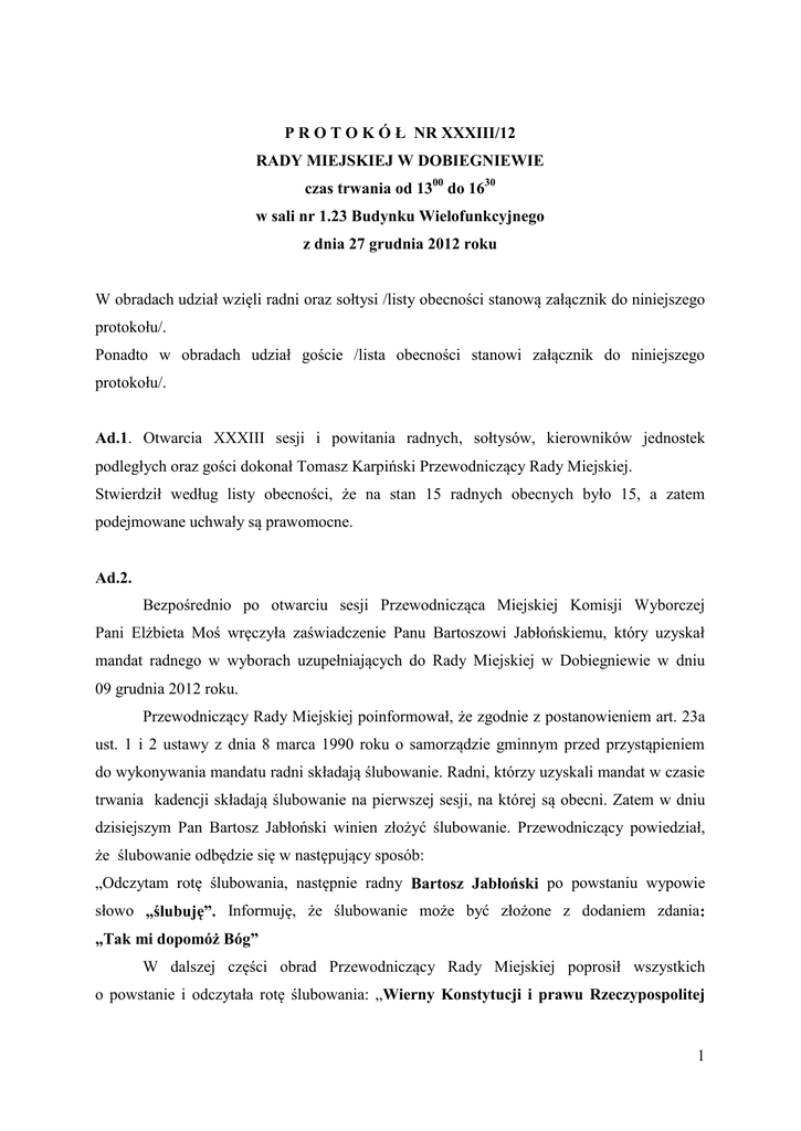 P R O T O K Ó Ł NR XXXIII/12 RADY MIEJSKIEJ W DOBIEGNIEWIE czas trwania od 1300 do 1630 w sali nr 1.23 Budynku Wielofunkcyjnego z dnia 27 grudnia 2012 roku W obradach udział wzięli radni oraz sołtysi /listy obecności stanową załącznik do niniejszego protokołu/. Ponadto w obradach udział goście /lista obecności stanowi załącznik do niniejszego protokołu/. Ad.1. Otwarcia XXXIII sesji i powitania radnych, sołtysów, kierowników jednostek podległych oraz gości dokonał Tomasz Karpiński Przewodniczący Rady Miejskiej. Stwierdził według listy obecności, że na stan 15 radnych obecnych było 15, a zatem podejmowane uchwały są prawomocne. Ad.2. Bezpośrednio po otwarciu sesji Przewodnicząca Miejskiej Komisji Wyborczej Pani Elżbieta Moś wręczyła zaświadczenie Panu Bartoszowi Jabłońskiemu, który uzyskał mandat radnego w wyborach uzupełniających do Rady Miejskiej w Dobiegniewie w dniu 09 grudnia 2012 roku. Przewodniczący Rady Miejskiej poinformował, że zgodnie z postanowieniem art. 23a ust. 1 i 2 ustawy z dnia 8 marca 1990 roku o samorządzie gminnym przed przystąpieniem do wykonywania mandatu radni składają ślubowanie. Radni, którzy uzyskali mandat w czasie trwania kadencji składają ślubowanie na pierwszej sesji, na której są obecni. Zatem w dniu dzisiejszym Pan Bartosz Jabłoński winien złożyć ślubowanie. Przewodniczący powiedział, że ślubowanie odbędzie się w następujący sposób: „Odczytam rotę ślubowania, następnie radny Bartosz Jabłoński po powstaniu wypowie słowo „ślubuję”. Informuję, że ślubowanie może być złożone z dodaniem zdania: „Tak mi dopomóż Bóg” W dalszej części obrad Przewodniczący Rady Miejskiej poprosił wszystkich o powstanie i odczytała rotę ślubowania: „Wierny Konstytucji i prawu Rzeczypospolitej 1 Polskiej, ślubuję uroczyście obowiązki radnego sprawować godnie, rzetelnie i uczciwie, mając na względzie dobro mojej gminy i jej mieszkańców”. Następnie radny Bartosz Jabłoński wypowiedział słowa „Ślubuję. Tak mi dopomóż Bóg”. Po złożeniu ślubowania Przewodniczący pogratulował radnemu i stwierdził, że radny Bartosz Jabłoński złożył ślubowanie i w dniu dzisiejszym objął mandat radnego Rady Miejskiej w Dobiegniewie. Bartosz Jabłoński radny – korzystając z okazji chciałbym podziękować wyborcom, którzy powierzyli mi to wyborcze zaufanie. Mam nadzieję, że go nie zawiodę i chociaż część programu wyborczego uda się zrealizować. Ad.3. Tadeusz Bednarczuk Zastępca Burmistrza wnioskował o wprowadzenie do porządku obrad uchwały w sprawie szczegółowego sposobu i zakresu świadczenia usług w zakresie odbierania odpadów komunalnych od właścicieli nieruchomości i zagospodarowania tych odpadów. Michał Gacki Wiceprzewodniczący Rady Miejskiej wnioskował o zdjęcie z porządku obrad w punkcie 9 podpunktów: a) uchwała w sprawie terminu, częstotliwości i trybu uiszczania opłaty za gospodarowanie odpadami komunalnymi, b) uchwała w sprawie wyboru metody ustalenia opłaty za gospodarowanie odpadami komunalnymi oraz ustalenie stawki takiej opłaty na terenie gminy Dobiegniew, c) uchwała w sprawie ustalenia wzoru deklaracji o wysokości opłaty za gospodarowanie odpadami komunalnymi składanej przez właścicieli nieruchomości położonych na terenie Gminy Dobiegniew. Tomasz Karpiński Przewodniczący Rady Miejskiej również wnioskował o wprowadzenie do porządku obrad uchwały w sprawie upoważnienia do reprezentowania Rady Miejskiej w Dobiegniewie przed Wojewódzkim Sądem Administracyjnym w Gorzowie Wlkp. oraz przed Naczelnym Sądem Administracyjnym. Rada uchwałę w sprawie szczegółowego sposobu i zakresu świadczenia usług w zakresie odbierania odpadów komunalnych od właścicieli nieruchomości i zagospodarowania tych odpadów odrzuciła jednomyślnie: za głosowało 0 radnych, przeciw 15 radnych, wstrzymało się 0 radnych. 2 Rada wniosek o wycofanie z porządku obrad uchwał: w sprawie terminu, częstotliwości i trybu uiszczania opłaty za gospodarowanie odpadami komunalnymi, w sprawie wyboru metody ustalenia opłaty za gospodarowanie odpadami komunalnymi oraz ustalenie stawki takiej opłaty na terenie gminy Dobiegniew, oraz uchwały w sprawie ustalenia wzoru deklaracji o wysokości opłaty za gospodarowanie odpadami komunalnymi składanej przez właścicieli nieruchomości położonych na terenie Gminy Dobiegniew odrzuciła jednomyślnie: za głosowało 15 radnych, przeciw 0 radnych, wstrzymało się 0 radnych. Rada uchwałę w sprawie upoważnienia do reprezentowania Rady Miejskiej w Dobiegniewie przed Wojewódzkim Sądem Administracyjnym w Gorzowie Wlkp. oraz przed Naczelnym Sądem Administracyjnym przyjęła do porządku obrad jednomyślnie: za głosowało 15 radnych, przeciw 0 radnych, wstrzymało się 0 radnych. W głosowaniu udział wzięło 15 radnych. Rada porządek obrad przyjęła jednomyślnie: za 15 głosowało radnych, przeciw 0 radnych, wstrzymało się 0 radnych. Porządek obrad: 1. Otwarcie sesji i stwierdzenie kworum. 2. Ślubowanie radnego Bartosza Jabłońskiego wybranego do Rady Miejskiej w wyborach uzupełniających w dniu 09 grudnia 2012 roku. 3. Przyjęcie porządku obrad. 4. Przyjęcie protokołu z XXXI i XXXII sesji. 5. Informacja o działalności burmistrza między sesjami. 6. Wnioski i zapytania. 7. Uchwalenie budżetu gminy na rok 2013. Odczytanie projektu uchwały w sprawie uchwalenia budżetu gminy na rok 2013. Odczytanie opinii Regionalnej Izby Obrachunkowej. Odczytanie opinii i wniosków komisji rady. Dyskusja. Głosowanie nad projektem uchwały budżetowej. 8. Uchwalenia Wieloletniej Prognozy Finansowej Gminy na lata 2013-2024. Odczytanie opinii Regionalnej Izby Obrachunkowej. 3 Dyskusja nad wniesionym projektem. Podjęcie uchwały w sprawie uchwalenia Wieloletniej Prognozy Finansowej na lata 2013-2024. 9. Podjęcie uchwał w sprawie: a) przyjęcia Gminnego Programu Profilaktyki i Ro
