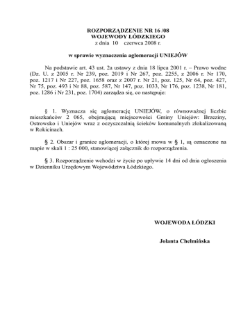 ROZPORZĄDZENIE NR 16 /08 WOJEWODY ŁÓDZKIEGO z dnia 10 czerwca 2008 r. w sprawie wyznaczenia aglomeracji UNIEJÓW Na podstawie art. 43 ust. 2a ustawy z dnia 18 lipca 2001 r. – Prawo wodne (Dz. U. z 2005 r. Nr 239, poz. 2019 i Nr 267, poz. 2255, z 2006 r. Nr 170, poz. 1217 i Nr 227, poz. 1658 oraz z 2007 r. Nr 21, poz. 125, Nr 64, poz. 427, Nr 75, poz. 493 i Nr 88, poz. 587, Nr 147, poz. 1033, Nr 176, poz. 1238, Nr 181, poz. 1286 i Nr 231, poz. 1704) zarządza się, co następuje: § 1. Wyznacza się aglomerację UNIEJÓW, o równoważnej liczbie mieszkańców 2 065, obejmującą miejscowości Gminy Uniejów: Brzeziny, Ostrowsko i Uniejów wraz z oczyszczalnią ścieków komunalnych zlokalizowaną w Rokicinach. § 2. Obszar i granice aglomeracji, o której mowa w § 1, są oznaczone na mapie w skali 1 : 25 000, stanowiącej załącznik do rozporządzenia. § 3. Rozporządzenie wchodzi w życie po upływie 14 dni od dnia ogłoszenia w Dzienniku Urzędowym Województwa Łódzkiego. WOJEWODA ŁÓDZKI Jolanta Chełmińska UZASADNIENIE do rozporządzenia Wojewody Łódzkiego w sprawie wyznaczenia aglomeracji UNIEJÓW. W celu wypełnienia zobowiązań Rzeczypospolitej Polskiej, przyjętych w Traktacie Akcesyjnym Polski do Unii Europejskiej, w części dotyczącej dyrektywy 91/271/EWG w sprawie oczyszczania ścieków komunalnych, został sporządzony przez Ministerstwo Środowiska, a następnie zatwierdzony przez rząd RP w dniu 16 grudnia 2003 r., Krajowy program oczyszczania ścieków komunalnych (KPOŚK), który określa plan inwestycyjny w dziedzinie gospodarki wodno-ściekowej, jaki musi zostać zrealizowany przez Polskę, aby osiągnąć wymagane efekty ekologiczne. Program ten zawiera wykaz aglomeracji oraz niezbędnych przedsięwzięć w zakresie budowy, rozbudowy i/lub modernizacji zbiorczych sieci kanalizacyjnych oraz oczyszczalni ścieków komunalnych, także terminy ich realizacji dla wywiązania się z zobowiązań wobec Unii Europejskiej. Ustawa z dnia 18 lipca 2001 r. Prawo wodne (Dz. U. z 2005 r. Nr 239, poz. 2019 ze zm.) wprowadziła w art. 43 ust. 2 definicję aglomeracji, czyli terenu, na którym zaludnienie lub działalność gospodarcza są wystarczająco skoncentrowane, aby ścieki komunalne były zbierane i przekazywane do oczyszczalni ścieków komunalnych. Aglomeracje o wielkości powyżej 2000 równoważnych mieszkańców powinny być wyposażone zgodnie z ww. ustawą w kanalizację i oczyszczalnie ścieków. Artykuł 43 ust. 2a ustawy Prawo wodne z dnia 18 lipca 2001 r. zobowiązuje wojewodów do wyznaczania granic i obszarów aglomeracji, wykazanych w KPOŚK, w drodze aktu prawa miejscowego, po zasięgnięciu opinii zarządu województwa i zainteresowanych gmin. Z dniem 1 stycznia 2005 r. weszło w życie rozporządzenie Ministra Środowiska z dnia 22 grudnia 2004 r. w sprawie sposobu wyznaczania obszaru i granic aglomeracji ( Dz. U. Nr 283, poz. 2841 oraz z 2006 r. Nr 199, poz. 1468), które określa sposób postępowania przy ich wyznaczaniu. Przy piśmie z dnia 21 marca 2008 roku Burmistrz Miasta Uniejów przedłożył do Wojewody projekt planu aglomeracji pod nazwą „Plan aglomeracji Gminy Uniejów”. Projekt planu, po zweryfikowaniu przez Wojewodę, pod kątem spełnienia wymogów określonych w rozporządzeniu Ministra Środowiska z dnia 22 grudnia 2004 r., został zgodnie z § 4. ust. 2 cyt. wyżej rozporządzenia, pozytywnie zaopiniowany Uchwałą Nr 699/08 Zarządu Województwa Łódzkiego z dnia 21 maja 2008 roku oraz uchwałą Nr XXVI/159/08 Rady Miejskiej w Uniejowie z dnia 21 maja 2008 roku. Miejsko - wiejska gmina Uniejów położona jest w północno - zachodniej części województwa łódzkiego. Graniczy z gminami: Przykona, Brudzew, Dąbie, Świnice Warckie, Wartkowice, Dobra i Poddębice. Gmina Uniejów należy do wschodniej części Niziny Wielkopolskiej. Jest to obszar płaskiej moreny dennej ze zlodowacenia środkowopolskiego, wyniesionej średnio na wysokość 108 do 118 m n.p.m. Środkową, wschodnią i południową część tej gminy tworzy równina zwana Kotliną Uniejewską od zachodu granicząca z rozległą doliną Warty, a od północy z doliną Neru. Sieć osadniczą tworzą miasto Uniejów i 30 wsi sołeckich: Brzeziny, Brzozówka, Czekaj, Czepów, Człopy, Dąbrowa, Felicjanów, Góry, Hipolotów, Kozanki Wielkie, Kuczki, Lekaszyn, Łęg Baliński, Orzeszków, Orzeszków Kolonia, Ostrowsko, Pęgów, Rożniatów Kolonia, Rożniatów, Skotniki, Spycimierz, Spycimierz Kolonia, Stanisławów, Wielenin, Wielenin Kolonia, Wieścice, Wilamów, Zaborów, Zieleń, Wola Podmiejska. Na terenie gminy dominuje zabudowa zagrodowa i jednorodzinna, sporadycznie występuje zabudowa wielorodzinna. Na terenie gminy Uniejów występują liczne obiekty i obszary objęte ochroną prawną. Pierwszą grupę stanowią obiekty i tereny wpisane do rejestru zabytków kultury: XIV - wieczny Zamek (nr rej. 256/714), zespół zamkowo - parkowy (nr rej. 481/222), Kolegiata p.w. Wniebowzięcia Najświętszej Marii Panny wraz z dzwonnicą (nr rej. 44/425), późnoklasycystyczny dworek (nr rej.360/102), cerkiewka (nr rej.392/139). Wszystkie te obiekty znajdują się na terenie Uniejowa lub w jego bezpośredniej bliskości. Drugą grupę stanowią obiekty i obszary objęte ochroną na podstawie ustawy o ochronie przyrody. Wśród nich na terenie gminy występują: Uniejowski Obszar Chronionego Krajobrazu, użytki ekologiczne, pomniki przyrody (8 obiektów- są to drzewa pojedyncze i w grupach, najliczniejsze skupisko znajduje się w parku w Uniejowie). Ponadto na etapie opracowywania koncepcji krajowej sieci Natura 2000 ujęto około 3 693,6 ha gminy Uniejów w ramach obszaru specjalnej ochrony ptaków PLB300002 Dolina Środkowej Warty oraz obszaru specjalnej ochrony siedlisk PLH10006 Pradolina Bzury - Neru. Obszar ten został zatwierdzony przez Ministerstwo Środowiska po zaopiniowaniu przez Komisję Europejską. Powierzchnia Gminy Uniejów wynosi 12 901 ha, zami
