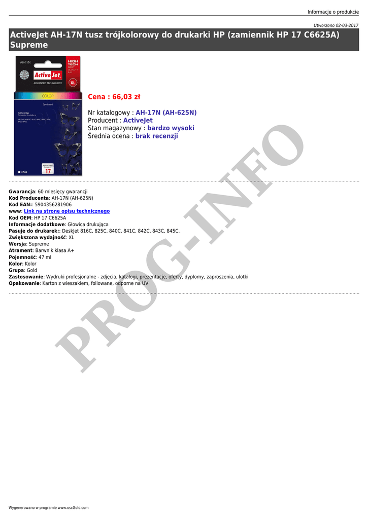 Informacje o produkcie Utworzono 02-03-2017 ActiveJet AH-17N tusz trójkolorowy do drukarki HP (zamiennik HP 17 C6625A) Supreme Cena : 66,03 zł FO Nr katalogowy : AH-17N (AH-625N) Producent : ActiveJet Stan magazynowy : bardzo wysoki Średnia ocena : brak recenzji PR O G -I N Gwarancja: 60 miesięcy gwarancji Kod Producenta: AH-17N (AH-625N) Kod EAN:: 5904356281906 www: Link na stronę opisu technicznego Kod OEM: HP 17 C6625A Informacje dodatkowe: Głowica drukująca Pasuje do drukarek:: DeskJet 816C, 825C, 840C, 841C, 842C, 843C, 845C. Zwiększona wydajność: XL Wersja: Supreme Atrament: Barwnik klasa A+ Pojemność: 47 ml Kolor: Kolor Grupa: Gold Zastosowanie: Wydruki profesjonalne - zdjęcia, katalogi, prezentacje, oferty, dyplomy, zaproszenia, ulotki Opakowanie: Karton z wieszakiem, foliowane, odporne na UV Wygenerowano w programie www.oscGold.com