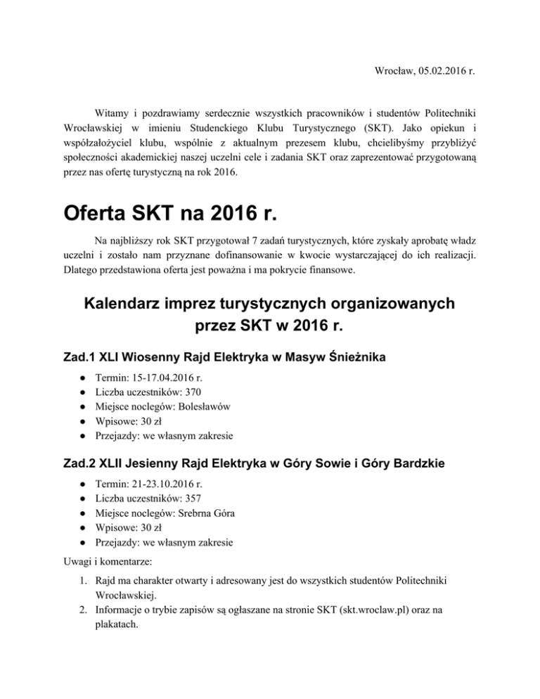 Wrocław, 05.02.2016 r. Witamy i pozdrawiamy serdecznie wszystkich pracowników i studentów Politechniki Wrocławskiej w imieniu Studenckiego Klubu Turystycznego (SKT). Jako opiekun i współzałożyciel klubu, wspólnie z aktualnym prezesem klubu, chcielibyśmy przybliżyć społeczności akademickiej naszej uczelni cele i zadania SKT oraz zaprezentować przygotowaną przez nas ofertę turystyczną na rok 2016. Oferta SKT na 2016 r. Na najbliższy rok SKT przygotował 7 zadań turystycznych, które zyskały aprobatę władz uczelni i zostało nam przyznane dofinansowanie w kwocie wystarczającej do ich realizacji. Dlatego przedstawiona oferta jest poważna i ma pokrycie finansowe. Kalendarz imprez turystycznych organizowanych przez SKT w 2016 r. Zad.1 XLI Wiosenny Rajd Elektryka w Masyw Śnieżnika ● ● ● ● ● Termin: 1517.04.2016 r. Liczba uczestników: 370 Miejsce noclegów: Bolesławów Wpisowe: 30 zł Przejazdy: we własnym zakresie Zad.2 XLII Jesienny Rajd Elektryka w Góry Sowie i Góry Bardzkie ● ● ● ● ● Termin: 2123.10.2016 r. Liczba uczestników: 357 Miejsce noclegów: Srebrna Góra Wpisowe: 30 zł Przejazdy: we własnym zakresie Uwagi i komentarze: 1. Rajd ma charakter otwarty i adresowany jest do wszystkich studentów Politechniki Wrocławskiej. 2. Informacje o trybie zapisów są ogłaszane na stronie SKT (skt.wroclaw.pl) oraz na plakatach. 3. Karty uczestnictwa są sprzedawane na otwartych zapisach. Termin zapisów podany jw. 4. Warunkiem otrzymania karty uczestnictwa jest przedstawienie pisemnego zgłoszenia zawierającego wszystkie dane osobowe i kontaktowe oraz dodatkowo podpisane zobowiązania o przestrzeganiu regulaminu rajdu. Ponadto każdy uczestnik musi ubezpieczyć się indywidualnie. 5. Wzór zgłoszenia oraz regulaminu należy pobrać ze strony skt.wroclaw.pl. 6. Gwarantowane miejsce na rajdach mają: organizatorzy z osobą towarzyszącą, gitarzyści oraz zaproszeni goście (VIPy). 7. Tradycyjnie wieczorem po przyjściu z gór organizujemy wspólną zabawę przy ognisku: pieczenie kiełbasek, degustację wyśmienitego grzańca oraz konkursy. Zad.3 Przygotowanie logistyczne tras turystycznych oraz bazy noclegowej XLI Wiosennego Rajdu Elektryka ● Termin: 910.04.2016 r. ● Liczba uczestników: 25 ● Miejsce noclegów: Bolesławów Zad.4 Przygotowanie logistyczne tras turystycznych oraz bazy noclegowej XLII Jesiennego Rajdu Elektryka ● Termin: 89.10.2016 r. ● Liczba uczestników: 25 ● Miejsce noclegów: Srebrna Góra Uwagi i komentarze: 1. Zadania 3 i 4 są integralnie związane z Rajdem Wiosennym i Jesiennym. Przeznaczone są dla organizatorów i przewodników tras. 2. Wyjazd rekonesansowoprzygotowawczy poprzedza każdy z Rajdów Elektryka i ma na celu rozeznanie w terenie oraz szkolenia organizatorów, obsługi i przewodników (baza noclegowa, przejście tras). 3. Serdecznie zapraszam wszystkich chętnych, którzy chcieliby się włączyć w organizację Rajdów, gdyż kadra turystyczna wymaga cyklicznego uzupełniania i szkolenia. Zad.5 Wyprawa trekkingowa w góry Ukrainy ● Termin: 1631.07.2016 r. ● Liczba uczestników: 49 ● Miejsce: góry Gorgany (centralne i zachodnie), Czarnohora (najwyższe Ukrainy), Świdowiec (miejsce historyczne) ● Przejazd: autokar na trasie Wrocław – Osmoloda i z powrotem opłaca SKT ● Sprzęt: namioty, palniki, kartusze – zapewnia SKT ● Koszty: wyżywienie, opłaty biwakowe, itd. – opłacają uczestnicy Uwagi i komentarze: 1. 2. 3. 4. 5. 6. 7. 8. 9. Wyprawa jest jedenastą górską wyprawą organizowaną przez SKT. Wyprawa ma charakter obozu wędrownego, biwakowego. Oprócz namiotów, palników i kartuszy pozostały sprzęt we własnym zakresie. Ze względu na znaczne trudy wyprawy, wymagane jest dobre zdrowie, przygotowanie kondycyjne oraz ogólne obeznanie z turystyką górską. Góry Ukrainy, w które chcemy pojechać nie posiadają sieci dobrze oznakowanych tras turystycznych oraz schronisk górskich. Góry te są dzikie dlatego też wyprawa ta wymaga dużego zdyscyplinowania i zwartości grupy dla zachowania bezpieczeństwa. Plan wyprawy, obejmujący wędrowanie w pasmach Gorgany, Czarnohora i Świdowca, jest planem maksimum. Plan wyprawy może na miejscu ulec zmianie, w zależności od zastanych warunków i kondycji grupy. Zgłoszenia przyjmuje osobiście kierownik wyprawy i zarazem opiekun SKT, pocztą elektroniczną wraz z kompletem danych: uczelnia, wydział, rok studiów, PESEL, adres zamieszkania, nr paszportu oraz dane kontaktowe – tel. dom., tel. kom., email. Ostateczna selekcja kandydatów przeprowadzona będzie w czasie wyjazdu w Góry Izerskie w dniach 1920.03.2016 r. Wszelkich dodatkowych informacji udziela osobiście kierownik wyprawy. Dane kontaktowe: Zbigniew Kłos, email: zbigniew.klos@ pwr.wroc.pl, tel. kom.: 661356276 Zad.6 Obóz selekcyjnoprzygotowawczy dla kandydatów na wyprawę trekkingową w góry Ukrainy. ● Termin: 1920.03.2016 r. ● Liczba uczestników: 90 ● Miejsce: Góry Izerskie schronisko „Chatka Górzystów” Uwagi i komentarze: 1. Obóz ma na celu: a. sprawdzenie predyspozycji fizycznych i psychicznych kandydatów, b. szczegółowe zapoznanie z planem wyprawy, c. integrację grupy, d. uświadomienie kandydatom trudów wielodniowej wyprawy górskiej, e. poinformowanie o potrzebnym sprzęcie i ekwipunku. 2. Chatka Górzystów posiada swoją specyfikę i atmosferę, dawno zapomnianą w większości schronisk. 3. Warunkiem zakwalifikowania się na wyprawę wakacyjną jest uczestnictwo w obozie. 4. Po zakwalifikowaniu się należy wnieść kaucję w wysokości 400 zł, która zostanie w całości zamieniona na walutę obcą i przeznaczona na ewentualne opłaty kempingowe, przejazdy lokalne i tym podobne. Nadwyżka zostanie zwrócona w ostatnim dniu wyprawy w miejscowej walucie. Zad.7 Obóz szkoleniowo integracyjny kadry turystycznej SKT Góry Stołowe Batorów. ● Termin: 1011.12.2016 r. ● Liczba uczestników: 60 ● Miejsce: Batorów “Górska 