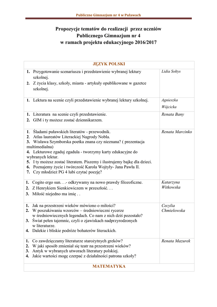 Publiczne Gimnazjum nr 4 w Puławach Propozycje tematów do realizacji przez uczniów Publicznego Gimnazjum nr 4 w ramach projektu edukacyjnego 2016/2017 JĘZYK POLSKI 1. Przygotowanie scenariusza i przedstawienie wybranej lektury szkolnej. 2. Z życia klasy, szkoły, miasta - artykuły opublikowane w gazetce szkolnej. Lidia Sołtys 1. Lektura na scenie czyli przedstawienie wybranej lektury szkolnej. Agnieszka Wójcicka 1. Literatura na scenie czyli przedstawienie. 2. GIM i ty możesz zostać dziennikarzem. Renata Bany 1. Śladami puławskich literatów - przewodnik. 2. Atlas laureatów Literackiej Nagrody Nobla. 3. Wisława Szymborska poetka znana czy nieznana? ( prezentacja multimedialna) 4. Lekturowe zgaduj zgadula - tworzymy karty edukacyjne do wybranych lektur. 5. I ty możesz zostać literatem. Piszemy i ilustrujemy bajkę dla dzieci. 6. Poznajemy życie i twórczość Karola Wojtyły- Jana Pawła II. 7. Czy młodzież PG 4 lubi czytać poezję? Renata Marcinko 1. Cogito ergo sun. . .- odkrywamy na nowo prawdy filozoficzne. 2. Z Henrykiem Sienkiewiczem w przeszłość. . . 3. Miłość niejedno ma imię . . Katarzyna Witkowska 1. Jak na przestrzeni wieków mówiono o miłości? 2. W poszukiwaniu wzorców – średniowieczni rycerze w średniowiecznych legendach. Co nam z nich dziś pozostało? 3. Świat pełen tajemnic, czyli o zjawiskach nadprzyrodzonych w literaturze. 4. Dalekie i bliskie podróże bohaterów literackich. Cecylia Chmielowska 1. 2. 3. 4. Renata Mazurek Co zawdzięczamy literaturze starożytnych greków? W jaki sposób zmieniał się teatr na przestrzeni wieków? Antyk w wybranych utworach literatury polskiej. Jakie wartości mogę czerpać z działalności patrona szkoły? MATEMATYKA Publiczne Gimnazjum nr 4 w Puławach Elżbieta Kaczorowska 1. Procenty wokół nas. 2. Świat w liczbach. 3. Zależności funkcyjne wokół nas. 4. Początki matematyki. 1. Matematyka może być ciekawa (bryły). 2. Mierzymy, ważymy, obliczamy a przy tym o zdrowie dbamy (miara, waga, jednostki). 3. Piramidy i wielościany foremne. Budowa brył własności ostrosłupów i graniastosłupów 4. Ciekawostki matematyczne – gazetka szkolna (specjalne wydanie). Ciekawe zadania matematyczne, krzyżówki, rebusy. Iwona Mierzejewska 1. Symetrie w życiu codziennym. 2. Czy współczesny człowiek jest człowiekiem witruwiańskim?. Agnieszka Peplińska 1. 2. 3. 4. Marta Gładysz Projekt kompleksu sportowego szkoły moich marzeń. Kupno mieszkania w realiach kredytów bankowych. Wycieczka klasowa w aspekcie matematycznym. Potyczki matematyczne. 1. Matematyka, która procentuje czyli nasze zyski w bankach. 2. Nasze gimnazjum w liczbach. Katarzyna Sałek 1. Jak człowiek nauczył się liczyć? 2. Po co mi matematyka? Spostrzeżenia gimnazjalisty. 3. Geometria – inspiracja architektów. JĘZYK NIEMIECKI Barbara Komsta 1. 2. 3. 4. 5. 6. Urszula KarskaWnuk Małgorzata Kędzierska Marzena Szymczak Wycieczka do Berlina-plan zwiedzania. Sławni Niemcy. Tradycyjne potrawy niemieckie – książka kucharska. Znani piłkarze niemieccy. Niemcy – najpiękniejsze zabytki – przygotowanie albumu. Niemieccy laureaci Nagrody Nobla. CHEMIA 1. Zjawisko promieniotwórczości naturalnej i sztucznej. Wkład pracy małżeństwa Curie. 2. Kwasy nieograniczone: podział kwasów, reakcje otrzymywania, właściwości wybranych kwasów. 3. Metoda otrzymywania soli. 4. Szereg aktywności chemicznej metali jego praktyczne zastosowanie. 5. Sole w nas i wokół nas. 6. Występowanie węgla w przyrodzie. Iwona Wójciak Publiczne Gimnazjum nr 4 w Puławach 7. Związki organiczne wykorzystywane w żywności. 8. Czym pachną kwiaty i owoce – zapachy. 1. Czy picie napojów energetyzujący jest zdrowe? 2. Czy telewizja kłamie ??? Najczęstsze błędy chemiczne pojawiające się w mediach i przekłamania zawarte w reklamach. 3. Czy Zakłady Azotowe w Puławach dbają o środowisko naturalne? 4. Jak spowalniamy procesy, które nam sprzyjają ? 5. Jak skutecznie i bezpiecznie stosować środki czystości? 6. Jak poczuć chemię do chemii ? 1. Blaski i cienie promieniotwórczości. 2. Niezwykła substancja – woda. 3. Chemia w żywności. Monika Kareta Agnieszka Szczerbetka JĘZYK FRANCUSKI 1. 2. 3. 4. 5. Odkrycia małżeństwa Curie (gazetka). Wybrany region Francji - prezentacja. Zabytki Paryża (pokaz multimedialny). Wybrane bajki la Fontaine’a (wieczorek poezji). Dzień Ziemi (zagrożenia środowiska naturalnego, podejmowane przedsięwzięcia na rzecz ochrony środowiska w Polsce i Francji – prezentacja). WYCHOWANIE FIZYCZNE Urszula Czerniak 1. Wpływ nałogów na zdrowie i sprawność człowieka. Marcin Grobel 1. Zasady prawidłowego odżywiania się w okresie dojrzewania Marcin Lewtak 1. Formy aktywności fizycznej jako czynnik kształtujący nie tylko ciało ale i osobowość. 1. Piłka nożna dziewcząt jako nowa forma aktywności. Waldemar Gola Arkadiusz Burek 1. Letnie Igrzyska Olimpijskie. Dorobek medalowy Polaków i sylwetki złotych medalistów. Anna Nowak 1. Historia letnich nowożytnych igrzysk olimpijskich – udział Polaków w igrzyskach Robert Krasucki 1. Życie sportowe na stronie internetowej naszej szkoły w roku szkolnym 2014/2015 . BIOLOGIA Martyna Majewska 1. Osobliwości botaniczne Parku Czartoryskich w Puławach.. 2. Rośliny w obiektywie. 3. Szata roślinna najbliższej okolicy. Teresa Adamczyk Dorota Publiczne Gimnazjum nr 4 w Puławach 4. Trzymaj formę- żyj zdrowo. Włodarczyk HISTORIA 1. Dogonić przeszłość-dokumentowanie puławskich zabytków 1. Puławy - miasto nad Wisłą. 2. Puławskie cmentarze. 1. 2. 3. 4. Unia Europejska w Puławach. Prawa konsumenta. Ocalić od zapomnienia - historia miejsc ginących. Skąd pochodzą mieszkańcy Puław? Agnieszka Przeździecka Adam Skowyra Dorota Zaroda GEOGRAFIA 1. Lubelszczyzna moja mała ojczyzna. 2. Puławy moje miasto. 3. Powstanie i rozwój Unii Europejskiej. Leszek Rukasz FIZYKA 1. 2. 3. 4. 5. Indukcja elektromagnetyczna. Maszyny proste. P