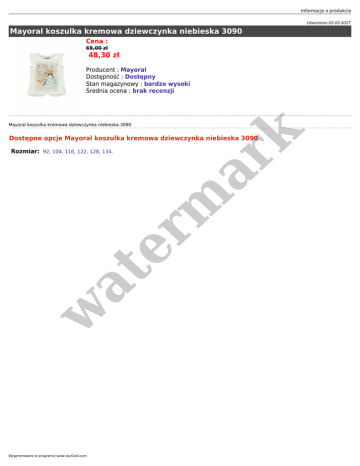 Informacje o produkcie Utworzono 02-03-2017 Mayoral koszulka kremowa dziewczynka niebieska 3090 Cena : 69,00 zł 48,30 zł Producent : Mayoral Dostępność : Dostępny Stan magazynowy : bardzo wysoki Średnia ocena : brak recenzji er m ar k Mayoral koszulka kremowa dziewczynka niebieska 3090 Dostępne opcje Mayoral koszulka kremowa dziewczynka niebieska 3090 w at Rozmiar: 92, 104, 116, 122, 128, 134. Wygenerowano w programie www.oscGold.com