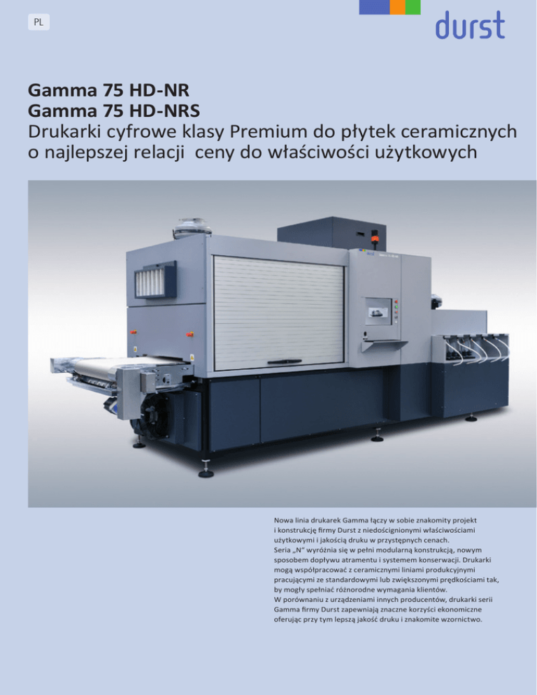 PL Gamma 75 HD-NR Gamma 75 HD-NRS Drukarki cyfrowe klasy Premium do płytek ceramicznych o najlepszej relacji ceny do właściwości użytkowych Nowa linia drukarek Gamma łączy w sobie znakomity projekt i konstrukcję firmy Durst z niedoścignionymi właściwościami użytkowymi i jakością druku w przystępnych cenach. Seria „N“ wyróżnia się w pełni modularną konstrukcją, nowym sposobem dopływu atramentu i systemem konserwacji. Drukarki mogą współpracować z ceramicznymi liniami produkcyjnymi pracującymi ze standardowymi lub zwiększonymi prędkościami tak, by mogły spełniać różnorodne wymagania klientów. W porównaniu z urządzeniami innych producentów, drukarki serii Gamma firmy Durst zapewniają znaczne korzyści ekonomiczne oferując przy tym lepszą jakość druku i znakomite wzornictwo. Nowa rewolucyjna technologia głowic drukujących z podwójną recyrkulacją atramentu W drukarkach Durst Gamma 75 HD-NR i Gamma 75 HD-NRS zastosowano najnowszej generacji technologię głowic drukujących HD (HD - wysoka rozdzielczość) z unikalną podwójną recyrkulacją atramentu, która zapewnia stałą objętość kropel i maksymalna wydajność, znakomite właściwości użytkowe, elastyczność drukowania i niezawodność. W porównaniu do innych technologii na rynku, ten innowacyjny system podwójnej recyrkulacji atramentu zapewnia stałą wielkość kropli na całej głowicy drukującej przy wszystkich możliwych kombinacjach dysz natryskowych w celu osiągnięcia perfekcyjnej równomierności nanoszenia tuszu na całej szerokości drukowania. Ponadto strumień natryskiwanego tuszu nie wpływa na recyrkulację atramentu wewnątrz głowicy drukującej, co jest szczególnie ważne przy zapobieganiu sedymentacji podczas pracy z atramentami o dużej zawartości pigmentów. Minimalizuje to czas rozruchu i bieżące prace konserwacyjne, co przekłada się na zmniejszone zużycie tuszu. Jedyna w swoim rodzaju konfiguracja głowicy drukującej z przeplotem poprzecznym tzw. „transversal interlacing“ umożliwia uzyskanie nadruku o najwyższej jednorodności. Inną ważną cechą jest wysoka jakość, równomierność drukowania i stabilność kolorów na całej szerokości nadruku dzięki opatentowanej konfiguracji głowic drukujących z technologią „transversal interlacing“. Zapewnia to dużą elastyczność przy wyborze i produkcji danego wzoru. Konfiguracja głowic drukujących bez technologii „transversal interlacing“ sprawia, że zmiany gęstości wskutek nierówności głowic drukujących są widoczne na dekorze płytek. Tylko technologia konstrukcji głowic firmy Durst pozwala na skośne ustawienie głowic drukujących umożliwiając uzyskanie wspomnianych powyżej korzyści. Znakomita wydajność i intensywność kolorów Ta część wymaga małej ilości atramentu Ta czarna żyłka wymaga dużej ilości atramentu Dzięki niezrównanej zdolności nanoszenia atramentu uzyskujemy intensywne i żywe kolory, wysoki kontrast i głębię obrazu już z kilku gramów, a nawet kilku dziesiątych grama tuszu na m2 (z prędkością do 4 razy większą niż inne drukarki na rynku). I uzyskuje się to z jednym tylko szeregiem głowic drukujących na kolor. Zdolność drukarki do nanoszenia dużych ilości atramentu przy wymaganych prędkościach linii produkcyjnej z glazurą jest potrzebna nie tylko w przepadku ciemniejszych, lecz również jaśniejszych wzorów z ciemniejszymi liniami, jak biały marmur (np. Calacatta) z czarnymi żyłkami, gdzie w przypadku niedostatecznych ilości atramentu na m2 może występować niewystarczającą gęstość i za mały kontrast, dając w rezultacie płaski, sztuczny wygląd bez efektu trójwymiarowości. Ponadto ta unikalna właściwość oferowana przez drukarki serii Gama umożliwia stosowanie różnorodnych wzorów na tym samym białym podłożu glazurowanym. Durst Inne drukarki Szybsze drukowanie ciemniejszych wzorów - Duża prędkość drukowania do 90 m/min, bez kompromisów jakościowych Drukarki Gamma 75 HD-NR i Gamma 75 HD-NRS są skonstruowane do pracy w trybie ciągłym (24 godziny na dobę) z dużymi prędkościami liniowymi do nanoszenia dużych ilości atramentu na m2. To jedyne drukarki do płytek ceramicznych, w których NIE ma konieczności stosowania więcej niż jednego szeregu głowic drukujących na kolor do nanoszeniu wymaganych ilości atramentu przy wysokich prędkościach liniowych. Zaawansowana technologia pośrednich tonów szarości Contone Grayscale w wysokiej rozdzielczości Zmieniając wielkość nanoszonych kropli zamiast liczby kropli lub liczby przejść głowicy drukującej w celu wytworzenia każdego piksela, nowa zaawansowana technologia modulacji (różnicowania) wielkości kropli zapewnia większą stabilność kolorów i umożliwia subtelne stopniowanie tonów dla osiągnięcia realistycznych efektów 3D z zachowaniem wyrazistych i ostrych szczegółów. Ta nowa przełomowa technologia druku o wysokiej rozdzielczości z 4-stopniową skalą szarości, znacznie wyższą objętością kropli dla uzyskania mocnych, nasyconych kolorów (28-90 pl) i niezwykle wysoką częstotliwością nanoszenia zapewnia doskonałe nasycenie obrazu, wysoką gęstość i odwzorowanie najdrobniejszych szczegółów oraz delikatne przejścia kolorystyczne z pełnym zakresem tonów bez widocznej ziarnistości. Technologia zapewnia również bardziej stabilne rozwiązanie przy wyjątkowej wydajności w porównaniu z konkurencyjnymi metodami stopniowania szarości z modulacją wielkości kropli poprzez wytwarzanie pojedynczej kropli z wysoką prędkością zamiast dużej ilości kropel ze znacznie mniejszą prędkością. Jakość obrazu jest określana nie tylko przez rozdzielczość podstawową i rozpiętość skali szarości, lecz również przez inne ważne parametry takie, jak prostolinijność spadania kropli, prędkość kropli, możliwości zakresu kontrastu, intensywność kolorów/przestrzeń barwna, p