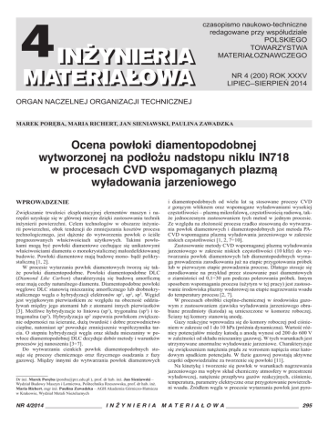 4 czasopismo naukowo-techniczne redagowane przy współudziale POLSKIEGO TOWARZYSTWA MATERIAŁOZNAWCZEGO NR 4 (200) ROK XXXV LIPIEC–SIERPIEŃ 2014 ORGAN NACZELNEJ ORGANIZACJI TECHNICZNEJ MAREK PORĘBA, MARIA RICHERT, JAN SIENIAWSKI, PAULINA ZAWADZKA Ocena powłoki diamentopodobnej wytworzonej na podłożu nadstopu niklu IN718 w procesach CVD wspomaganych plazmą wyładowania jarzeniowego Wprowadzenie Zwiększanie trwałości eksploatacyjnej elementów maszyn i narzędzi uzyskuje się w głównej mierze dzięki zastosowaniu technik inżynierii powierzchni. Celem technologów w obszarze inżynierii powierzchni, obok tendencji do zmniejszania kosztów procesu technologicznego, jest dążenie do wytworzenia powłok o ściśle prognozowanych właściwościach użytkowych. Takimi powłokami mogą być powłoki diamentowe cechujące się unikatowymi właściwościami diamentu o monokrystalicznej małozdefektowanej budowie. Powłoki diamentowe mają budowę mono- bądź polikrystaliczną [1, 2]. W procesie wytarzania powłok diamentowych tworzą się także powłoki diamentopodobne. Powłoki diamentopodobne DLC (Diamond Like Carbon) charakteryzują się budową amorficzną oraz mają cechy naturalnego diamentu. Diamentopodobne powłoki węglowe DLC stanowią mieszaninę amorficznego lub drobnokrystalicznego węgla o hybrydyzacji elektronów sp1, sp2, sp3. Węgiel jest wyjątkowym pierwiastkiem ze względu na obecność oddziaływań między jego atomami lub z atomami innych pierwiastków [3]. Możliwe hybrydyzacje to liniowa (sp1), trygonalna (sp2) i tetragonalna (sp3). Hybrydyzacja sp3 zapewnia powłokom zwiększenie odporności na ścieranie, dużą twardość i dobre przewodnictwo cieplne, natomiast sp2 powoduje zmniejszenie współczynnika tarcia. O stopniu hybrydyzacji węgla oraz składu mieszaniny w powłoce diamentopodobnej DLC decyduje dobór metody i warunków procesów jej nanoszenia [3÷7]. Do wytwarzania cienkich powłok diamentopodobnych stosuje się procesy chemicznego oraz fizycznego osadzania z fazy gazowej. Między innymi do wytwarzania powłok diamentowych Dr inż. Marek Poręba ([email protected] ), prof. dr hab. inż. Jan Sieniawski – Wydział Budowy Maszyn i Lotnictwa, Politechnika Rzeszowska, prof. dr hab. inż. Maria Richert, mgr inż. Paulina Zawadzka – AGH Akademia Górniczo-Hutnicza w Krakowie, Wydział Metali Nieżelaznych NR 4/2014 i diamentopodobnych od wielu lat są stosowane procesy CVD z gorącym włóknem oraz wspomagane wyładowaniami wysokiej częstotliwości – plazmą mikrofalową, częstotliwością radiową, także jednoczesnym zastosowaniem tych metod w jednym procesie. Ze względu na złożoność procesu rzadko stosowaną do wytwarzania powłok diamentowych i diamentopodobnych jest metoda PACVD wspomagana plazmą wyładowania jarzeniowego w zakresie niskich częstotliwości [1, 2, 7÷10]. Zastosowanie metody CVD wspomaganej plazmą wyładowania jarzeniowego w zakresie niskich częstotliwości (10 kHz) do wytwarzania powłok diamentowych lub diamentopodobnych wymaga prowadzenia zarodkowania już na etapie przygotowania próbek lub w pierwszym etapie prowadzenia procesu. Dlatego stosuje się zarodkowanie na przykład przez stosowanie past diamentowych o ziarnistości od 0,1÷30 µm podczas polerowania próbek. Innym sposobem wspomagania procesu (użytym w tej pracy) jest zastosowanie środowiska plazmy wodorowej na etapie nagrzewania wsadu do temperatury procesu [2, 7]. W procesach obróbki cieplno-chemicznej w środowisku gazowym z zastosowaniem zjawiska wyładowania jarzeniowego obrabiane przedmioty (katoda) są umieszczone w komorze roboczej. Ściany tej komory stanowią anodę. Gazy reakcyjne wprowadza się do komory roboczej pod ciśnieniem w zakresie od 1 do 10 hPa (próżnia dynamiczna). Wartość różnicy potencjałów miedzy katodą a anodą wynosi od 200 do 600 V w zależności od składu mieszaniny gazowej. W tych warunkach jest utrzymywane anormalne wyładowanie jarzeniowe. Charakteryzuje się zwiększeniem natężenia prądu ze wzrostem napięcia oraz katodowym spadkiem potencjału. W fazie gazowej powstają aktywne cząstki odpowiedzialne za tworzenie się powłoki [11]. Na kinetykę i tworzenie się powłok w warunkach nagrzewania jarzeniowego ma wpływ skład chemiczny atmosfery w przestrzeni wyładowczej, natężenie przepływu gazów reakcyjnych, ciśnienie, temperatura, parametry elektryczne oraz przygotowanie powierzchni wsadu. Źródłem węgla w procesie wytarzania powłok jest pyro- INŻYNIERIA MATERIAŁOWA 295 liza lotnych związków węgla, najczęściej CH4, dostarczanych do reaktora [11, 12]. materiał i metodyka badań Podłożem idealnym umożliwiającym wytworzenie powłoki diamentowej jest diament naturalny. Powstająca wtedy powłoka jest monokrystaliczną warstwą homoepitaksjalną lub polikrystaliczną, ale gruboziarnistą. Na innym podłożu powstają heteroepitaksjalne powłoki nanokrystaliczne lub mikrokrystaliczne [1]. Analiza danych literaturowych wskazuje, że pierwiastkami sprzyjającymi zarodkowaniu warstwy diamentowej są: kobalt, molibden, wolfram, nikiel, platyna, jak również stopy tych metali. Do badań jako materiał podłoża przyjęto nadstop niklu do przeróbki plastycznej IN718 o składzie chemicznym: Al – 0,63%, Fe – 16,87%, Cr – 21,46%, Mo – 2,56%, Ti – 1,29%, Nb – 4,71%, Ni – osnowa. W badaniach stosowano próbki w postaci krążków o średnicy 12,5 mm i grubości 5 mm. Próbki przed procesem polerowano i odtłuszczano. Przyjęto, że duża zawartość niobu w stopie niklu IN718 zapewni warunki do zarodkowania warstwy diamentopodobnej w procesie obróbki jarzeniowej. Proces wytwarzania powłoki diamentopodobnej prowadzono z zastosowaniem aparatury PACVD firmy Sulzer Metaplas Gmbh w Uczelnianym Laboratorium Badań Materiałów dla Przemysłu Lotniczego Politechniki Rzeszowskiej (rys. 1). Zastosowana do wytwarzania powłok aparatura jest urządzeniem produkcyjnym. Pojemność kom
