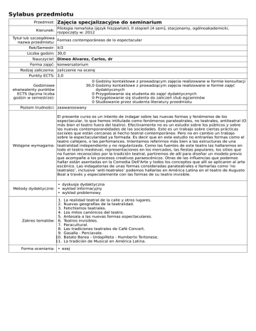 Sylabus przedmiotu Przedmiot: Zajęcia specjalizacyjne do seminarium Filologia romańska (język hiszpański), II stopień [4 sem], stacjonarny, ogólnoakademicki, Kierunek: rozpoczęty w: 2012 Tytuł lub szczegółowa Formas contemporáneas de lo espectacular nazwa przedmiotu: Rok/Semestr: II/3 Liczba godzin: 30,0 Nauczyciel: Dimeo Alvarez, Carlos, dr Forma zajęć: konwersatorium Rodzaj zaliczenia: zaliczenie na ocenę Punkty ECTS: 3,0 0 Godziny kontaktowe z prowadzącym zajęcia realizowane w formie konsultacji 30,0 Godziny kontaktowe z prowadzącym zajęcia realizowane w formie zajęć dydaktycznych 0 Przygotowanie się studenta do zajęć dydaktycznych 0 Przygotowanie się studenta do zaliczeń i/lub egzaminów 0 Studiowanie przez studenta literatury przedmiotu Godzinowe ekwiwalenty punktów ECTS (łączna liczba godzin w semestrze): Poziom trudności: zaawansowany El presente curso es un intento de indagar sobre las nuevas formas y fenómenos de los espectacular, lo que hemos intitulado como fenómenos parateatrales, no teatrales, antiteatral (O más bien el teatro fuera del teatro). Efectivamente no es un estudio sobre los públicos y sobre las nuevas contemporaneidades de las sociedades. Este es un trabajo sobre ciertas prácticas sociales que están cercanas al hecho teatral contemporáneo. Pero no en cambio un trabajo sobre la espectacularidad ya formada. Es decir que en este estudio no entranlas formas como el teatro callejero, o las perfomances. Intentamos referirnos más bien a las estructuras de una Wstępne wymagania: teatralidad independiente y no regularizada. Como las fuentes de este teatro las hallaremos en todo el teatro medieval, representaciones en los mercados, las fiestas populares, los sitios que no fueron reconocidos por la tradición teatral, partiremos de allí para diseñar un modelo previo que acompañe a los procesos creativos paraescénicos. Otras de las influencias que podemos hallar están asentadas en la Comedia Dell'Arte y todos los conceptos que allí se aplicaron al arte escénico. Las indagatorias de unas formas consideradas parateatrales o llamarlas como ‘no teatrales’, inclusive ‘anti-teatrales’ podemos hallarlas en América Latina en el teatro de Augusto Boal a través y especialemente con las formas de su teatro invisible. • dyskusja dydaktyczna Metody dydaktyczne: • wykład informacyjny • wykład problemowy 1. 2. 3. 4. 5. Zakres tematów: 6. 7. 8. 9. 10. 11. La realidad teatral de la calle y otros lugares. Nuevas geografías de la teatralidad. Fetichismos teatrales. Los mitos canónicos del teatro. Antesala a las nuevas formas espectaculares. Teatros invisibles. Paracultural. Las tradiciones teatrales de Café Concert. Gasalla - Perciavale. Batato Barea - Urdapilleta - Humberto Tortonese. La tradición de Musical en América Latina. Forma oceniania: • esej Arrabal, F.,Taylor, D. (1984).El cementerio de automóviles; El arquitecto y el emperador de Asiria . Madrid: Cátedra. Arrabal, F.,Taylor, D. (2007).El cementerio de automóviles. El Arquitecto y el Emperador de Asiria (6 ed.). Madrid;: Cátedra. Bartis, R.,Dubatti, J. A. (2003).Cancha con niebla: teatro perdido, fragmentos(1* ed ed.). Buenos Aires: Atuel. Cañizares Bundorf, N., Abellan, J., Pascual Bonis, M. T., Fernández Torres, A., Cracio, J.,Pavis, P. (1995).Análisis de la puesta en escena. Madrid: Asociación de Directores de Escena. Carlson, M. (1993).Deathtraps the portmodern comedy thriller. Bloomington: Indiana University Press. Carlson, M.,Bettendorf, P. (2009).El teatro como máquina de la memoria: los fantasmas de la escena. [Buenos Aires]: Ediciones Artes del Sur. Cura, M., Dubatti, J., Daulte, J.,Ramos, M. (1994). Así se mira el teatro hoy: selección de obras. Buenos Aires: Beas Ediciones. Literatura: Dubatti, J.,Alifano, R. (1999).Acerca de Borges: ensayos de poética, política y literatura comparada. Capital Federal [i.e. Buenos Aires]: Editorial de Belgrano. Dubatti, J. A. (1995).Batato Barea y el nuevo teatro argentino. Buenos Aires: Temas de Hoy. Pavis, P. (2003).Analyzing performance: theater, dance, and film. Ann Arbor: University of Michigan Press. Pavis, P.,Pascual, M. (2003).¿De dónde viene la puesta en escena y hacia dónde va? Pamplona: Escuela Navarra de Teatro. Pavis, P., Shantz, C.,Carlson, M. (1998).Dictionary of the theatre: terms, concepts and analysis . Toronto; Buffalo: University of Toronto Press. Sanchís Sinisterra, J., Pavis, P., Amo Sánchez, A.,Instituto Cervantes De Toulouse. (2003). Conspiración carmín = Conspiración vermeille; Sangre lunar = Sang de lune . Toulouse: Instituto Cervantes. Taylor, D. (1997).Disappearing acts : spectacles of gender and nationalism in Argentina's Dirty War. Durham ; London: Duke University Press. Ubersfeld, A.,Pavis, P. (1900).Confluences: le dialogue des cultures dans les spectacles contemporains: essais en l'honneur d'Anne Ubersfeld . Saint Cyr: Bois Robert.