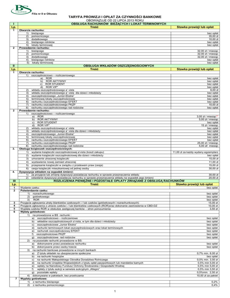 taryfa 22072013 Olkusz - Bank Spółdzielczy w Skawinie