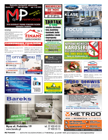 Regionalny dwutygodnik og³oszeniowy Styczeń 2017 ISSN 1507-2304 wyd. 11.01.2017r siê y m e uj lat ukaz od 19 NYSA G£UCHO£AZY PRUDNIK OTMUCHÓW PACZKÓW egzemplarz bezp³atny RÓŻNE AKUMULATOR Bosh 95Ah 800A 2 letni. Cena: 160zł. Tel. 888 240 093. KOSIARKA elektryczna nowa Bosch, Rotak 34. Cena: 299zł. Tel. 698 238 833. ODKURZACZ- dmuchawa do liści Husgvarna FIYMO o mocy 2800 W. Cena: 185zł. Tel. 698 238 833. MEBLE i wersalkę oddam za darmo. Tel. 725 KURTKA z lisa. Cena: 200zł. Tel. 602 611 384. 443 191. KUCHENKA KOŁDRY z wełny 2 szt. Cena: 110zł./ szt. do niki gazowe, 2 palniki elektryczne, elektryczny neg. Tel. 602 611 384. piekarnik, stan bdb., Prudnik. Cena: 150zł. Tel. gazowo- elektryczna, 2 pal- nieruchomosci więcej informacji str 7 516 802 470. WAGA gospodarcza do 200kg. Cena: 100zł. Głuchołazy. Tel. 77 439 18 98. KLATKA dla psa, 1m3, pręty bez ocieplenia. Cena: 100zł. Głuchołazy. Tel. 77 439 18 98. MASZYNA do szycia Łucznik, używana. Cena: 150zł. Tel. 77 439 18 98. GARNEK gliniany 20L. Cena: 100zł. Tel. 77 439 18 98. KUCHNIA elektryczna, 4-palnikowa + piekarnik, brązowa, nieużywana, nowa. Cena: 400zł. Tel. 77 439 18 98. BLAT nowy, marmurowy, kolorowy średni brąz, 2 60x180cm. Cena: 800zł. Tel. 77 439 18 98. GRZEJNIK elektryczny, przenośny. Cena: WERSALKA używana, Głuchołazy. Cena: 100zł. Tel. 77 439 18 98. 100zł. Tel. 77 439 18 98. WIESZAK do przedpokoju. Cena: 50zł. Tel. 77 SZCZEGÓŁOWA OFERTA str. 12 BEZPŁATNE OGŁOSZENIA DROBNE, tel. 77 448 09 09 pn. - pt. od 8.00 - 16.00, [email protected], www.mojprzewodnik.pl BEZPŁATNE OGŁOSZENIA DROBNE „MÓJ PRZEWODNIK” tel. 077 448 09 09 [email protected] 439 18 98. SZAFKA pod TV. Cena: 100zł. Tel. 77 439 18 98. NARTY Pol-sport długość 170 cm. Cena: 30zł. Tel. 77 439 18 98. KRZESEŁKO dla dzieci Chico. Cena: 50zł. Tel. 728 973 622. BOJLER elektryczny 45 litrów Siemens. Cena: 150zł. Tel. 728 973 622. KUCHENKA gazowa Predom ,używana. Cena: 150zł. Tel. 728 973 622. FOTELIK samochodowy dla dzieci od 9-25 kg. Cena: 100zł. Tel. 728 973 622. SPAWARKA Bester heawy duty STB-250 380V 50HZ. Cena: 400zł. Tel. 699 726 060. KOMPRESOR Airex dair V 24L. PS-8 bar. Cena: 300zł. Tel. 699 726 060. POMPA pływakowa Ola, wydajność 40 limin podnoszenie 25 m. Cena: 300zł. Tel. 699 726 060. ORZECHY włoskie. Cena: 8zł./kg. Tel. 606 173 str. BEZPŁATNE OGŁOSZENIA DROBNE, tel. 77 448 09 09 pn. - pt. od 8.00 - 16.00, [email protected], www.mojprzewodnik.pl BEZPŁATNE OGŁOSZENIA DROBNE „MÓJ PRZEWODNIK” tel. 077 448 09 09 [email protected] 489. RADIO samochodowe w pudełku. Cena: 70zł. Tel. 606 173 489. URZĄDZENIE wielofunkcyjne Roboclean, usuwanie kurzu i roztoczy z mebli, łóżek itp., funkcje odświeżenia i jonizacji. Cena: 5.000zł. Tel. 77 433 35 12 lub 664 980 097. ZADASZENIA nad drzwiowe kryte nie. Cena: 65zł. Tel. 606 879 304. OKNO plastikowe zespolone nieotwierane (fix), 200 x 100 cm. Cena: 99zł. Tel. 606 879 304. STARE monety, lata 70-80 - sprzedam. Cena: 15zł./szt. Tel. 515 685 724. SPODNIE skórzane, czarne, damskie, nowe. Cena: 150zł. Tel. 515 685 724. KLASYKA Polska, piękna oprawa, Prus, Reymont, Orzeszkowa, Sienkiewicz, Słowacki, Norwid 30szt. Cena: 1.200zł. do neg. Tel. 515 685 724. TELEFON zabytkowy na ścianę, drewniany z dwoma słuchawkami, okucia metalowe. Cena: 800zł. Tel. 515 685 724. ZASŁONY bordowe, nowe, szer. 4m, piękny krój. Cena: 150zł. Tel. 515 685 724. GARNITUR męski, nowy, kolor popiel, kl. piersiowa 120cm, spodnie szer. 100 cm, 175 cm wzrostu. Cena: 150zł. Tel. 515 685 724. poliwęglanem + boczne owiewki. Cena: 320zł. MARYNARKA zielona nieużywana, wzrost 175 Tel. 606 879 304. cm. Cena: 100zł. Tel. 515 685 724. KLIMATYZACJA LG 50 x 60 x 40 cm, spraw- KURTKA skórzana, krótka, brązowa. Cena: na, stan dobry. Cena: 430zł. Tel. 606 879 304. 150zł. Tel. 515 685 724. KUCHNIA gazowa 3 palnikowa w dobrym sta- RADIO, 2głośniki, wielofunkcyjne. Cena: 100zł. Tel. 515 685 724. WIDEO w dobrym stanie. Cena: 150zł. Tel. 515 685 724. TELEFON stacjonarny, stan dobry. Cena: 30zł. Tel. 515 685 724. UBRANKA dziecięce dla dziewczynki i chłopca od 0-1,5 roku kupowane w Irlandii, duży wybór ( body z krótkim i długim rękawem, bluzeczki, sweterki, spodnie, kombinezony, kurtki). Cena: od 2zł. do 10zł. Tel. 728 205 785. KAMERKA internetowa USB z wbudowanym mikrofonem. Cena: 30zł. Tel. 512 551 395. MONETY 2 złotowe, rocznik 2005-2013, sprzedam lub zamienię na inne. Cena od 2,50zł. Tel. 512 551 395. KARTKI stare pocztowe przedstawiające Nysę - kupię. Tel. 512 551 395. RZUTNIK do wyświetlania bajek – kupię, bajki na kliszy. Tel. 512 551 395. KOSIARKA elektryczna do trawy Qualcast, moc 1400W, nóż 34cm, kosz, sprawna. Cena: 130zł. Tel. 512 551 395. TELEFON komórkowy iPhone Apple S4, kompletny z ładowarką, słuchawki, stan bdb., z pełną dokumentacją. Cena: 370zł. Tel. 661 426 111. DRZWI tarasowe dwuskrzydłowe, 3 szybowe z firmy Drutex, nowe po demontażu, 220 x 230 cm. Cena: 600zł. Tel. 788 355 151. KUPIĘ toaletkę pokojową w stylu retro z 3 lustrami w rozsądnej cenie. Tel. 77 435 87 08 dzwonić po godz. 20.00. KOŻUSZEK krótki damski rozm. 40. Cena: 100zł. Tel. 77 448 24 97 lub 668 463 152. WAGA elektroniczna do 15 kg. Cena: 500zł. Tel. 502 650 167. WAGA zegarowa do 50 kg Cena: 500zł. Tel. 502 650 167. WYPOCZYNEK skórzany 2- osobowy + 2 fotele. Cena: 800zł. Tel. 697 471 652. ŁÓŻKO sypialniane kolor brązowy 200 cm x 160 cm. Cena: 600zł. Tel. 697 471 652. MEBLE używane kolor niebieski szafa, biurko, półki na książki. Cena: 300zł. Tel. 697 471 652. BIURKO duże, ładne z dwiema dużymi szufladami, wysuwane półki na drukarkę i klawiaturę. Cena: 250zł. do neg. Tel. 692 934 696. BIURKO prawie nowe, kolor jasny. Cena: 90zł. Tel. 604 065 217. KINO domowe Samsung HT-X710. Cena: 120zł. Tel. 534 916 088. TELEFON bezprzewodowy Gigaset A-120. Cena: 32zł. Tel. 534 916 088. BUTLA na wino 50 litrów. Cena: 45zł. Tel. 534 916