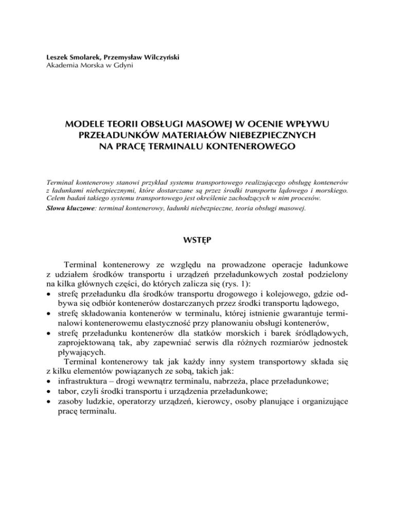 Leszek Smolarek, Przemysław Wilczyński Akademia Morska w Gdyni MODELE TEORII OBSŁUGI MASOWEJ W OCENIE WPŁYWU PRZEŁADUNKÓW MATERIAŁÓW NIEBEZPIECZNYCH NA PRACĘ TERMINALU KONTENEROWEGO Terminal kontenerowy stanowi przykład systemu transportowego realizującego obsługę kontenerów z ładunkami niebezpiecznymi, które dostarczane są przez środki transportu lądowego i morskiego. Celem badań takiego systemu transportowego jest określenie zachodzących w nim procesów. Słowa kluczowe: terminal kontenerowy, ładunki niebezpieczne, teoria obsługi masowej. WSTĘP Terminal kontenerowy ze względu na prowadzone operacje ładunkowe z udziałem środków transportu i urządzeń przeładunkowych został podzielony na kilka głównych części, do których zalicza się (rys. 1): • strefę przeładunku dla środków transportu drogowego i kolejowego, gdzie odbywa się odbiór kontenerów dostarczanych przez środki transportu lądowego, • strefę składowania kontenerów w terminalu, której istnienie gwarantuje terminalowi kontenerowemu elastyczność przy planowaniu obsługi kontenerów, • strefę przeładunku kontenerów dla statków morskich i barek śródlądowych, zaprojektowaną tak, aby zapewniać serwis dla różnych rozmiarów jednostek pływających. Terminal kontenerowy tak jak każdy inny system transportowy składa się z kilku elementów powiązanych ze sobą, takich jak: • infrastruktura – drogi wewnątrz terminalu, nabrzeża, place przeładunkowe; • tabor, czyli środki transportu i urządzenia przeładunkowe; • zasoby ludzkie, operatorzy urządzeń, kierowcy, osoby planujące i organizujące pracę terminalu. L. Smolarek, P. Wilczyński, Modele teorii obsługi masowej w ocenie wpływu przeładunków materiałów... 65 Rys. 1. Główne części terminalu kontenerowego i kierunki przepływu jednostek kontenerowych [1, 6] Fig. 1. The main part of the container terminal and flow directions container units [1, 6] 1. SKŁADOWE SYSTEMU TRANSPORTOWEGO TERMINALU KONTENEROWEGO W jednym z podstawowych elementów systemu transportowego, jakim jest tabor, można wydzielić dwa podstawowe składniki, pełniące określone funkcje: środki transportu wewnętrznego oraz magazyny. Środki transportu wewnętrznego realizują transport wewnątrz terminalu oraz przemieszczają jednostki kontenerowe (CTU) w pionie, przy realizacji przeładunków na placu składowym oraz podczas załadunku i wyładunku ich ze statku. Podstawowymi parametrami charakteryzującymi te środki są: • czas obsługi, wynikający z prędkości przemieszczania się środka transportu wewnętrznego lub czas trwania operacji podnoszenia i opuszczania kontenera przez urządzenia przeładunkowe; • pojemność/zdolność przewozowa. Do magazynów zalicza się wszystkie place składowe, środki transportu zewnętrznego: statki morskie, składy kolejowe oraz środki transportu drogowego. Wszystkie ww. środki transportu i place składowe charakteryzuje wspólna właściwość – zdolność do składowania/magazynowania jednorazowo pewnej liczby kontenerów, która waha się od kilku TEU dla środków transportu drogowego, przez kilkadziesiąt dla transportu kolejowego, po kilka tysięcy dla statków i placów składowych. Różni je natomiast możliwość wspólnego składowania czy też magazynowania: • wielu kontenerów o różnych wymiarach; • różnych typów kontenerów; • kontenerów o różnej zawartości ładunkowej; 66 ZESZYTY NAUKOWE AKADEMII MORSKIEJ W GDYNI, nr 87, grudzień 2014 • kontenerów zawierających ładunki nietypowe i ładunki niebezpieczne, itp. [5, 7]. Wśród najważniejszych parametrów operacyjnych, charakteryzujących elementy składowe systemu transportowego, można wymienić: • pojemność lub zdolność przewozową środków transportu i placów składowych, którą można wyrażać w liczbie jednostek TEU; • wydajność urządzeń przeładunkowych, która wyraża się w liczbie obsługiwanych TEU (lub zgłoszeń) na jednostkę czasu; • prędkość postępową środków transportu podczas przemieszczania się w terminalu mierzoną w km/h; • wysokość piętrzenia, zasięg, udźwig urządzeń przeładunkowych itp. – długość, szerokość i liczbę warstw w blokach składowania. 2. MODELE OBSŁUGI CTU W TERMINALU KONTENEROWYM Realizowany model obsługi kontenera z ładunkiem niebezpiecznym (ang. Dangerous Goods) w terminalu jest ściśle związany z jego klasą niebezpieczeństwa oraz ze środkiem transportu zewnętrznego, jakim został dostarczony do systemu transportowego. Jednostka kontenerowa (CTU) zawierająca materiały niebezpieczne jest traktowana jako zgłoszenie do takiego systemu transportowego. Wśród wszystkich możliwych modeli obsługi zgłoszeń (CTU), realizowanych w terminalu kontenerowym, można wyróżnić następujące rodzaje: • przeładunek bezpośredni – z pominięciem placu składowego; • przeładunek pośredni – ze składowaniem CTU na placu składowym; • przeładunek pośredni awaryjny – z koniecznością przemieszczenia i składowania CTU na awaryjnym placu składowania. 2.1. Model obsługi bezpośredniej Przeładunek bezpośredni jest najprostszym z możliwych modeli obsługi zgłoszeń w terminalu kontenerowym. Według tego modelu CTU z ładunkiem niebezpiecznym jest przeładowywana bezpośrednio z jednego środka transportu zewnętrznego na drugi, np. w relacji bezpośredniej statek – środek transportu drogowego lub odwrotnie. Ten model obsługi stosuje się do CTU zawierających ładunki niebezpieczne HRDG, których składowanie na placu składowym w terminalu kontenerowym jest zabronione. Wchodzące do systemu transportowego zgłoszenie, zawierające tego typu ładunek, jest przeważnie realizowane w pierwszej kolejności (obsługa z priorytetem) lub w porządku naturalnym FIFO (ang. First In First Out), o ile pozwala na to rozmieszczenie kontenerów z innymi ładunkami niebezpiecznymi na statku. L. Smolare