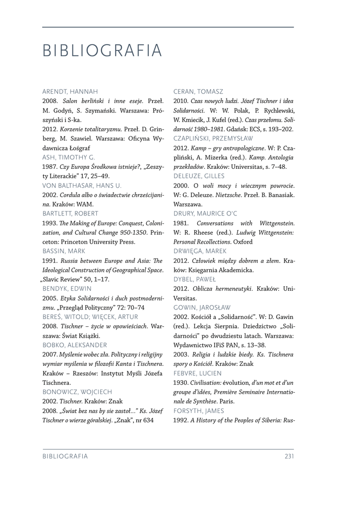 Bibliografia ARENDT, HANNAH 2008. Salon berliński i inne eseje. Przeł. M. Godyń, S. Szymański. Warszawa: Prószyński i S-ka. 2012. Korzenie totalitaryzmu. Przeł. D. Grinberg, M. Szawiel. Warszawa: Oficyna Wydawnicza Łośgraf ASH, TIMOTHY G. 1987. Czy Europa Środkowa istnieje?, „Zeszyty Literackie” 17, 25–49. VON BALTHASAR, HANS U. 2002. Cordula albo o świadectwie chrześcijanina. Kraków: WAM. BARTLETT, ROBERT 1993. The Making of Europe: Conquest, Colonization, and Cultural Change 950-1350. Princeton: Princeton University Press. BASSIN, MARK 1991. Russia between Europe and Asia: The Ideological Construction of Geographical Space. „Slavic Review” 50, 1–17. BENDYK, EDWIN 2005. Etyka Solidarności i duch postmodernizmu. „Przegląd Polityczny” 72: 70–74 BEREŚ, WITOLD; WIĘCEK, ARTUR 2008. Tischner – życie w opowieściach. Warszawa: Świat Książki. BOBKO, ALEKSANDER 2007. Myślenie wobec zła. Polityczny i religijny wymiar myślenia w filozofii Kanta i Tischnera. Kraków – Rzeszów: Instytut Myśli Józefa Tischnera. BONOWICZ, WOJCIECH 2002. Tischner. Kraków: Znak 2008. „Świat bez nas by sie zastoł…” Ks. Józef Tischner o wierze góralskiej. „Znak”, nr 634 BIBLIOGRAFIA CERAN, TOMASZ 2010. Czas nowych ludzi. Józef Tischner i idea Solidarności. W: W. Polak, P. Rychlewski, W. Kmiecik, J. Kufel (red.). Czas przełomu. Solidarność 1980–1981. Gdańsk: ECS, s. 193–202. CZAPLIŃSKI, PRZEMYSŁAW 2012. Kamp – gry antropologiczne. W: P. Czapliński, A. Mizerka (red.). Kamp. Antologia przekładów. Kraków: Universitas, s. 7–48. DELEUZE, GILLES 2000. O woli mocy i wiecznym powrocie. W: G. Deleuze. Nietzsche. Przeł. B. Banasiak. Warszawa. DRURY, MAURICE O’C 1981. Conversations with Wittgenstein. W: R. Rheese (red.). Ludwig Wittgenstein: Personal Recollections. Oxford DRWIĘGA, MAREK 2012. Człowiek między dobrem a złem. Kraków: Księgarnia Akademicka. DYBEL, PAWEŁ 2012. Oblicza hermeneutyki. Kraków: UniVersitas. GOWIN, JAROSŁAW 2002. Kościół a „Solidarność”. W: D. Gawin (red.). Lekcja Sierpnia. Dziedzictwo „Solidarności” po dwudziestu latach. Warszawa: Wydawnictwo IFiS PAN, s. 13–38. 2003. Religia i ludzkie biedy. Ks. Tischnera spory o Kościół. Kraków: Znak FEBVRE, LUCIEN 1930. Civilisation: évolution, d’un mot et d’un groupe d’idées, Première Seminaire Internationale de Synthèse. Paris. FORSYTH, JAMES 1992. A History of the Peoples of Siberia: Rus- 231 sia’s North Asian Colony 1581-1990. Cambridge: Cambridge University Press. GAŁECKI, SEBASTIAN 2012. Spór o sumienie. Kraków: Universitas. GAWIN, DARIUSZ 2013. Wielki zwrot. Kraów: Znak GOTTMANN, JEAN 1966. Essais sur l’amenagement de l’espace habité. Paryż: Mouton. GOUROU, PIERRE 1964. Changes in civilization and their influence on landscapes. „Impact of Science on Society” 14, 57–71. HABERMAS, JURGEN 2012. Świadomość tego, co zostało utracone. „Pressje”, teka 28., 228–233. HALECKI, OSKAR 1952. The Borderlands of Western Civilization. A History of East Central Europe. New York: Roland. HENNELOWA, JÓZEFA 2012. Otwarty, bo powszechny. O Kościele, który może boleć. Kraków: Wydawnictwo Literackie. HUNTINGTON, SAMUEL 2000. Zderzenie cywilizacji i nowy kształt ładu światowego. Warszawa: Warszawskie Wydawnictwo Literackie Muza. JAN PAWEŁ II 2012. Pielgrzymki do Ojczyzny. Przemówienia i homilie. Kraków: Znak. JUDT, TONY; SNYDER, TIMOTHY 2013. Rozważania o wieku XX. Poznań: Dom Wydawniczy Rebis. KARŁOWICZ, DARIUSZ 2004. Solidarność jako Kościół. W: D. Karłowicz. Koniec snu Konstantyna. Szkice z życia codziennego idei. Kraków: Ośrodek Myśli Politycznej, Księgarnia Akademicka, s. 189–211. KEMPSKI, MAREK 2010. Solidarność – wydarzenie etyczne. 232 W: Marek Kempski, Grzegorz Podżorny (red.). Uwiodła mnie Solidarność. Między mitem a rzeczywistością. Katowice: Zarząd Regionu Śląsko-Dąbrowskiego NSZZ Solidarność, s. 120–183. KŁOCZOWSKI, JAN OP 1993. Katolicyzm otwarty i jego wrogowie. „Znak” 458: 4–16. KONECZNY, FELIKS 1997. Prawa dziejowe. Komorów: Wydawnictwo „Antyk”. 2011. Polska między Wschodem a Zachodem. Krzeszowice: Dom Wydawniczy „Ostoja”. KUNDERA, MILAN 1984. Zachód porwany albo tragedia Europy Środkowej. “Zeszyty Literackie” 5, 14–31. VON LAUE, THEODORE H. 1987. The World Revolution of Westernization: The Twentieth Century in Global Perspective. Oxford: Oxford University Press. LEGUTKO, RYSZARD 2012. Triumf człowieka pospolitego. Poznań: Wydawnictwo Zysk i S-ka. LEWICKI, GRZEGORZ 2012. Powrót do Jagiellonów. Geopolityka Oskara Haleckiego. „Pressje”, Teka 30/31, 65–71. LEWIS, MARTIN W.; WIGEN KAREN E. 1997. The Myth of Continents. A Critique of Metageography. Berkeley: University of California Press. LĘGIEĆ, JAROSŁAW 2012. Człowiek w filozofii pracy Józefa Tischnera. Kraków: Wydawnictwo Księży Sercanów. DE LUBAC, HENRY 2012. Najnowsze paradoksy. Przeł. K. Dybeł, A. Ziernicki. Kraków: WAM. ŁUCZEWSKI, MICHAŁ 2010. Pan i Ożywiciel Solidarności. Anatomia odgórnej rewolucji. „Pressje” 21: 118–129. 2011a. Mesjanizm dla mas. Szaleństwo Jana Pawła II. „Pressje” 24: 58–65. PRESSJE 2014, TEKA232 39 2011b. Solidarność: socjalizm z boską twarzą. W: Jacek Kloczkowski (red.). Polska Solidarności. Kontrowersje, oblicza, interpretacje. Kraków: Ośrodek Myśli Politycznej, s. 217–244. MARCETTO, MICHELE 2011. The Philosophical Relevance of John Henry Newman. „Louvain Studies” 35, 315 –335. MASŁOWSKI, MICHAŁ 1984. Misja Solidarności. „Aneks” 34: 99–125 (pod pseud. Stanisław Ernest). MAZUR, KRZYSZTOF 2010. Aideologia solidarności. „Pressje” 21: 24–40. MICHNIK, ADAM 1984. Szanse polskiej demokracji. Londyn: „Aneks” 1998. Kościół, lewica, dialog. Lublin: Świat Książki. MICHNIAK, ADAM; KIEŻUN, PIOTR; KULISZ JAROSŁAW 2012. BOMBA LIBERALIZMU! Adam Michnik w rozmowie z Jarosławem Kuiszem i Piotrem Kieżunem. w
