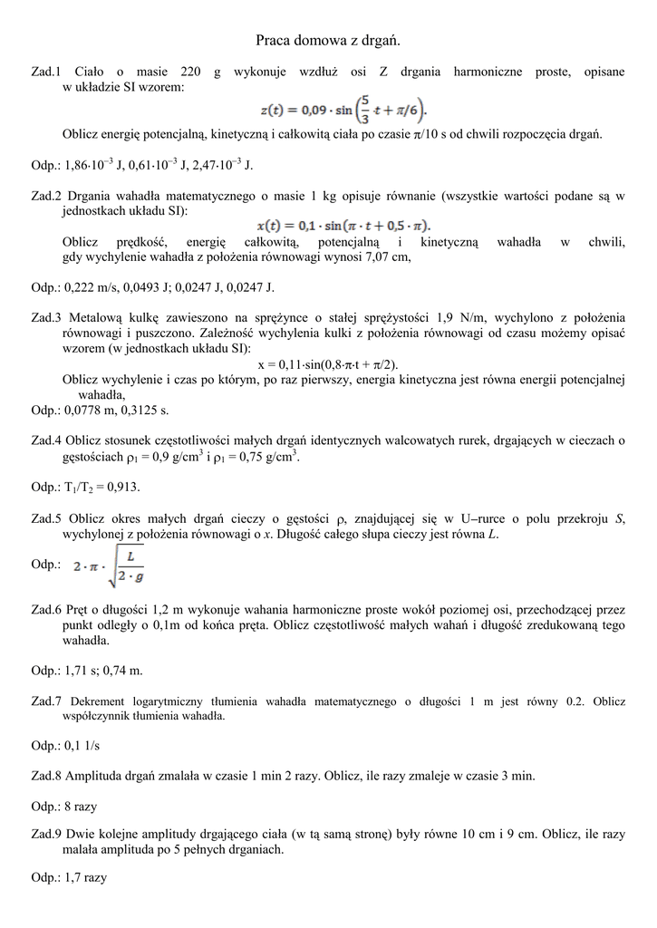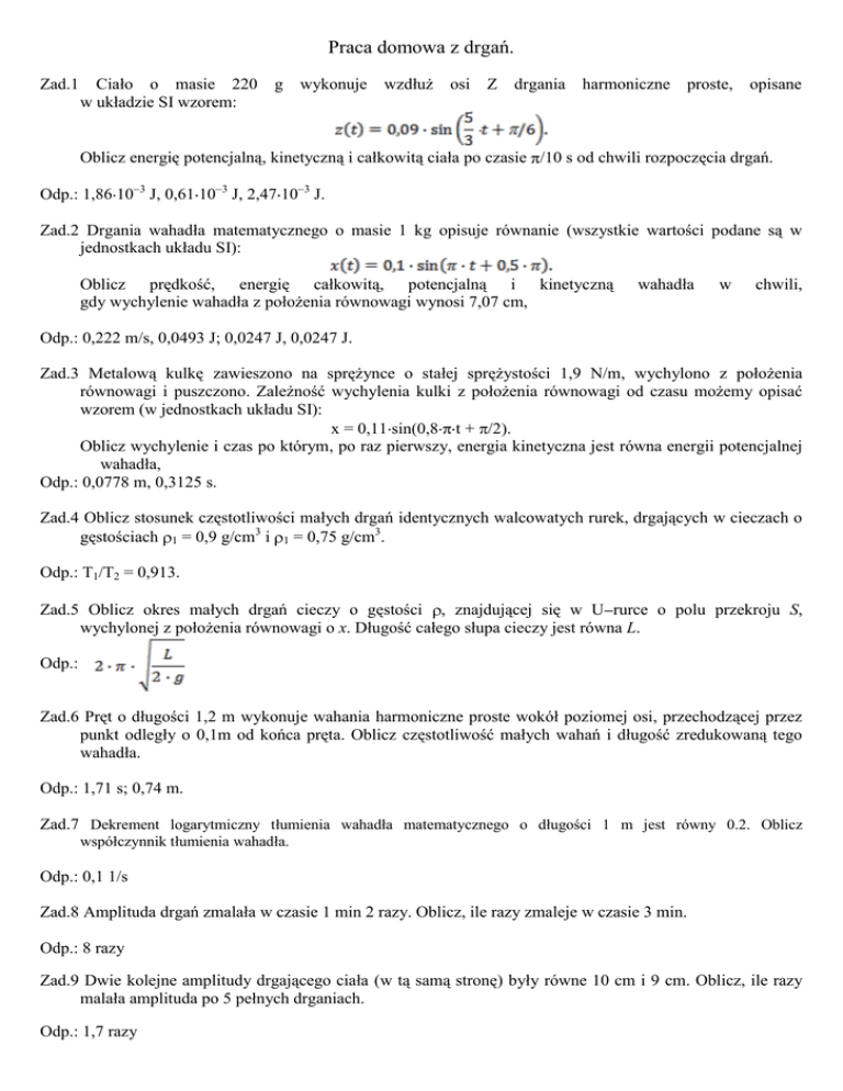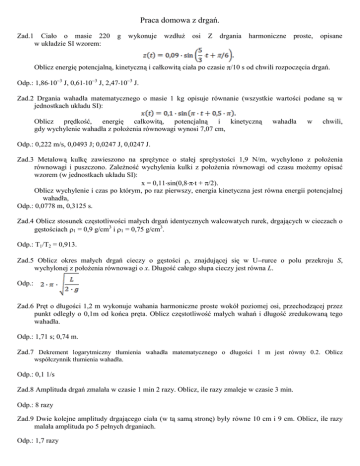 Praca domowa z drgań. Zad.1 Ciało o masie 220 w układzie SI wzorem: g wykonuje wzdłuż osi Z drgania harmoniczne proste, opisane Oblicz energię potencjalną, kinetyczną i całkowitą ciała po czasie /10 s od chwili rozpoczęcia drgań. Odp.: 1,86 10 3 J, 0,61 10 3 J, 2,47 10 3 J. Zad.2 Drgania wahadła matematycznego o masie 1 kg opisuje równanie (wszystkie wartości podane są w jednostkach układu SI): Oblicz prędkość, energię całkowitą, potencjalną i kinetyczną gdy wychylenie wahadła z położenia równowagi wynosi 7,07 cm, wahadła w chwili, Odp.: 0,222 m/s, 0,0493 J; 0,0247 J, 0,0247 J. Zad.3 Metalową kulkę zawieszono na sprężynce o stałej sprężystości 1,9 N/m, wychylono z położenia równowagi i puszczono. Zależność wychylenia kulki z położenia równowagi od czasu możemy opisać wzorem (w jednostkach układu SI): x = 0,11 sin(0,8 t + /2). Oblicz wychylenie i czas po którym, po raz pierwszy, energia kinetyczna jest równa energii potencjalnej wahadła, Odp.: 0,0778 m, 0,3125 s. Zad.4 Oblicz stosunek częstotliwości małych drgań identycznych walcowatych rurek, drgających w cieczach o gęstościach 1 = 0,9 g/cm3 i 1 = 0,75 g/cm3. Odp.: T1/T2 = 0,913. Zad.5 Oblicz okres małych drgań cieczy o gęstości , znajdującej się w U rurce o polu przekroju S, wychylonej z położenia równowagi o x. Długość całego słupa cieczy jest równa L. Odp.: Zad.6 Pręt o długości 1,2 m wykonuje wahania harmoniczne proste wokół poziomej osi, przechodzącej przez punkt odległy o 0,1m od końca pręta. Oblicz częstotliwość małych wahań i długość zredukowaną tego wahadła. Odp.: 1,71 s; 0,74 m. Zad.7 Dekrement logarytmiczny tłumienia wahadła matematycznego o długości 1 m jest równy 0.2. Oblicz współczynnik tłumienia wahadła. Odp.: 0,1 1/s Zad.8 Amplituda drgań zmalała w czasie 1 min 2 razy. Oblicz, ile razy zmaleje w czasie 3 min. Odp.: 8 razy Zad.9 Dwie kolejne amplitudy drgającego ciała (w tą samą stronę) były równe 10 cm i 9 cm. Oblicz, ile razy malała amplituda po 5 pełnych drganiach. Odp.: 1,7 razy