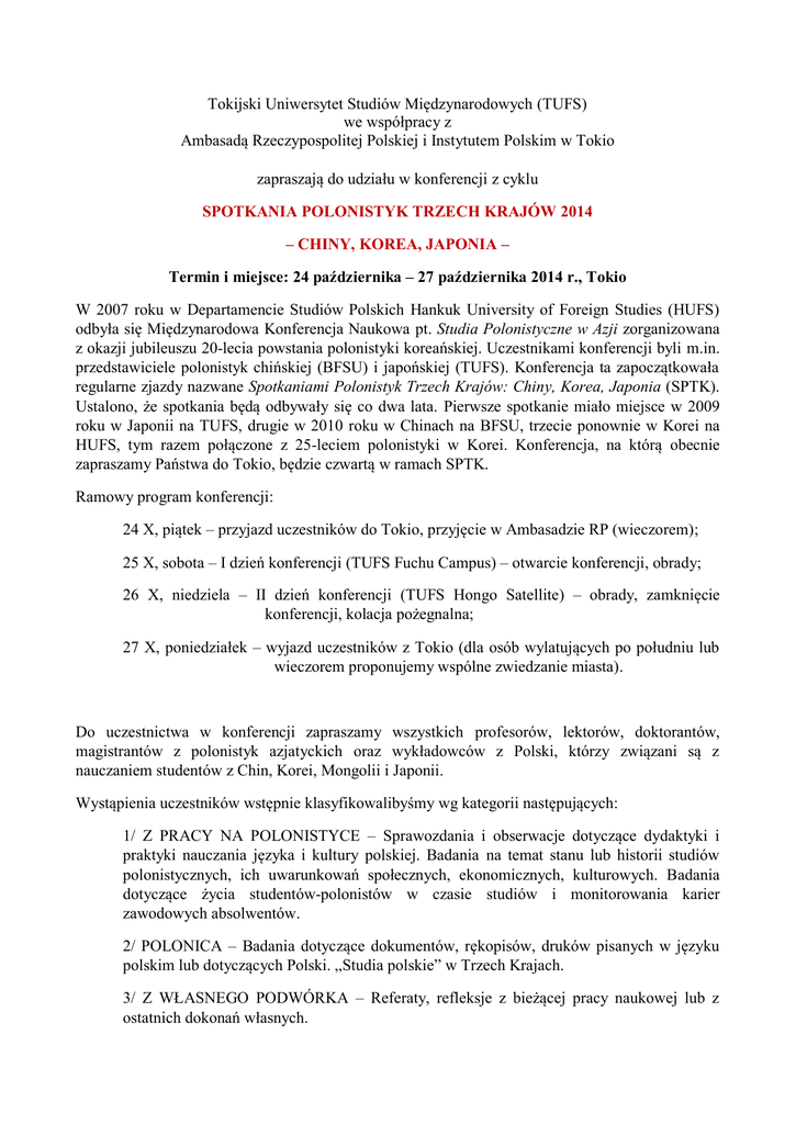 Tokijski Uniwersytet Studiów Międzynarodowych (TUFS) we współpracy z Ambasadą Rzeczypospolitej Polskiej i Instytutem Polskim w Tokio zapraszają do udziału w konferencji z cyklu SPOTKANIA POLONISTYK TRZECH KRAJÓW 2014 – CHINY, KOREA, JAPONIA – Termin i miejsce: 24 października – 27 października 2014 r., Tokio W 2007 roku w Departamencie Studiów Polskich Hankuk University of Foreign Studies (HUFS) odbyła się Międzynarodowa Konferencja Naukowa pt. Studia Polonistyczne w Azji zorganizowana z okazji jubileuszu 20-lecia powstania polonistyki koreańskiej. Uczestnikami konferencji byli m.in. przedstawiciele polonistyk chińskiej (BFSU) i japońskiej (TUFS). Konferencja ta zapoczątkowała regularne zjazdy nazwane Spotkaniami Polonistyk Trzech Krajów: Chiny, Korea, Japonia (SPTK). Ustalono, że spotkania będą odbywały się co dwa lata. Pierwsze spotkanie miało miejsce w 2009 roku w Japonii na TUFS, drugie w 2010 roku w Chinach na BFSU, trzecie ponownie w Korei na HUFS, tym razem połączone z 25-leciem polonistyki w Korei. Konferencja, na którą obecnie zapraszamy Państwa do Tokio, będzie czwartą w ramach SPTK. Ramowy program konferencji: 24 X, piątek – przyjazd uczestników do Tokio, przyjęcie w Ambasadzie RP (wieczorem); 25 X, sobota – I dzień konferencji (TUFS Fuchu Campus) – otwarcie konferencji, obrady; 26 X, niedziela – II dzień konferencji (TUFS Hongo Satellite) – obrady, zamknięcie konferencji, kolacja pożegnalna; 27 X, poniedziałek – wyjazd uczestników z Tokio (dla osób wylatujących po południu lub wieczorem proponujemy wspólne zwiedzanie miasta). Do uczestnictwa w konferencji zapraszamy wszystkich profesorów, lektorów, doktorantów, magistrantów z polonistyk azjatyckich oraz wykładowców z Polski, którzy związani są z nauczaniem studentów z Chin, Korei, Mongolii i Japonii. Wystąpienia uczestników wstępnie klasyfikowalibyśmy wg kategorii następujących: 1/ Z PRACY NA POLONISTYCE – Sprawozdania i obserwacje dotyczące dydaktyki i praktyki nauczania języka i kultury polskiej. Badania na temat stanu lub historii studiów polonistycznych, ich uwarunkowań społecznych, ekonomicznych, kulturowych. Badania dotyczące życia studentów-polonistów w czasie studiów i monitorowania karier zawodowych absolwentów. 2/ POLONICA – Badania dotyczące dokumentów, rękopisów, druków pisanych w języku polskim lub dotyczących Polski. „Studia polskie” w Trzech Krajach. 3/ Z WŁASNEGO PODWÓRKA – Referaty, refleksje z bieżącej pracy naukowej lub z ostatnich dokonań własnych. 4/ STUDENCI AZJATYCCY W POLSCE: PROBLEMY, WYZWANIA, PERSPEKTYWY – Sprawozdania i obserwacje na temat studentów z Chin, Korei, Mongolii, Japonii (innych krajów azjatyckich) studiujących na uniwersytetach w Polsce, procesy adaptacyjne, przygotowanie do życia w Polsce. Referaty z badań nad błędami językowymi, ewaluacja wyników nauczania itp. Przewidujemy wydanie kolejnego rocznika SPTK, w którym drukiem zamieścimy referaty wygłoszone na konferencji. W sprawie dofinansowania prosimy, jak w latach ubiegłych, o zwrócenie się do Ambasady RP w każdym z krajów uczestniczących w naszej konferencji. Konferencja będzie finansowana z różnych źródeł: przez Instytut Polski w Tokio, ze środków własnych TUFS oraz opłat konferencyjnych. Uczestnicy z Polski sami ponoszą koszty podróży oraz noclegów. Wszystkich Państwa uprzejmie poprosimy o pokrycie kosztów dojazdu z lotniska (Narita lub Haneda) do centrum Tokio (i z powrotem) oraz przejazdów na terenie miasta. Noclegi zaproponujemy Państwu w hotelu w centrum miasta. Szczegóły dotyczące zakwaterowania prześlemy Państwu po otrzymaniu wszystkich zgłoszeń. Liczymy bardzo na obecność Państwa na kolejnej konferencji SPTK w Tokio. Uprzejmie prosimy przesłanie wypełnionego formularza zgłoszeniowego do 15 kwietnia 2014 roku na adres [email protected] (tytuł wystąpienia można przesłać później). Ze względu na komfort i wygodę zakwaterowania, prosimy o nieprzekraczanie terminu zgłoszeń. Z serdecznymi pozdrowieniami z Tokio w imieniu organizatorów, Prof. Koji Morita Kierownik Polonistyki Tokijski Uniwersytet Studiów Międzynarodowych (Tokyo University of Foreign Studies/東京外国語大学)