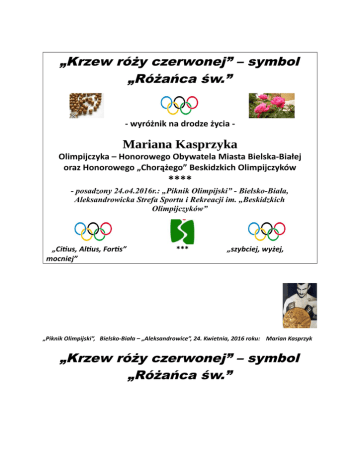 „Krzew róży czerwonej” – symbol „Różańca św.” - wyróżnik na drodze życia - Mariana Kasprzyka Olimpijczyka – Honorowego Obywatela Miasta Bielska-Białej oraz Honorowego „Chorążego” Beskidzkich Olimpijczyków **** - posadzony 24.o4.2016r.: „Piknik Olimpijski” - Bielsko-Biała, Aleksandrowicka Strefa Sportu i Rekreacji im. „Beskidzkich Olimpijczyków” „Citius, Altius, Fortis” mocniej” *** „szybciej, wyżej, „Piknik Olimpijski”, Bielsko-Biała – „Aleksandrowice”, 24. Kwietnia, 2016 roku: Marian Kasprzyk „Krzew róży czerwonej” – symbol „Różańca św.” „Krzew „czerwonej róży” – jako symbol i wyróżnik na drodze życiowej Pana Mariana Kasprzyka * boksera -Olimpijczyka, Honorowego Obywatela Bielska-Białej, a także Honorowego „Chorążego” Beskidzkich Olimpijczyków – posadzony w dniu 24.kwietnia 2016 roku, na „pikniku olimpijskim” w Bielsku-Białej - Aleksandrowickiej Strefie Sportu i Rekreacji im. „Beskidzkich Olimpijczyków” Uzasadnienie: 1. „Czerwone róże”: w życiu Pana Mariana Kasprzyka – są kwiatem szczególnym, symbolem umartwiania i modlitwy, szczególnie męczeństwa Jezusa. „Krwisty kolor róży” - symbolizuje krew Chrystusa. A „pięciokrotność okwiatu róży” nawiązuje do Jego „pięciu ran”, co „w symbolice olimpijskiej” można odnieść – do „pięciu kółek olimpijskich” i wpisanej w nie historycznej olimpijskiej maksymy: „Citius, Altius, Fortis” - „szybciej, wyżej, mocniej”; 2. ”Symbolika róży”: jak powszechnie wiadomo – to początek „chrześcijańskiego różańca”, któremu Polak-Papież Jan Paweł II - dzisiaj Święty, a za życia znakomity sportowiec i także „beskidzki turysta” przydawał szczególne walory duchowe, apelując do wiernych o ponowne odkrycie modlitwy różańcowej i wykorzystanie Jego kontemplacyjnego wymiaru, odpowiadającemu modlitwie serca; 3. „Różaniec”: jak wiemy - to szczególny dzisiaj życiowy symbol Mariana Kasprzyka, bokseraOlimpijczyka, Honorowego Obywatela Miasta Bielska-Białej, Honorowego „Chorążego” Beskidzkich Olimpijczyków. Wykonywany przez Niego dzisiaj - nie bez powodu – jest dla wielu z nas Jego darem. „Różaniec św.” Stąd propozycja kompozycji i treści tabliczki oraz „Krzewu róży czerwonej” – w zał. – ku pamięci wydarzenia otwarcia w dniu 24. Kwietnia 2016 roku: Aleksandrowickiej Strefy Sportu i Rekreacji im. „Beskidzkich Olimpijczyków”, w „poczcie pamięci” których - Pan Marian Kasprzyk jest 1-szym Honorowym „Chorążym”! Propozycja zatwierdzona na posiedzeniu Zarządu „Beskidzkiej Rady Olimpijskiej” w Wilkowicach, w dniu 2o.o4.2016r. (opr. i wnioskodawca: dr Ludwik Hejny)