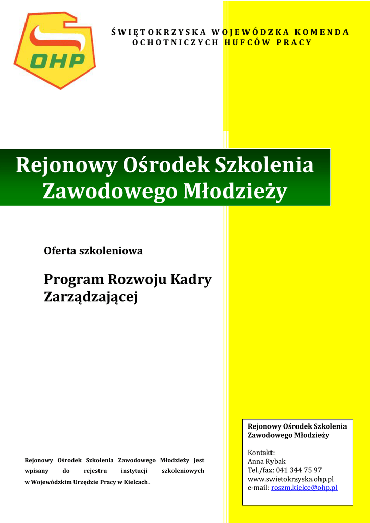 ŚWIĘTOKRZYSKA WOJEWÓDZKA KOMENDA OCHOTNICZYCH HUFCÓW PRACY Rejonowy Ośrodek Szkolenia Zawodowego Młodzieży Oferta szkoleniowa Program Rozwoju Kadry Zarządzającej Rejonowy Ośrodek Szkolenia Zawodowego Młodzieży Rejonowy Ośrodek Szkolenia Zawodowego Młodzieży jest wpisany do rejestru instytucji w Wojewódzkim Urzędzie Pracy w Kielcach. szkoleniowych Kontakt: Anna Rybak Tel./fax: 041 344 75 97 www.swietokrzyska.ohp.pl e-mail: [email protected] Oferta szkoleniowa Rejonowego Ośrodka Szkolenia Zawodowego Młodzieży w zakresie doskonalenia kompetencji kadr zarządzających obejmuje: Cykl szkoleń tzw. „miękkich” z zakresu rozwoju kompetencji kierowniczych i zarządczych oraz moduł prawny: Kodeks Postępowania Administracyjnego w praktyce – szkolenie 2 dniowe Moduł ten jest szczególnie polecany dla kadry zarządzającej rozstrzygającej sprawy w trybie administracyjnym. Uwaga: z dniem 07.03.2011r. weszła w życie ustawa o zmianie ustawy-Kodeks postępowania administracyjnego oraz ustawy - Ordynacja podatkowa. Nowelizacja wprowadza instytucję metryki sprawy administracyjnej. Nowe regulacje prawne mogą przysporzyć Państwu wiele trudności proceduralnych, a mając na względzie fakt, iż decyzje w trybie administracyjnym wydawane są właśnie przez kadrę zarządzającą najwyższego szczebla, zapraszamy Państwa do udziału w szkoleniu, którego celem jest przygotowanie Państwa do prawidłowego prowadzenia metryki sprawy administracyjnej oraz wyjaśnienie pojawiających się wątpliwości i niejasności. Rejonowy Ośrodek Szkolenia Zawodowego Młodzieży Świętokrzyskiej Wojewódzkiej Komendy ul. Sienkiewicza 36 25 – 507 Kielce Tel./fax: 041 344 75 97, www.swietokrzyska.ohp.pl, e-mail: [email protected] Program Rozwoju Kadry Zarządzającej - cykl szkoleniowy dedykowany dla kadry kierowniczej wyższego szczebla: W ramach obszaru kompetencji menedżerskich, oferujemy Państwu do wyboru cztery 2-dniowe szkolenia z poniżej zaprezentowanych tematów. Wszystkie szkolenia prowadzi trener, który sam będąc menedżerem, podzieli się z Państwem swoimi cennymi doświadczeniami. Szkolenia adresowane jest przede wszystkim do: Dyrekcji jednostek Szefów Zespołów, Firm, Kierowników Działów Osób Zarządzających Personelem, które odczuwają potrzebę wzbogacenia swojej wiedzy o sobie i swoich pracownikach, aby skuteczniej kierować zespołem w trudnych sytuacjach zawodowych Szkolenia prowadzone są techniką warsztatową przy wykorzystaniu metody „case study”. Każdy z 4 modułów szkoleniowych realizowany jest w sesjach dwudniowych, w wymiarze 16 godzin dydaktycznych każdy. Wstęp dla szkoleń dedykowanych dla kadry kierowniczej stanowi moduł: „Przywództwo sytuacyjne” Jedną z najczęściej rozwijanych i pożądanych cech osób zarządzających jednostką jest przewodzenie. Każda organizacja potrzebuje przywódców - tam gdzie ludźmi kierują liderzy, zespoły pracują efektywniej. Szkolenie ma na celu zapoznanie kadry zarządzającej z koncepcją przywództwa sytuacyjnego oraz podniesienie efektywności ich działań. Uczestnicy poprzez udział w licznych ćwiczeniach i grach symulacyjnych zdobędą umiejętności wspomagające rozwój własny i całego zespołu. Nauczą się wyzwalać w pracownikach entuzjazm i przeciwdziałać zespołowi wypalenia zawodowego. Rejonowy Ośrodek Szkolenia Zawodowego Młodzieży Świętokrzyskiej Wojewódzkiej Komendy ul. Sienkiewicza 36 25 – 507 Kielce Tel./fax: 041 344 75 97, www.swietokrzyska.ohp.pl, e-mail: [email protected] Program ramowy szkolenia „Przywództwo sytuacyjne” Czym jest kierowanie ludźmi? uświadomienie różnicy pomiędzy byciem leaderem, a menedżerem role menedżera wg. Minzberg’a kompetencje kadr kierowniczych Wpływ pracy zespołowej na efektywność różnice pomiędzy zespołem, a grupą przywództwo – jako rola lidera przywództwo 5 stopnia (analiza przypadku) Model przywództwa sytuacyjnego zdefiniowanie poziomu gotowości pracownika określenie stylów przywództwa instruowanie sprzedawanie wspieranie delegowanie dopasowanie stylu przywództwa do gotowości pracownika identyfikacja naturalnego stylu przywództwa Instruowanie w różnych odcieniach dlaczego nie lubimy instruowania? kiedy i jak instruować? model Tanenberga – Smitha Sprzedawanie w SL II dlaczego sprzedawanie, a nie Coaching? co tak naprawdę oznacza to pojęcie? czy „kupione” bardziej cenimy od otrzymanego? praktyka w „sprzedawaniu” Wspieranie motywowanie, a manipulowanie przegląd koncepcji motywowania pracowników klasyfikacja potrzeb motywacyjnych Delegowanie pułapki delegowania metoda TRUST w delegowaniu delegowanie w praktyce Rejonowy Ośrodek Szkolenia Zawodowego Młodzieży Świętokrzyskiej Wojewódzkiej Komendy ul. Sienkiewicza 36 25 – 507 Kielce Tel./fax: 041 344 75 97, www.swietokrzyska.ohp.pl, e-mail: [email protected] Kontynuację szkolenia dla kadry kierowniczej stanowi moduł „Coaching” z zakresu skutecznego zarządzania Coaching adresowany jest do dyrektorów i kierownictwa wyższego szczebla. Dostarcza umiejętności pomagających w rozwijaniu organizacji, jak też w radzeniu sobie z trudnościami z obszaru prowadzonego podmiotu. Ma zastosowanie w sytuacji wprowadzania zmian w organizacji, kreatywnego planowania i skutecznego wdrażania planów, realizacji zadań. Celem coachingu osób zarządzających jest wspomaganie rozwoju kluczowych przedstawicieli, którzy rozwijają firmę. Program ramowy szkolenia „Coaching” Czym jest Coaching? Rodzaje coachingu Coaching zawodowy Wprowadzenie do Coachingu: Czy pracownicy chcą być coachowani? Przyczyny oporów i sposoby przeciwdziałania im Na czym polega rola Coacha? Co na temat coachingu mówią inni? Trener czy psycholog? Cykl Coachingu Jak ustalić umiejętność do doskonalenia? Standardy czy oczekiwania? Jak to widzi organizacja? Obserwuj wykonanie Przeanalizuj sytuację – wspólne wnioskowanie Umiejętności coacha Style dz