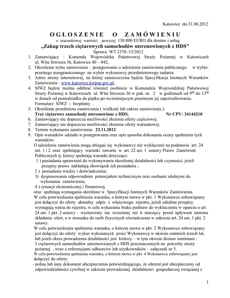 Katowice dn.31.08.2012 OGŁOSZENIE o szacunkowej wartości O ZAMÓWIENIU powyżej 130 000 EURO dla dostaw i usług „Zakup trzech ciężarowych samochodów uterenowionych z HDS” Sprawa WT 2370 /15/2012 1. Zamawiający : Komenda Wojewódzka Państwowej Straży Pożarnej w Katowicach ul. Wita Stwosza 36, Katowice 40 – 042, 2. Określenie trybu zamówienia : postępowanie o udzielenie zamówienia publicznego w trybie: przetargu nieograniczonego na wybór wykonawcy przedmiotowego zadania. 3. Adres strony internetowej, na której zamieszczona będzie Specyfikacja Istotnych Warunków Zamówienia - www.katowice.kwpsp.gov.pl,. 4. SIWZ będzie można odebrać również osobiście w Komendzie Wojewódzkiej Państwowej Straży Pożarnej w Katowicach ul. Wita Stwosza 36 w pok. nr. 2 w godzinach od 900 do 1300 w dniach od poniedziałku do piątku po wcześniejszym pisemnym jej zapotrzebowaniu. Formularz SIWZ - bezpłatny . 5. Określenie przedmiotu zamówienia ( wielkość lub zakres zamówienia ): Trzy ciężarowe samochody uterenowione z HDS. Nr CPV: 34144210 6. Zamawiający nie dopuszcza możliwości złożenia oferty częściowej. 7. Zamawiający nie dopuszcza możliwości złożenia oferty wariantowej. 8. Termin wykonania zamówienia: 23.11.2012 9. Opis warunków udziału w postępowaniu oraz opis sposobu dokonania oceny spełnienia tych warunków: O udzielenie zamówienia mogą ubiegać się wykonawcy nie wykluczeni na podstawie art. 24 ust. 1 i 2 oraz spełniający warunki zawarte w art. 22 ust. 1 ustawy Prawo Zamówień Publicznych tj. którzy spełniają warunki dotyczące: 1 ) posiadania uprawnień do wykonywania określonej działalności lub czynności, jeżeli przepisy prawa nakładają obowiązek ich posiadania ; 2 ) posiadania wiedzy i doświadczenia; 3) dysponowania odpowiednim potencjałem technicznym oraz osobami zdolnymi do wykonania zamówienia; 4 ) sytuacji ekonomicznej i finansowej. oraz spełniają wymagania określone w Specyfikacji Istotnych Warunków Zamówienia. W celu potwierdzenia spełnienia warunku, o którym mowa w pkt. 1 Wykonawca zobowiązany jest dołączyć do oferty aktualny odpis z właściwego rejestru, jeżeli odrębne przepisy wymagają wpisu do rejestru, w celu wykazania braku podstaw do wykluczeniu w oparciu o art. 24 ust. 1 pkt. 2 ustawy - wystawiony nie wcześniej niż 6 miesięcy przed upływem terminu składania ofert, a w stosunku do osób fizycznych oświadczenia w zakresie art. 24 ust. 1 pkt. 2 ustawy. W celu potwierdzenia spełnienia warunku, o którym mowa w pkt. 2 Wykonawca zobowiązany jest dołączyć do oferty wykaz wykonanych przez Wykonawcę w okresie ostatnich trzech lat, lub jeżeli okres prowadzenia działalności jest krótszy – w tym okresie dostaw minimum : 3 ciężarowych samochodów uterenowionych z HDS przeznaczonych na potrzeby straży pożarnej , wraz z referencjami odbiorców lub użytkowników – załącznik nr 5. W celu potwierdzenia spełnienia warunku, o którym mowa w pkt. 4 Wykonawca zobowiązany jest dołączyć do oferty: - polisę lub inny dokument ubezpieczenia potwierdzającego, że oferent jest ubezpieczony od odpowiedzialności cywilnej w zakresie prowadzonej działalności gospodarczej związanej z 1 przedmiotem zamówienia na kwotę min. 700.000,00 złotych. - informację banku lub spółdzielczej kasy oszczędnościowo-kredytowej, w którym wykonawca posiada podstawowy rachunek bankowy, wystawioną nie wcześniej niż trzy miesiące przed upływem terminu składania ofert, potwierdzającą, że w dniu jej wystawienia wysokość posiadanych środków finansowych lub zdolność kredytowa wykonawcy wynosi co najmniej 700.000,00 zł . - aktualne zaświadczenia właściwego naczelnika urzędu skarbowego oraz właściwego oddziału ZUS –u lub Kasy Rolniczego Ubezpieczenia Społecznego potwierdzające odpowiednio, że wykonawca nie zalega z opłacaniem podatków, opłat oraz składek na ubezpieczenie zdrowotne i społeczne lub zaświadczenie, że uzyskał przewidziane prawem zwolnienie, odroczenie lub rozłożenie na raty zaległych płatności, lub wstrzymanie w całości wykonania decyzji właściwego organu - wystawione nie wcześniej niż 3 miesiące przed upływem terminu składania ofert. - dowód złożenia wadium. Wykonawcą może być osoba fizyczna, osoba prawna lub jednostka organizacyjna nie posiadająca osobowości prawnej oraz podmioty te występujące wspólnie. Wykonawcy występujący wspólnie ponoszą solidarną odpowiedzialność za niewykonanie lub nienależyte wykonanie zamówienia. Zamawiający dokona oceny spełnienia w/w warunków pod względem formalnym i merytorycznym analizując złożone przez wykonawców oświadczenia i dokumenty w tym: Załącznik Nr 2 do SIWZ. Wykaz wymaganych dokumentów potwierdzających warunki udziału w postępowaniu: 1) Aktualny odpis z właściwego rejestru ,jeżeli odrębne przepisy wymagają wpisu do rejestru, w celu wykazania braku podstaw do wykluczeniu w oparciu o art. 24 ust. 1 pkt 2 ustawy - wystawiony nie wcześniej niż 6 miesięcy przed upływem terminu składania ofert, a w stosunku do osób fizycznych oświadczenia w zakresie art. 24 ust. 1 pkt 2 ustawy 2) Aktualne zaświadczenia właściwego naczelnika urzędu skarbowego oraz właściwego oddziału ZUS–u lub Kasy Rolniczego Ubezpieczenia Społecznego potwierdzające odpowiednio, że wykonawca nie zalega z opłacaniem podatków, opłat oraz składek na ubezpieczenie zdrowotne i społeczne lub zaświadczenie, że uzyskał przewidziane prawem zwolnienie, odroczenie lub rozłożenie na raty zaległych płatności, lub wstrzymanie w całości wykonania decyzji właściwego organu - wystawione nie wcześniej niż 3 miesiące przed upływem terminu składania ofert. 3) Aktualna informacja z Krajowego Rejestru Karnego w zakresie określonym w art. 24 ust. 1 pkt 4 - 11 ustawy Prawo zamówień publicznych - wystawiona nie wcześniej niż 6 miesięcy przed upływem terminu składania ofert. 4) Polisa lub 