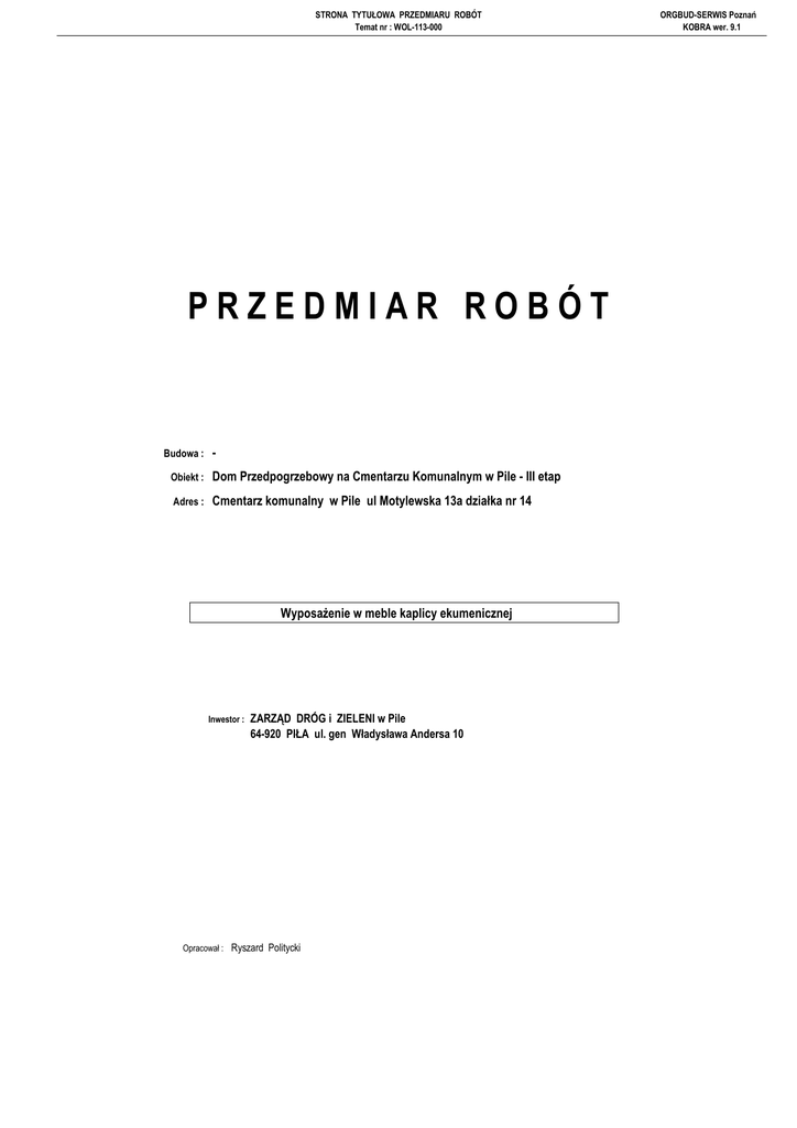 STRONA TYTUŁOWA PRZEDMIARU ROBÓT Temat nr : WOL-113-000 PRZEDMIAR ROBÓT Budowa : - Obiekt : Dom Przedpogrzebowy na Cmentarzu Komunalnym w Pile - III etap Adres : Cmentarz komunalny w Pile ul Motylewska 13a działka nr 14 WyposaŜenie w meble kaplicy ekumenicznej Inwestor : ZARZĄD DRÓG i ZIELENI w Pile 64-920 PIŁA ul. gen Władysława Andersa 10 Opracował : Ryszard Politycki ORGBUD-SERWIS Poznań KOBRA wer. 9.1 SPIS DZIAŁÓW PRZEDMIARU Temat nr : WOL-113-000 ORGBUD-SERWIS Poznań KOBRA wer. 9.1 WyposaŜenie w meble kaplicy ekumenicznej Budowa : Obiekt : Dom Przedpogrzebowy na Cmentarzu Komunalnym w Pile - III etap Adres : Cmentarz komunalny w Pile ul Motylewska 13a działka nr 14 SPIS DZIAŁÓW PRZEDMIARU Lp. Kod CPV 1 1.1 Opis stanu / elementu STAN : Dom Przedpogrzebowy na Cmentarzu Komunalnym w Pile ELEMENT : WyposaŜenie w meble kaplicy ekumenicznej - - - Koniec wydruku spisu działów przedmiaru - - - Str: 1 PRZEDMIAR ROBÓT Temat nr : WOL-113-000 ORGBUD-SERWIS Poznań KOBRA wer. 9.1 WyposaŜenie w meble kaplicy ekumenicznej Budowa : Obiekt : Dom Przedpogrzebowy na Cmentarzu Komunalnym w Pile - III etap Adres : Cmentarz komunalny w Pile ul Motylewska 13a działka nr 14 Lp. Podstawa kalkulacji Str: 1 / Opis pozycji Ilość 1. STAN : Dom Przedpogrzebowy na Cmentarzu Komunalnym w Pile Jedn. miary 1 035,600 pow.cał. 1.1. ELEMENT : WyposaŜenie w meble kaplicy ekumenicznej 1. a.w. Dostawa i montaŜ muwnica Konstrukcja drewniana gr płyty gr 22 mm oraz płyta osb gr 18 mm słuŜąca do przyklejenia płyty granitowej , wszystkie elementy drewniane z meranti malowane na kolor afrormosia, kamień naturalny granit gr 2 cm , rys 6 wymiar 55 x 42 x 110 cm 1,000 kpl 2. a.w. Dostawa i montaŜ katafalk stacjonarny rys 4 o wymiarach 190 x 70 x 50 cm - konstrukcji drewnianej z drewna meranti gr 22 cm na pow wierzchniej kamień naturalny granit gr 4 cm 1,000 kpl 3. a.w. Dostawa i montaŜ ławki drewnianej o długości 2,5 mb ( 2 ) rys 3 8,000 kpl 4. a.w. Dostawa i montaŜ ławki drewnianej o długości 1,8 mb ( 1 ) rys 3 26,000 kpl 20 + 6 = Razem przedmiar = 5. a.w. Dostawa materiałów i montaŜ stół liturgiczny - konstrukcji drewnianej płyta meranti oraz przyklejenie płyty granitowej gr 2,2 cm do płyty osb ; wymiar 200x100x100 cm rys 5 1= --- Koniec wydruku przedmiaru --- 26,000 kpl 1,000 kpl Razem przedmiar = 6. a.w. Dostawa i montaŜ krzyŜa drewnianego gr 3 cm, o wym 80 cm x 180 cm 26,000 1,000 1,000 kpl 1,000 kpl