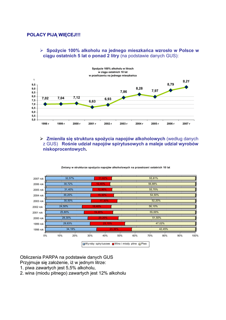 POLACY PIJĄ WIĘCEJ!!! ¾ Spożycie 100% alkoholu na jednego mieszkańca wzrosło w Polsce w ciągu ostatnich 5 lat o ponad 2 litry (na podstawie danych GUS): Spożycie 100% alkoholu w litrach w ciągu ostatnich 10 lat w przeliczeniu na jednego mieszkańca l. 9,5 9,0 8,5 8,0 7,5 7,0 6,5 6,0 5,5 5,0 9,21 8,79 7,86 7,02 7,04 7,12 1998 r 1999 r 2000 r 8,28 7,97 6,93 6,63 2001 r 2002 r 2003 r 2004 r 2005 r 2006 r 2007 r ¾ Zmieniła się struktura spożycia napojów alkoholowych (według danych z GUS) Rośnie udział napojów spirytusowych a maleje udział wyrobów niskoprocentowych. Zmiany w strukturze spożycia napojów alkoholowych na przestrzeni ostatnich 10 lat 32,57% 2007 rok 30,72% 2006 rok 2004 rok 30,20% 2003 rok 30,50% 24,50% 2000 rok 0% 52,20% 19,40% 56,10% 19,20% 55,00% 20,20% 51,50% 23,15% 34,19% 10% 54,50% 17,30% 29,83% 1998 rok 55,70% 15,30% 28,30% 1999 rok 56,88% 12,90% 25,80% 2001 rok 55,81% 12,40% 31,40% 2005 rok 2002 rok 11,62% 20% 47,02% 23,36% 30% 40% Wy roby spiry tusowe 50% 42,45% 60% Wino i miody pitne Obliczenia PARPA na podstawie danych GUS Przyjmuje się założenie, iż w jednym litrze: 1. piwa zawartych jest 5,5% alkoholu, 2. wina (miodu pitnego) zawartych jest 12% alkoholu 70% Piwo 80% 90% 100% Struktura spożycia w roku 2007 Wyroby spirytusow e 32,6% Piwo 55,8% Wino i miody pitne 11 6%na poziomie 25% W latach 2001 – 2002 napoje spirytusowe miały udział ¾ Rośnie dostępność ekonomiczna alkoholu W porównaniu do roku poprzedniego w roku 2007 nastąpił nieznaczny wzrost cen napojów alkoholowych (o 0,6%). Jednak niekorzystnym zjawiskiem jest uwidaczniający się od roku 2000 spadek cen mocnych alkoholi (wyroby spirytusowe i likiery) przy jednoczesnym wzroście cen alkoholi słabszych (wina i piwa). Obecnie, w porównaniu z 1998 rokiem, za średnie miesięczne wynagrodzenie można kupić trzykrotnie więcej butelek wódki oraz wina i dwukrotnie więcej butelek piwa 1 . Liczba butelek wódki, wina lub piwa, które można kupić za średnie miesięczne wynagrodzenie 1100 1 035 1000 900 800 737 772 796 831 871 909 953 669 700 600 504 500 400 278 300 336 212 220 231 242 257 196 110 121 56 73 107 149 88 90 135 78 1998 r. 1999 r. 2000 r. 2001 r. 2002 r. 2003 r. 2004 r. 2005 r. 2006 r. 2007 r. 300 147 200 100 0 liczba butelek wódki 1 liczba butelek wina liczba butelek piwa Dane na podstawie publikacji GUS „Ceny w gospodarce narodowej w 2001 r.” oraz „Ceny w gospodarce narodowej w 2007 r.” ¾ Rośnie dostępność fizyczna napojów alkoholowych (ilość punktów sprzedaży) Liczba punktów sprzedaży napojów alkoholowych oraz liczba mieszkańców przypadajacych na 1 punkt 230000 210000 190000 303 166 552 170000 175 780 162 671 181 309 184 974 177 945 188 751 197 495 350 149 036 300 150000 130000 110000 250 257 127 479 90000 230 235 217 70000 211 206 214 2003 r. 2004 r. 2005 r. 200 202 50000 1998 r. 1999 r. 2000 r. 2001 r. 2002 r. liczba punktów sprzedaży alkoholu 2006 r. 193 2007 r. liczba mieszkańców przypadających na punkt sprzedaży alkoholu Porównanie liczby punktów sprzedaży napojów alkoholowych oraz wielkości spożycia 100% alkoholu w przeliczeniu na jednego mieszkańca 197 495 200 000 190 000 175 780 181 309 188 751 184 974 177 945 180 000 170 000 8,79 162 671 160 000 150 000 400 8,28 7,86 149 036 7,12 140 000 6,63 9,21 7,97 6,93 130 000 120 000 2000 r. 2001 r. 2002 r. 2003 r. 2004 r. liczba punktów sprzedaży napojów alkoholowych 2005 r. 2006 r. 2007 r. spożycie 100% alkoholu 11 10,5 10 9,5 9 8,5 8 7,5 7 6,5 6 150 ¾ 9% konsumentów napojów alkoholowych spożywa aż 43% całego wypijanego alkoholu, Wypijają oni rocznie powyżej 12 l czystego alkoholu etylowego 43,10% 42,5% 45% 40% 37,1% 35% 30% 25,30% 23,70% 25% 20% 15% 11,5% 9,2% 8,00% 10% 5% 0% do 1,2l pow yżej 1,2 do 6l Odsetek pijących napoje alkoholow e w ilościach rocznie pow yżej 6l do 12l pow yżej 12l Odsetek konsumow anego alkoholu w ciągu roku ¾ Według Światowej Organizacji Zdrowia alkohol znajduje się na trzecim miejscu wśród czynników ryzyka dla zdrowia populacji Spożycie alkoholu w litrach na osobę dorosłą rocznie (z uwzględnieniem spożycia alkoholu nierejestrowanego). Źródło: WHO 2005