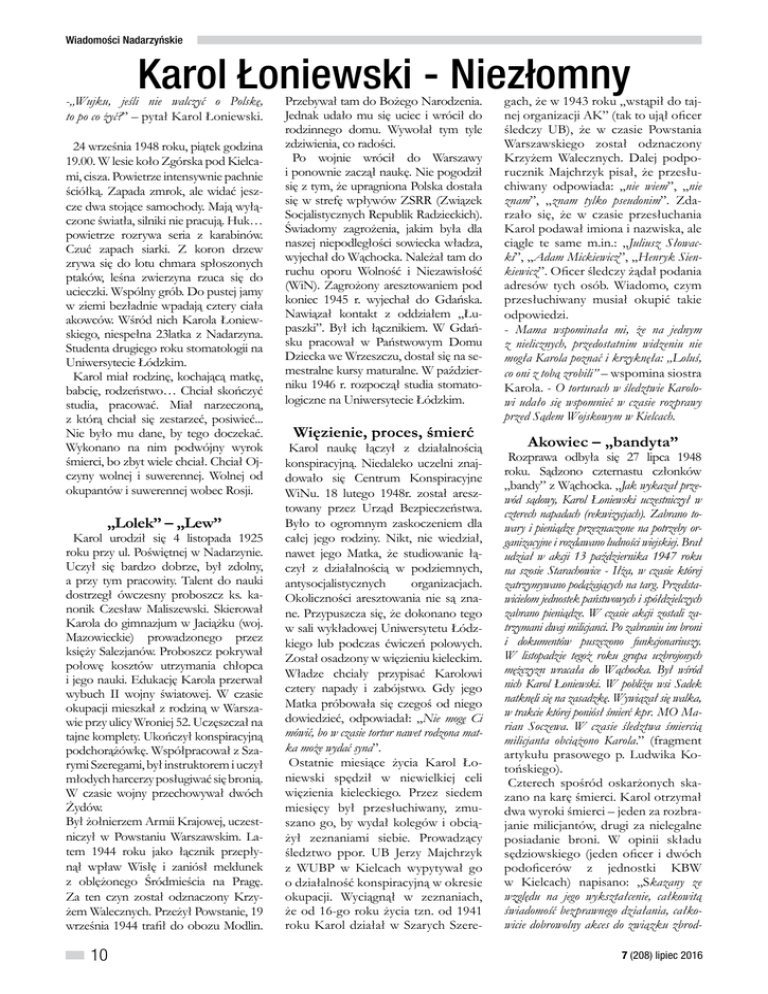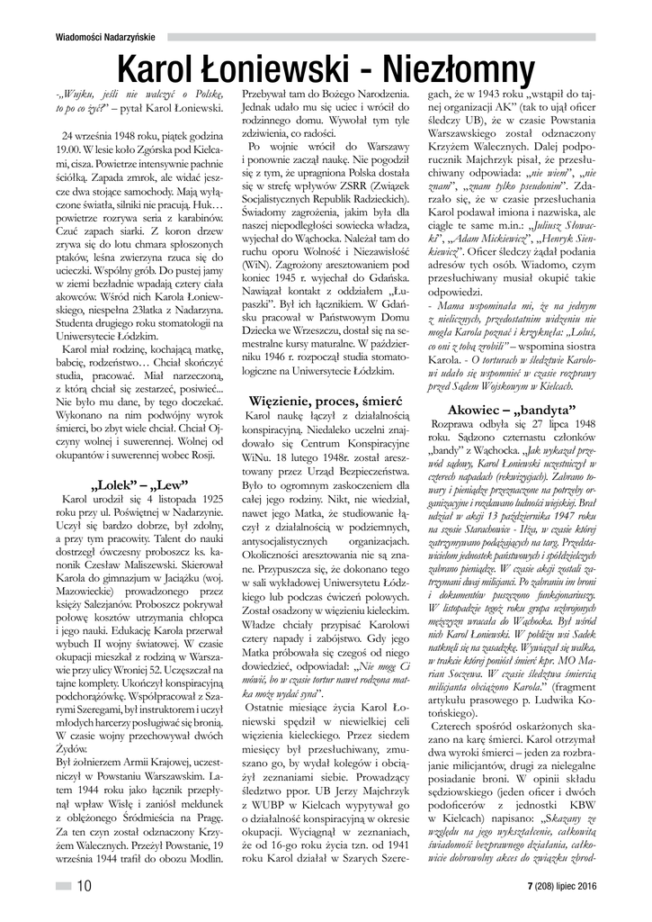 Wiadomości Nadarzyńskie Karol Łoniewski - Niezłomny -„Wujku, jeśli nie walczyć o Polskę, to po co żyć?” – pytał Karol Łoniewski. 24 września 1948 roku, piątek godzina 19.00. W lesie koło Zgórska pod Kielcami, cisza. Powietrze intensywnie pachnie ściółką. Zapada zmrok, ale widać jeszcze dwa stojące samochody. Mają wyłączone światła, silniki nie pracują. Huk… powietrze rozrywa seria z karabinów. Czuć zapach siarki. Z koron drzew zrywa się do lotu chmara spłoszonych ptaków, leśna zwierzyna rzuca się do ucieczki. Wspólny grób. Do pustej jamy w ziemi bezładnie wpadają cztery ciała akowców. Wśród nich Karola Łoniewskiego, niespełna 23latka z Nadarzyna. Studenta drugiego roku stomatologii na Uniwersytecie Łódzkim. Karol miał rodzinę, kochającą matkę, babcię, rodzeństwo… Chciał skończyć studia, pracować. Miał narzeczoną, z którą chciał się zestarzeć, posiwieć... Nie było mu dane, by tego doczekać. Wykonano na nim podwójny wyrok śmierci, bo zbyt wiele chciał. Chciał Ojczyny wolnej i suwerennej. Wolnej od okupantów i suwerennej wobec Rosji. „Lolek” – „Lew” Karol urodził się 4 listopada 1925 roku przy ul. Poświętnej w Nadarzynie. Uczył się bardzo dobrze, był zdolny, a przy tym pracowity. Talent do nauki dostrzegł ówczesny proboszcz ks. kanonik Czesław Maliszewski. Skierował Karola do gimnazjum w Jaciążku (woj. Mazowieckie) prowadzonego przez księży Salezjanów. Proboszcz pokrywał połowę kosztów utrzymania chłopca i jego nauki. Edukację Karola przerwał wybuch II wojny światowej. W czasie okupacji mieszkał z rodziną w Warszawie przy ulicy Wroniej 52. Uczęszczał na tajne komplety. Ukończył konspiracyjną podchorążówkę. Współpracował z Szarymi Szeregami, był instruktorem i uczył młodych harcerzy posługiwać się bronią. W czasie wojny przechowywał dwóch Żydów. Był żołnierzem Armii Krajowej, uczestniczył w Powstaniu Warszawskim. Latem 1944 roku jako łącznik przepłynął wpław Wisłę i zaniósł meldunek z oblężonego Śródmieścia na Pragę. Za ten czyn został odznaczony Krzyżem Walecznych. Przeżył Powstanie, 19 września 1944 trafił do obozu Modlin. 10 Przebywał tam do Bożego Narodzenia. Jednak udało mu się uciec i wrócił do rodzinnego domu. Wywołał tym tyle zdziwienia, co radości. Po wojnie wrócił do Warszawy i ponownie zaczął naukę. Nie pogodził się z tym, że upragniona Polska dostała się w strefę wpływów ZSRR (Związek Socjalistycznych Republik Radzieckich). Świadomy zagrożenia, jakim była dla naszej niepodległości sowiecka władza, wyjechał do Wąchocka. Należał tam do ruchu oporu Wolność i Niezawisłość (WiN). Zagrożony aresztowaniem pod koniec 1945 r. wyjechał do Gdańska. Nawiązał kontakt z oddziałem „Łupaszki”. Był ich łącznikiem. W Gdańsku pracował w Państwowym Domu Dziecka we Wrzeszczu, dostał się na semestralne kursy maturalne. W październiku 1946 r. rozpoczął studia stomatologiczne na Uniwersytecie Łódzkim. Więzienie, proces, śmierć Karol naukę łączył z działalnością konspiracyjną. Niedaleko uczelni znajdowało się Centrum Konspiracyjne WiNu. 18 lutego 1948r. został aresztowany przez Urząd Bezpieczeństwa. Było to ogromnym zaskoczeniem dla całej jego rodziny. Nikt, nie wiedział, nawet jego Matka, że studiowanie łączył z działalnością w podziemnych, antysocjalistycznych organizacjach. Okoliczności aresztowania nie są znane. Przypuszcza się, że dokonano tego w sali wykładowej Uniwersytetu Łódzkiego lub podczas ćwiczeń polowych. Został osadzony w więzieniu kieleckim. Władze chciały przypisać Karolowi cztery napady i zabójstwo. Gdy jego Matka próbowała się czegoś od niego dowiedzieć, odpowiadał: „Nie mogę Ci mówić, bo w czasie tortur nawet rodzona matka może wydać syna”. Ostatnie miesiące życia Karol Łoniewski spędził w niewielkiej celi więzienia kieleckiego. Przez siedem miesięcy był przesłuchiwany, zmuszano go, by wydał kolegów i obciążył zeznaniami siebie. Prowadzący śledztwo ppor. UB Jerzy Majchrzyk z WUBP w Kielcach wypytywał go o działalność konspiracyjną w okresie okupacji. Wyciągnął w zeznaniach, że od 16-go roku życia tzn. od 1941 roku Karol działał w Szarych Szere- gach, że w 1943 roku „wstąpił do tajnej organizacji AK” (tak to ujął oficer śledczy UB), że w czasie Powstania Warszawskiego został odznaczony Krzyżem Walecznych. Dalej podporucznik Majchrzyk pisał, że przesłuchiwany odpowiada: „nie wiem”, „nie znam”, „znam tylko pseudonim”. Zdarzało się, że w czasie przesłuchania Karol podawał imiona i nazwiska, ale ciągle te same m.in.: „Juliusz Słowacki”, „Adam Mickiewicz”, „Henryk Sienkiewicz”. Oficer śledczy żądał podania adresów tych osób. Wiadomo, czym przesłuchiwany musiał okupić takie odpowiedzi. - Mama wspominała mi, że na jednym z nielicznych, przedostatnim widzeniu nie mogła Karola poznać i krzyknęła: „Loluś, co oni z tobą zrobili” – wspomina siostra Karola. - O torturach w śledztwie Karolowi udało się wspomnieć w czasie rozprawy przed Sądem Wojskowym w Kielcach. Akowiec – „bandyta” Rozprawa odbyła się 27 lipca 1948 roku. Sądzono czternastu członków „bandy” z Wąchocka. „Jak wykazał przewód sądowy, Karol Łoniewski uczestniczył w czterech napadach (rekwizycjach). Zabrano towary i pieniądze przeznaczone na potrzeby organizacyjne i rozdawano ludności wiejskiej. Brał udział w akcji 13 października 1947 roku na szosie Starachowice - Iłża, w czasie której zatrzymywano podążających na targ. Przedstawicielom jednostek państwowych i spółdzielczych zabrano pieniądze. W czasie akcji zostali zatrzymani dwaj milicjanci. Po zabraniu im broni i dokumentów puszczono funkcjonariuszy. W listopadzie tegoż roku grupa uzbrojonych mężczyzn wracała do Wąchocka. Był wśród nich Karol Łoniewski. W 