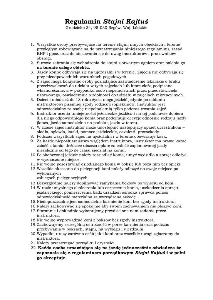 Regulamin Stajni Kajtuś Grodzisko 34, 95-030 Rzgów, Woj. Łódzkie 1. Wszystkie osoby przebywające na terenie stajni, innych obiektach i terenie przyległym zobowiązane są do przestrzegania niniejszego regulaminu, zasad BHP i ppoż. oraz do stosowania się do uwag instruktorów i pracowników obsługi. 2. Surowo zabrania się wchodzenia do stajni z otwartym ogniem oraz palenia go na terenie całego obiektu. 3. Jazdy konne odbywają się na ujeżdżalni i w terenie. Zajęcia nie odbywają się przy nieodpowiednich warunkach pogodowych. 4. Z zajęć mogą korzystać osoby posiadające zaświadczenie lekarskie o braku przeciwwskazań do udziału w tych zajęciach lub które złożą podpisane własnoręcznie, a w przypadku osób niepełnoletnich przez przedstawiciela ustawowego, oświadczenie o zdolności do udziału w zajęciach rekreacyjnych. 5. Dzieci i młodzież do 18 roku życia mogą jeździć jedynie po oddaniu instruktorowi pisemnej zgody rodziców/opiekunów. Instruktor jest odpowiedzialny za osobę niepełnoletnią tylko podczas trwania zajęć. 6. Instruktor ocenia umiejętności jeździeckie jeźdźca i na tej podstawie dobiera dla niego odpowiedniego konia oraz podejmuje decyzję odnośnie rodzaju jazdy (lonża, jazda samodzielna na padoku, jazda w teren). 7. W czasie zajęć instruktor może udostępnić następujący sprzęt uczestnikom – siodła, ogłowia, kaski, pomoce jeździeckie, cavaletti, przeszkody. 8. Podczas wszystkich zajęć na ujeżdżalni i w terenie obowiązuje kask. 9. Za każde nieposłuszeństwo względem instruktora, instruktor ma prawo kazać zsiąść z konia. Jeździec uiszcza opłatę za całość zaplanowanej jazdy niezależnie od tego ile czasu siedział na koniu. 10. Po skończonej jeździe należy rozsiodłać konia, umyć wędzidło a sprzęt odłożyć w wyznaczone miejsce. 11. Nie wolno pozostawiać osiodłanego konia w boksie lub poza nim bez opieki. 12. Wszelkie akcesoria do pielęgnacji koni należy odłożyć na swoje miejsce po wykonanych zabiegach pielęgnacyjnych. 13. Bezwzględnie należy dopilnować zamykania boksów po wyjściu od koni. 14. W razie umyślnego okaleczenia lub oszpecenia konia, uszkodzenia sprzętu jeździeckiego, pomieszczenia bądź urządzeń ośrodka sprawca ponosi odpowiedzialność materialną za wyrządzoną szkodę. 15. Niedopuszczalne jest samodzielne karmienie koni bez zgody instruktora. 16. Należy zachowywać się spokojnie aby swoim zachowaniem nie płoszyć koni. 17. Starannie i dokładnie wykonujemy przydzielone nam zadania przez instruktora. 18. Nie wolno wyprowadzać koni z boksów bez zgody instruktora. 19. Zachowujemy szczególną ostrożność w porze karmienia oraz podczas przebywania w boksach, stajni, na wybiegu i ujeżdżalni. 20. Wypadki, urazy zarówno osób jak i koni oraz wszelkie uwagi zgłaszamy do instruktora. 21. Należy przestrzegać porządku i czystości. 22. Każda osoba umawiająca się na jazdę jednocześnie oświadcza że zapoznała się z regulaminem porządkowym Stajni Kajtuś i w pełni go akceptuje.