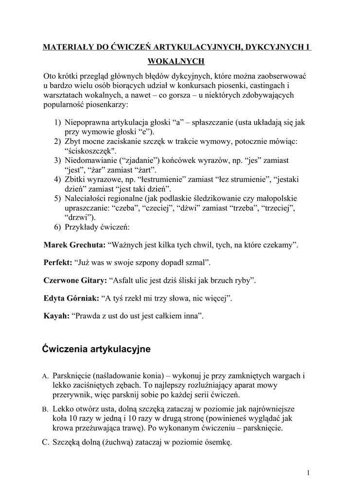 MATERIAŁY DO ĆWICZEŃ ARTYKULACYJNYCH, DYKCYJNYCH I WOKALNYCH Oto krótki przegląd głównych błędów dykcyjnych, które można zaobserwować u bardzo wielu osób biorących udział w konkursach piosenki, castingach i warsztatach wokalnych, a nawet – co gorsza – u niektórych zdobywających popularność piosenkarzy: 1) Niepoprawna artykulacja głoski “a” – spłaszczanie (usta układają się jak przy wymowie głoski “e”). 2) Zbyt mocne zaciskanie szczęk w trakcie wymowy, potocznie mówiąc: “ściskoszczęk". 3) Niedomawianie (“zjadanie”) końcówek wyrazów, np. “jes” zamiast “jest”, “żar” zamiast “żart”. 4) Zbitki wyrazowe, np. “łestrumienie” zamiast “łez strumienie”, “jestaki dzień” zamiast “jest taki dzień”. 5) Naleciałości regionalne (jak podlaskie śledzikowanie czy małopolskie upraszczanie: “czeba”, “czeciej”, “dżwi” zamiast “trzeba”, “trzeciej”, “drzwi”). 6) Przykłady ćwiczeń: Marek Grechuta: “Ważnych jest kilka tych chwil, tych, na które czekamy”. Perfekt: “Już was w swoje szpony dopadł szmal”. Czerwone Gitary: “Asfalt ulic jest dziś śliski jak brzuch ryby”. Edyta Górniak: “A tyś rzekł mi trzy słowa, nic więcej”. Kayah: “Prawda z ust do ust jest całkiem inna”. Ćwiczenia artykulacyjne A. Parsknięcie (naśladowanie konia) – wykonuj je przy zamkniętych wargach i lekko zaciśniętych zębach. To najlepszy rozluźniający aparat mowy przerywnik, więc parsknij sobie po każdej serii ćwiczeń. B. Lekko otwórz usta, dolną szczęką zataczaj w poziomie jak najrówniejsze koła 10 razy w jedną i 10 razy w drugą stronę (powinieneś wyglądać jak krowa przeżuwająca trawę). Po wykonanym ćwiczeniu – parsknięcie. C. Szczęką dolną (żuchwą) zataczaj w poziomie ósemkę. 1 D. Zaciśnij zęby, układaj usta na przemian w szeroki uśmiech i wąziutki dzióbek. Po wykonanym ćwiczeniu nie zapomnij o parsknięciu. E. Zaciśnij zęby, ustami stulonymi w dzióbek spróbuj zataczać okręgi. Ćwiczenia dykcyjne brim, bram, bram, bram, brom prim, pram, pram, pram, prom drim, dram, dram, dram, drom trim, tram, tram, tram, trom krim, kram, kram, kram, krom grim, gram, gram, gram, grom a) Podawała baba babie przez piec malowane grabie. b) A w puszczy piszczy puszczyk. c) Zmiażdż dżdżownicę. d) Czy tata czyta cytaty Tacyta. e) Tracz tarł tarcicę tak, takt w takt, jak takt w takt tarcicę tartak tarł. f) Jola lojalna. g) Hongkong w Chinach, King-Kong w kinach. h) Żaby rzępolą na Rzeszowszczyznie. i) A może babcia w kapciach w ciapki tak tupie? 2. Przypomnienie zasad poprawnego wykonywania wprawek wokalnych: W trakcie śpiewu staramy się możliwie najbardziej rozluźniać gardło. Układ gardła powinien przypominać pierwszy etap ziewania. Ziewanie można z grubsza podzielić na dwa etapy: pierwszy, gdy nachodzi nas chęć ziewnięcia i robimy głęboki wdech, podczas którego da się odczuć, jak bardzo poszerza się gardło, i drugi, kiedy następuje właściwy moment ziewnięcia. W trakcie ćwiczeń pozostańmy jedynie przy pierwszym etapie, choć relaksacyjne można sobie parę razy ziewnąć. 2 Wprawki staramy się śpiewać na rozszerzonym, rozluźnionym gardle, pamiętając jednak o precyzyjnym wydobywaniu dźwięków. Każdą wprawkę śpiewamy w wielu tonacjach dopasowanych do naszych warunków głosowych, jeśli ćwiczymy w grupie, nie ścigajmy się, kto zaśpiewa wyżej. Każdy z nas ma inny głos, inną barwę, inne fizjologiczne możliwości – jeśli czujemy, że już wystarczy, to przerywamy i czekamy na moment, gdy znów będziemy się mogli dołączyć. Oszczędzamy głos, nie forsujemy gardła, śpiewamy raczej delikatnie, jedynie w wyższych partiach wprawek pozwalamy sobie na mocniejszy śpiew. 3. Wykonanie wprawek wokalnych: Ćwiczenie nr 1 Rozpoczynamy śpiew od murmuranda. Przy zamkniętych ustach mruczymy na jednym oddechu cała frazę. Po trzech zmianach tonacji z murmuranda przechodzimy do śpiewu sylab, śpiewając przedłużone “m" na początku każdej sylaby. Dźwięk wyraźnie powinien powstawać na “masce", czyli twarzy. Ćwiczenie nr 2 W trakcie śpiewu solmizacji staramy się precyzyjnie układać usta. Ćwiczenie nr 3 W powyższym ćwiczeniu dźwięk powstaje wyraźnie przy dużym udziale nosa. Każde “don" powinno być mocno zaakcentowane, a ruch położonej na brzuchu dłoni powinien pokazać, że akcent powstaje na przeponie. 3 Ćwiczenie nr 4 Całość śpiewamy bardzo płynnie. Ćwiczenie nr 5 Precyzyjnie otwieramy usta. Każde "sol" akcentujemy, podbijając dźwięk przeponą. Dłoń położona na brzuchu powinna wyraźnie reagować na każdy akcent. Jeśli nie obserwujemy poruszającej się dłoni, na każdy akcent lekko dociskamy dłoń do brzucha, stymulując przeponę. Ćwiczenie nr 6 Pierwszy i trzeci takt śpiewamy bardzo delikatnie i płynnie, drugi –bardzo skocznie i mocno. Ćwiczenie nr 7 Staramy się pamiętać o dykcji, śpiewając na szerokim, nienaturalnym uśmiechu. Ćwiczenie nr 8 Tę piosenkę śpiewamy, wciąż przyspieszając. W trakcie pierwszej serii staramy się śpiewać bardzo wyraźnie. W kolejnych, znacznie szybszych seriach nie dbamy zbytnio o otwieranie ust, ale o sprawne nimi pracowanie. Uwaga – całą frazę (linijkę) śpiewamy na jednym oddechu. 4