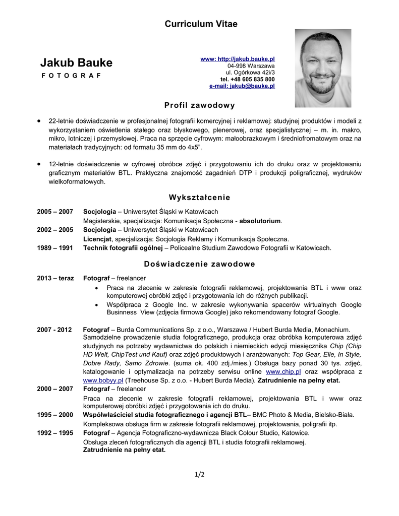 Curriculum Vitae www: http://jakub.bauke.pl 04-998 Warszawa ul. Ogórkowa 42i/3 tel. +48 605 835 800 e-mail: [email protected] Jakub Bauke F O T O G R A F Profil zaw odow y 22-letnie doswiadczenie w profesjonalnej fotografii komercyjnej i reklamowej: studyjnej produktów i modeli z wykorzystaniem oswietlenia stałego oraz błyskowego, plenerowej, oraz specjalistycznej – m. in. makro, mikro, lotniczej i przemysłowej. Praca na sprzęcie cyfrowym: małoobrazkowym i średniofromatowym oraz na materiałach tradycyjnych: od formatu 35 mm do 4x5”. 12-letnie doswiadczenie w cyfrowej obróbce zdjęć i przygotowaniu ich do druku oraz w projektowaniu graficznym materiałów BTL. Praktyczna znajomosć zagadnień DTP i produkcji poligraficznej, wydruków wielkoformatowych. Wykształcenie 2005 – 2007 2002 – 2005 1989 – 1991 Socjologia – Uniwersytet Śląski w Katowicach Magisterskie, specjalizacja: Komunikacja Społeczna - absolutorium. Socjologia – Uniwersytet Śląski w Katowicach Licencjat, specjalizacja: Socjologia Reklamy i Komunikacja Społeczna. Technik fotografii ogólnej – Policealne Studium Zawodowe Fotografii w Katowicach. Dośw iadczenie zawodowe 2013 – teraz Fotograf – freelancer 2007 - 2012 2000 – 2007 1995 – 2000 1992 – 1995 Praca na zlecenie w zakresie fotografii reklamowej, projektowania BTL i www oraz komputerowej obróbki zdjęć i przygotowania ich do różnych publikacji. Współpraca z Google Inc. w zakresie wykonywania spacerów wirtualnych Google Businness View (zdjęcia firmowa Google) jako rekomendowany fotograf Google. Fotograf – Burda Communications Sp. z o.o., Warszawa / Hubert Burda Media, Monachium. Samodzielne prowadzenie studia fotograficznego, produkcja oraz obróbka komputerowa zdjęć studyjnych na potrzeby wydawnictwa do polskich i niemieckich edycji miesięcznika Chip (Chip HD Welt, ChipTest und Kauf) oraz zdjęć produktowych i aranżowanych: Top Gear, Elle, In Style, Dobre Rady, Samo Zdrowie. (suma ok. 400 zdj./mies.) Obsługa bazy ponad 30 tys. zdjęć, katalogowanie i optymalizacja na potrzeby serwisu online www.chip.pl oraz współpraca z www.bobyy.pl (Treehouse Sp. z o.o. - Hubert Burda Media). Zatrudnienie na pełny etat. Fotograf – freelancer Praca na zlecenie w zakresie fotografii reklamowej, projektowania BTL i www oraz komputerowej obróbki zdjęć i przygotowania ich do druku. Współwłasciciel studia fotograficznego i agencji BTL– BMC Photo & Media, Bielsko-Biała. Kompleksowa obsługa firm w zakresie fotografii reklamowej, projektowania, poligrafii itp. Fotograf – Agencja Fotograficzno-wydawnicza Black Colour Studio, Katowice. Obsługa zleceń fotograficznych dla agencji BTL i studia fotografii reklamowej. Zatrudnienie na pełny etat. 1/2 W ybrani klienci: Umiejętności : Agencje reklamowe: Loewe&Loewe Lörrach DE, Brandidentity, StudioP Andrzej Pagowski, Publicis, Alatus, Grafis, Lion Group, Terragraph, A.R. Aida, Prografix, Promix, Diskau, Holin. Sprzęt i systemy: Hasselblad, Bronica, Mamiya, Pentax 645, Toyo 45, Sinar f2/p2, Phase One H5, H10, P21, Imacon, Nikon, Multiblitz, Bowens, Hensel, Elfo, Gossen, Sekonic, Strato, Manfrotto itp. Przemysł: ZML Kęty, Metalplast, Pollena, ZPD Andropol, ZPO Jarlan, Huta Baildon, Stalexport, Śrubena. Oprogramowanie: Biegle: Adobe Photoshop, Adobe Lightroom i Capture One (Phase One) oraz średnio: pozostałe aplikacje Adobe Creative Suite, Adobe Flash Professional, Microsoft Office w stopniu dobrym. Żywność: Żywiec-Zdrój, Mokate, Olza, Sertop, ZM Mysław, Polmos, Browar Jaegger, Browary Tyskie. Sport: HBP Hefele Borenski Sportgerate DE, Fabryka Rowerów Apollo. Języki: angielski (dobry – w pełni komunikatywnie, FCE 1989), niemiecki oraz rosyjski (słabo). Prawo jazdy: kat. A, B, C – zawodowe. Odzież: Vistula, Alpinus, Pajak-Sport. Usługi: Bank Śląski, Poczta Polska. Hi-End Audio: Harpia Acoustics. Wyrażam zgodę na przetwarzanie moich danych osobowych zawartych w ofercie pracy dla potrzeb rekrutacji, zgodnie z ustawą z dnia 29.08.1997 r. o ochronie danych osobowych. Dz. U. z 2014 r., poz. 1182. 2/2