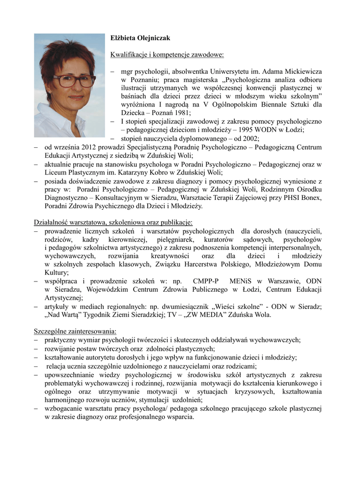 Elżbieta Olejniczak Kwalifikacje i kompetencje zawodowe: − mgr psychologii, absolwentka Uniwersytetu im. Adama Mickiewicza w Poznaniu; praca magisterska „Psychologiczna analiza odbioru ilustracji utrzymanych we współczesnej konwencji plastycznej w baśniach dla dzieci przez dzieci w młodszym wieku szkolnym” wyróżniona I nagrodą na V Ogólnopolskim Biennale Sztuki dla Dziecka – Poznań 1981; − I stopień specjalizacji zawodowej z zakresu pomocy psychologiczno – pedagogicznej dzieciom i młodzieży – 1995 WODN w Łodzi; − stopień nauczyciela dyplomowanego – od 2002; − od września 2012 prowadzi Specjalistyczną Poradnię Psychologiczno – Pedagogiczną Centrum Edukacji Artystycznej z siedzibą w Zduńskiej Woli; − aktualnie pracuje na stanowisku psychologa w Poradni Psychologiczno – Pedagogicznej oraz w Liceum Plastycznym im. Katarzyny Kobro w Zduńskiej Woli; − posiada doświadczenie zawodowe z zakresu diagnozy i pomocy psychologicznej wyniesione z pracy w: Poradni Psychologiczno – Pedagogicznej w Zduńskiej Woli, Rodzinnym Ośrodku Diagnostyczno – Konsultacyjnym w Sieradzu, Warsztacie Terapii Zajęciowej przy PHSI Bonex, Poradni Zdrowia Psychicznego dla Dzieci i Młodzieży. Działalność warsztatowa, szkoleniowa oraz publikacje: − prowadzenie licznych szkoleń i warsztatów psychologicznych dla dorosłych (nauczycieli, rodziców, kadry kierowniczej, pielęgniarek, kuratorów sądowych, psychologów i pedagogów szkolnictwa artystycznego) z zakresu podnoszenia kompetencji interpersonalnych, wychowawczych, rozwijania kreatywności oraz dla dzieci i młodzieży w szkolnych zespołach klasowych, Związku Harcerstwa Polskiego, Młodzieżowym Domu Kultury; − współpraca i prowadzenie szkoleń w: np. CMPP-P MENiS w Warszawie, ODN w Sieradzu, Wojewódzkim Centrum Zdrowia Publicznego w Łodzi, Centrum Edukacji Artystycznej; − artykuły w mediach regionalnych: np. dwumiesiącznik „Wieści szkolne” - ODN w Sieradz; „Nad Wartą” Tygodnik Ziemi Sieradzkiej; TV – „ZW MEDIA” Zduńska Wola. Szczególne zainteresowania: − praktyczny wymiar psychologii twórczości i skutecznych oddziaływań wychowawczych; − rozwijanie postaw twórczych oraz zdolności plastycznych; − kształtowanie autorytetu dorosłych i jego wpływ na funkcjonowanie dzieci i młodzieży; − relacja ucznia szczególnie uzdolnionego z nauczycielami oraz rodzicami; − upowszechnianie wiedzy psychologicznej w środowisku szkół artystycznych z zakresu problematyki wychowawczej i rodzinnej, rozwijania motywacji do kształcenia kierunkowego i ogólnego oraz utrzymywanie motywacji w sytuacjach kryzysowych, kształtowania harmonijnego rozwoju uczniów, stymulacji uzdolnień; − wzbogacanie warsztatu pracy psychologa/ pedagoga szkolnego pracującego szkole plastycznej w zakresie diagnozy oraz profesjonalnego wsparcia.