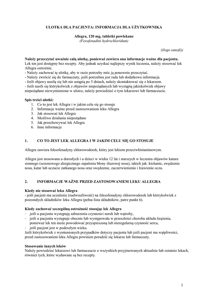 ULOTKA DLA PACJENTA: INFORMACJA DLA UŻYTKOWNIKA Allegra, 120 mg, tabletki powlekane (Fexofenadini hydrochloridum) ((logo sanofi)) Należy przeczytać uważnie całą ulotkę, ponieważ zawiera ona informacje ważne dla pacjenta. Lek ten jest dostępny bez recepty. Aby jednak uzyskać najlepszy wynik leczenia, należy stosować lek Allegra ostrożnie. - Należy zachować tę ulotkę, aby w razie potrzeby móc ją ponownie przeczytać. - Należy zwrócić się do farmaceuty, jeśli potrzebna jest rada lub dodatkowa informacja. - Jeśli objawy nasilą się lub nie ustąpią po 5 dniach, należy skontaktować się z lekarzem. - Jeśli nasili się którykolwiek z objawów niepożądanych lub wystąpią jakiekolwiek objawy niepożądane niewymienione w ulotce, należy powiedzieć o tym lekarzowi lub farmaceucie. Spis treści ulotki: 1. Co to jest lek Allegra i w jakim celu się go stosuje 2. Informacje ważne przed zastosowaniem leku Allegra 3. Jak stosować lek Allegra 4. Możliwe działania niepożądane 5. Jak przechowywać lek Allegra 6. Inne informacje 1. CO TO JEST LEK ALLEGRA I W JAKIM CELU SIĘ GO STOSUJE Allegra zawiera feksofenadyny chlorowodorek, który jest lekiem przeciwhistaminowym. Allegra jest stosowana u dorosłych i u dzieci w wieku 12 lat i starszych w leczeniu objawów kataru siennego (sezonowego alergicznego zapalenia błony śluzowej nosa), takich jak: kichanie, swędzenie nosa, katar lub uczucie zatkanego nosa oraz swędzenie, zaczerwienienie i łzawienie oczu. 2. INFORMACJE WAŻNE PRZED ZASTOSOWANIEM LEKU ALLEGRA Kiedy nie stosować leku Allegra - jeśli pacjent ma uczulenie (nadwrażliwość) na feksofenadyny chlorowodorek lub którykolwiek z pozostałych składników leku Allegra (pełna lista składników, patrz punkt 6). Kiedy zachować szczególną ostrożność stosując lek Allegra - jeśli u pacjenta występują zaburzenia czynności nerek lub wątroby, - jeśli u pacjenta występuje obecnie lub występowała w przeszłości choroba układu krążenia, ponieważ lek ten może powodować przyspieszoną lub nieregularną czynność serca, - jeśli pacjent jest w podeszłym wieku. Jeśli którykolwiek z wymienionych przypadków dotyczy pacjenta lub jeśli pacjent ma wątpliwości, przed zastosowaniem leku Allegra powinien poradzić się lekarza lub farmaceuty. Stosowanie innych leków Należy powiedzieć lekarzowi lub farmaceucie o wszystkich przyjmowanych aktualnie lub ostatnio lekach, również tych, które wydawane są bez recepty. 1 Przyjęcie leków zobojętniających, zawierających glin i magnez może wpłynąć na działanie leku Allegra poprzez zmniejszenie ilości wchłoniętego leku. Z tego względu zaleca się zachowanie około 2-godzinnego odstępu między przyjęciem wyżej wymienionych leków zobojętniających, a podaniem leku Allegra. Stosowanie leku Allegra z jedzeniem i piciem Tabletki Allegra należy przyjmować przed posiłkiem, popijając wodą. Ciąża i karmienie piersią Przed zastosowaniem jakiegokolwiek leku należy poradzić się lekarza lub farmaceuty. Leku Allegra nie stosować w okresie ciąży, jeśli nie jest to bezwzględnie konieczne. Nie zaleca się stosowania leku Allegra w okresie karmienia piersią. Prowadzenie pojazdów i obsługiwanie maszyn Jest mało prawdopodobne, aby Allegra wpływał na zdolność prowadzenia pojazdów lub obsługę maszyn. Oznacza to, że pacjenci mogą prowadzić pojazdy mechaniczne i wykonywać zadania wymagające koncentracji. Jednakże, przed prowadzeniem pojazdów lub obsługiwaniem urządzeń mechanicznych należy upewnić się, że lek nie powoduje senności lub zawrotów głowy. Jeśli wystąpią takie objawy, nie należy prowadzić pojazdów ani obsługiwać maszyn. 3. JAK STOSOWAĆ LEK ALLEGRA Poniższe wskazówki mają zastosowanie, jeśli lekarz nie zalecił innego sposobu stosowania leku Allegra. W razie wątpliwości należy skontaktować się z lekarzem lub farmaceutą. Dla osób dorosłych i dzieci w wieku 12 lat i starszych Zalecana dawka to 1 tabletka (120 mg) raz na dobę. Tabletki należy przyjmować doustnie, przed posiłkiem, popijając wodą. Jeśli objawy nie ustąpią po 5 dniach od rozpoczęcia stosowania leku, należy skontaktować się z lekarzem. Zastosowanie większej niż zalecana dawki leku Allegra W razie przyjęcia większej niż zalecana dawki leku, należy niezwłocznie zwrócić się do lekarza lub zgłosić się do najbliższego szpitala. Objawami przedawkowania leku są: zawroty głowy, senność, zmęczenie oraz suchość w jamie ustnej. Pominięcie zastosowania leku Allegra Nie należy stosować dawki podwójnej w celu uzupełnienia pominiętej dawki. Następną dawkę leku przyjąć o zwykłej porze. W razie wątpliwości związanych ze stosowaniem leku należy zwrócić się do lekarza lub farmaceuty. 4. MOŻLIWE DZIAŁANIA NIEPOŻĄDANE Jak każdy lek, lek Allegra może powodować działania niepożądane, chociaż nie u każdego one wystąpią. Należy niezwłocznie zgłosić się do lekarza i przerwać stosowanie leku Allegra, jeśli wystąpi obrzęk twarzy, warg, języka lub gardła i trudności w oddychaniu. Mogą to być objawy ciężkiej reakcji alergicznej. 2 Częste działania niepożądane (występujące rzadziej niż u 1 na 10, ale częściej niż u 1 na 100 pacjentów): bóle głowy, senność, nudności oraz zawroty głowy. Niezbyt częste działania niepożądane (występujące rzadziej niż u 1 na 100, ale częściej niż u 1 na 1000 pacjentów): zmęczenie/senność. Inne działania niepożądane (częstość nieznana), które mogą wystąpić to: trudności w zasypianiu (bezsenność), zaburzenia snu, koszmary senne/wyraziste sny, nerwowość, przyspieszona lub nieregularna czynność serca, biegunka, wysypka skórna, świąd, pokrzywka, ciężkie reakcje alergiczne, które mogą powodować obrzęk twarzy, warg, języka i gardła, trudności w oddychaniu, uczucie ucisku w klatce piersiowej, nagłe zaczerwienienie skóry. Jeśli nasili się kt