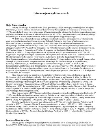 Amadeus Festiwal Informacje o wykonawcach Kaja Danczowska Naukę rozpoczęła w ósmym roku życia, pobierając lekcje nauki gry na skrzypcach u Eugenii Umińskiej, u której później studiowała w Państwowej Wyższej Szkole Muzycznej w Krakowie. W 1972 r. uzyskała dyplom z wyróżnieniem. W tym samym roku ukończyła dwuletni kurs mistrzowski w Konserwatorium w Moskwie u Dawida Ojstracha. W 1976 r., na zaproszenie rządu kanadyjskiego, uczestniczyła w kursie mistrzowskim prowadzonym przez Ruggiero Ricciego. W 1959 roku zdobyła I miejsce na Ogólnopolskim Konkursie Skrzypcowym we Wrocławiu oraz otrzymała stypendium Stowarzyszenia Polskich Artystów Muzyków ufundowane przez Henryka Szerynga, następnie stypendium Pawła Kleckiego, Poznańskiego Towarzystwa Muzycznego oraz Ministra Kultury i Sztuki. Jest laureatką wielu międzynarodowych konkursów skrzypcowych: w 1967 r. zdobyła III nagrodę na V Międzynarodowym Konkursie Skrzypcowym im. H. Wieniawskiego w Poznaniu, w 1969 r. - II nagrodę na Konkursie Skrzypcowym im. A. Curci w Neapolu, w 1970 r. - II nagrodę na Konkursie Wykonań Muzycznych w Genewie, w 1975 r. - III nagrodę na Międzynarodowym Konkursie Radiowym w Monachium, w 1976 r. - srebrny medal na Międzynarodowym Konkursie Muzycznym im. Królowej Elżbiety Belgijskiej w Brukseli. Kaja Danczowska koncertuje od dziewiątego roku życia. Występowała w wielu krajach Europy, obu Ameryk, Azji i w Australii, z repertuarem od Vivaldiego do Pendereckiego, m.in. pod batutą J. Krenza, J. Maksymiuka, K. Pendereckiego, S. Skrowaczewskiego, A. Wita. Od 1978 r. jako kameralistka współpracuje z K. Zimermanem. Jako „music adviser" w 1999 r. brała udział w tournée Polish Festival Orchestra Krystiana Zimermana prezentującej koncerty Fryderyka Chopina oraz w nagraniu płytowym dla DG. W repertuarze kameralnym występowała również m.in. z H. Holligerem, G. Kremerem, M. Maiskym. Kaja Danczowska ma bogaty dorobek płytowy. Nagrała m.in. Koncert skrzypcowy A-dur Karłowicza z Orkiestrą Polskiego Radia i Telewizji w Krakowie pod batutą A. Wita (Le Chant du Monde, 1992), Koncert podwójny na skrzypce i wiolonczelę „Lila” Regameya z Andrzejem Bauerem i Sinfonią Varsovią pod dyrekcją W. Michniewskiego (Swiss Broadcasting Corporation, 1994), I i II Koncert skrzypcowy Szymanowskiego z Orkiestrą Filharmonii Narodowej pod dyrekcją K. Korda (Polygram, 1997). Ta ostatnia płyta w 1998 r. wyróżniona została nagrodą „Diapason d'Or”. Ponadto artystka posiada w swoim dorobku ponad 300 archiwalnych nagrań radiowych, przede wszystkim dla Polskiego Radia i rozgłośni RIAS. Kaja Danczowska od 1972 r. prowadzi klasę skrzypiec w Akademii Muzycznej w Krakowie. W 1997 r. uzyskała tytuł profesora zwyczajnego. Była jurorem międzynarodowych konkursów, m.in. im. Konkursu Skrzypcowego im. H. Wieniawskiego w Poznaniu (1986), w Tokio (1986), Monachium (1992, 1998), Nowym Jorku (1999) i im. Carla Augusta Nielsena w Odense (2000). Została wyróżniona licznymi nagrodami, m.in. w 1976 r. otrzymała Nagrodę Państwową II stopnia, w 1977 r. - Nagrodę Miasta Krakowa, trzykrotnie: w latach 1979, 1991, 1998 - Nagrodę Ministra Kultury i Sztuki, w 1982 r. - Nagrodę Ministra Spraw Zagranicznych, w 1984 r. - Nagrodę Komitetu do spraw Radia i Telewizji, w 1986 r. - Złoty Krzyż Zasługi, w 1992 r. - Nagrodę Wojewody Krakowskiego, w 1998 r. - Nagrodę Fundacji Kultury Polskiej, w 1999 r. – „Excellent in Teaching” Fundacji Robinsonów. Justyna Danczowska Naukę gry na fortepianie rozpoczęła w wieku siedmiu lat w klasie Jadwigi Zychowicz. W latach 1990–1998 była uczennicą Celestyny Koziak, następnie pracowała pod kierunkiem Marioli Cieniawy i Ireny Rolanowskiej. Obecnie jest studentką Akademii Muzycznej w Bazylei w klasie Krystiana Zimermana. Po raz pierwszy wystąpiła z orkiestrą w wieku dwunastu lat. W 1997 r. zwyciężyła w Konkursie Pianistycznym im. prof. Ludwika Stefańskiego w Płocku, otrzymując ponadto nagrody specjalne za najlepsze wykonania utworów Bacha i Beethovena. W 1998 r. zdobyła pierwszą nagrodę na Międzynarodowym Konkursie Chopinowskim dla Młodzieży w Szafarni. Podczas konkursu dla młodych muzyków Nuta na gruszce w Krakowie (2000) otrzymała pierwszą nagrodę oraz nagrodę specjalną PWM-u za najlepsze wykonanie utworu współczesnego. W latach 1996– 1999 była stypendystką Krajowego Funduszu na Rzecz Dzieci, przez kolejne trzy lata otrzymywała Stypendium Twórcze Ministerstwa Kultury i Dziedzictwa Narodowego. Latem 2001 r. Justyna Danczowska wraz z dwoma studentami polskiego pochodzenia (Lech Antonio Uszyński – skrzypce, Sebastian Uszyński – wiolonczela) założyła trio fortepianowe Elegiaque. Zespół pracuje pod kierunkiem Gerarda Wyssa. Został już nagrodzony koncertem na festiwalu Orpheus 2002 w Zurychu, otrzymał także nagrodę specjalną jury w konkursie muzyki kameralnej Jeunesses Musicales w Neuchatel (2002) oraz trzecią nagrodę w konkursie muzyki kameralnej Migros Kulturprozent w Zurychu (2003). Trio Elegiaque należy do zespołów fundacji Yehudi Menuhin Live Music now. Występuje regularnie w Polsce, Szwajcarii oraz innych krajach europejskich. W roku akademickim 2002/2003 Justyna Danczowska została stypendystką Narodowego Instytutu Fryderyka Chopina. Stypendium ufundowała Powszechna Kasa Oszczędności Bank Polski SA. Romana Podsadecka-Ostafil Debiutowała w wieku czternastu lat z Orkiestrą Filharmonii Krakowskiej pod dyrekcją Henryka Czyża podczas Międzynarodowego Festiwalu Krakowska Wiosna Muzyki. Następnie kształciła się w krakowskiej Akademii Muzycznej w klasie fortepianu u Tadeusza Żmudzińskiego i klasie klawesynu u Elżbiety Stefańskiej. Zdobyła pierwsze miejsce w Konkursie na Stypendia Artystyczne im. Fryderyka Chopina w Warszawie. Jest również laureatką Festiwalu Pianistyki Polskiej w Słupsku oraz Nagrody Prezydenta Miasta Krakowa. Koncertuje jako pianistka i klawesynistka. Jest sz