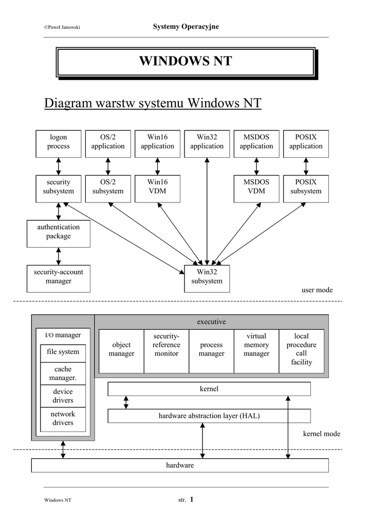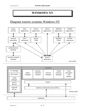 Systemy Operacyjne ©Paweł Janowski WINDOWS NT Diagram warstw systemu Windows NT logon process OS/2 application Win16 application security subsystem OS/2 subsystem Win16 VDM Win32 application MSDOS application POSIX application MSDOS VDM POSIX subsystem authentication package security-account manager Win32 subsystem user mode executive I/O manager file system object manager securityreference monitor process manager virtual memory manager cache manager. device drivers kernel network drivers hardware abstraction layer (HAL) local procedure call facility kernel mode hardware Windows NT str. 1 ©Paweł Janowski Systemy Operacyjne Hardware abstraction layer (HAL) • warstwa oprogramowania ukrywająca różnice sprzętowe przed wyższymi warstwami systemu operacyjnego — dostarcza interfejsu używanego przez jądro, zarządcę (ang. executive) i sterowniki urządzeń Jądro • używa dwóch rodzajów obiektów — dispatcher (np. zdarzenia, mutex-y, semafory, wątki czy zegary) i control (np. asynchroniczne wywołania procedur, przerwania, procesy czy profile) • procesy i wątki — każdy proces zawiera jeden lub więcej wątków • stany wątków → gotowy, bezczynny, działający, oczekujący, nowy i zakończony • strategia karuzelowa, kolejka wielopoziomowa ze sprzężeniem zwrotnym • planista używa 32 poziomów priorytetów do ustalenia porządku wątków — z każdym poziomem związana jest jedna kolejka — wybierany jest wątek o najwyższym priorytecie, gotowy do wykonania • priorytet wątku jest zmniejszany zawsze po wykorzystaniu kwantu czasu procesora a zwiększany gdy proces wychodzi ze stanu oczekiwania • procesy z klasy real-time mają większe priorytety i prawo wywłaszczania procesów klasy variable • procesy działają w trybie użytkownika lub w trybie jądra Windows NT str. 2 ©Paweł Janowski Systemy Operacyjne • wyjątki i przerwania sprzętowe i programowe — „błękitny ekran śmierci” oznacza wyjątek w trybie jądra dla którego nie ma funkcji obsługi • 32 poziomy przerwań — 8 używanych przez jądro i 24 reprezentujące przerwania sprzętowe przez HAL Zarządca • dostarcza zbiór usług, których mogą używać podsystemy odpowiedzialne za poszczególne środowiska — zarządzanie obiektami, zarządzanie pamięcią wirtualną, zarządzanie procesami, umożliwienie lokalnego wywoływania procedur, zarządzanie I/O i monitorowanie bezpieczeństwa Windows NT to system obiektowy — używa obiektów dla wszystkich swoich encji i serwisów (np. obiekty katalogów, linków symbolicznych, zdarzeń, procesów i wątków) Zarządca obiektów • obiekt może być używany tylko po otrzymaniu uchwytu — interfejsu do obiektu • idealne miejsce do sprawdzania uprawnień i bezpieczeństwa — każdy użytkownik w momencie zalogowania się do systemu otrzymuje żeton dostępu (zawierający dane identyfikujące) umożliwiający korzystanie z pewnego zbioru obiektów • utrzymuje informacje o tym jakie obiekty są używane przez jakie procesy — każdy obiekt zawiera licznik odwołań (ilość uchwytów) i licznik Windows NT str. 3 ©Paweł Janowski Systemy Operacyjne referencji (system często używa wskaźników zamiast uchwytów); gdy któryś z liczników zmaleje do zera obiekty (tymczasowe) są usuwane z pamięci • obiekty stałe reprezentują encje fizyczne, np. napędy dyskowe itp. • do manipulacji obiektami służy standardowy zbiór metod np. create, open, close, delete itp. • obiekty mogą posiadać nazwy — przestrzeń nazw obiektów jest globalna i umożliwia ich dzielenie • każdy proces utrzymuje tablicę obiektów zawierającą m.in. prawa dostępu do obiektu Zarządca pamięci wirtualnej • wymagamy od sprzętu umiejętności odwzorowywania pamięci wirtualnej do fizycznej, mechanizmu stronicowania i możliwości dzielenia ramek pamięci fizycznej • stronicowanie na żądanie, strona wielkości 4KB, strony przydzielone procesom, które nie są w pamięci fizycznej przechowywane są w pliku wymiany • adresy 32-bitowe, zatem do 4GB pamięci wirtualnej dla każdego procesu — górne 2GB, identyczne w każdym procesie są używane tylko w trybie jądra • dwustopniowa alokacja pamięci — rezerwacja przestrzeni adresowej procesu + potwierdzenie alokacji przez przydział przestrzeni w pliku wymiany • przestrzeń wirtualna nowo tworzonego procesu jest dostępna dla procesu rodzica — pamięć Windows NT str. 4 Systemy Operacyjne ©Paweł Janowski reprezentowana przez obiekty, które można dzielić (za pomocą uchwytów) • segmenty pamięci mogą być dzielone przez wiele procesów • każdy proces ma katalog stron (ang. page directory), który zawiera 1024 pozycje (PDE) rozmiaru 4B każda; każda taka pozycja wskazuje na tablicę stron, która zawiera 1024 pozycje tablicy stron (PTE) rozmiaru 4B każda; każda PTE wskazuje na 4KB ramkę pamięci fizycznej (całkowity rozmiar wszystkich tablic stron procesu to 4MB) • 32-bitowy adres wirtualny jest dzielony na trzy części: 31 21 11 P DE P TE o f f s e t 10 bitów 10 bitów 12 bitów • wskaźnik do pojedynczego bajta w pamięci fizycznej składa się z 20 bitów z PTE (która ma 4B) i 12 bitów przesunięcia (z adresu wirtualnego) — pozostałe 12 bitów w PTE służy do opisania atrybutów (RO, RW) i stanu strony (poprawna, wyzerowana, wolna, oczekująca, zmodyfikowana lub zła) • dla stron dzielonych PTE w każdym z procesów wskazuje na pozycję prototypową zamiast bezpośrednio na ramkę — dzięki temu każda zmiana na stronie wymaga poprawienia zapisu w jednym miejscu Windows NT str. 5 ©Paweł Janowski Systemy Operacyjne • zarządca pamięci wirtualnej utrzymuje bazę danych odwzorowań strona ↔ ramka; dla każdej ramki pamięci fizycznej ma wskaźnik do PTE zawierającej wskaźnik do danej ramki • błąd braku strony powoduje sprowadzenie strony do pierwszej wolnej ramki (wziętej z listy) oraz sprowadzenie kilku stron sąsiednich (przy