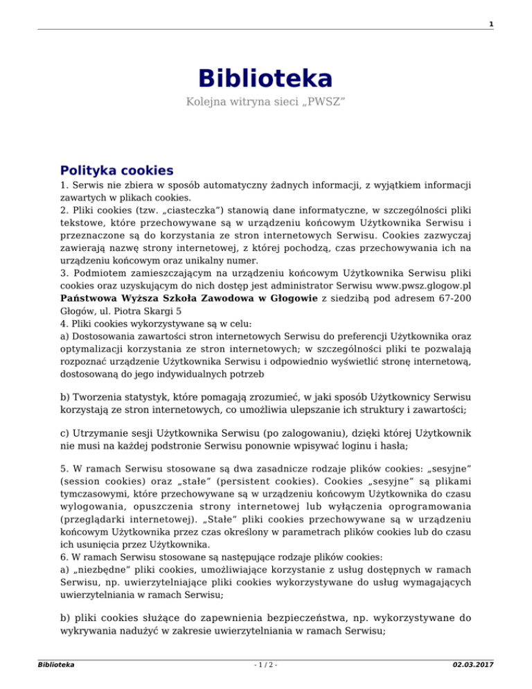 1 Biblioteka Kolejna witryna sieci „PWSZ” Polityka cookies 1. Serwis nie zbiera w sposób automatyczny żadnych informacji, z wyjątkiem informacji zawartych w plikach cookies. 2. Pliki cookies (tzw. „ciasteczka”) stanowią dane informatyczne, w szczególności pliki tekstowe, które przechowywane są w urządzeniu końcowym Użytkownika Serwisu i przeznaczone są do korzystania ze stron internetowych Serwisu. Cookies zazwyczaj zawierają nazwę strony internetowej, z której pochodzą, czas przechowywania ich na urządzeniu końcowym oraz unikalny numer. 3. Podmiotem zamieszczającym na urządzeniu końcowym Użytkownika Serwisu pliki cookies oraz uzyskującym do nich dostęp jest administrator Serwisu www.pwsz.glogow.pl Państwowa Wyższa Szkoła Zawodowa w Głogowie z siedzibą pod adresem 67-200 Głogów, ul. Piotra Skargi 5 4. Pliki cookies wykorzystywane są w celu: a) Dostosowania zawartości stron internetowych Serwisu do preferencji Użytkownika oraz optymalizacji korzystania ze stron internetowych; w szczególności pliki te pozwalają rozpoznać urządzenie Użytkownika Serwisu i odpowiednio wyświetlić stronę internetową, dostosowaną do jego indywidualnych potrzeb b) Tworzenia statystyk, które pomagają zrozumieć, w jaki sposób Użytkownicy Serwisu korzystają ze stron internetowych, co umożliwia ulepszanie ich struktury i zawartości; c) Utrzymanie sesji Użytkownika Serwisu (po zalogowaniu), dzięki której Użytkownik nie musi na każdej podstronie Serwisu ponownie wpisywać loginu i hasła; 5. W ramach Serwisu stosowane są dwa zasadnicze rodzaje plików cookies: „sesyjne” (session cookies) oraz „stałe” (persistent cookies). Cookies „sesyjne” są plikami tymczasowymi, które przechowywane są w urządzeniu końcowym Użytkownika do czasu wylogowania, opuszczenia strony internetowej lub wyłączenia oprogramowania (przeglądarki internetowej). „Stałe” pliki cookies przechowywane są w urządzeniu końcowym Użytkownika przez czas określony w parametrach plików cookies lub do czasu ich usunięcia przez Użytkownika. 6. W ramach Serwisu stosowane są następujące rodzaje plików cookies: a) „niezbędne” pliki cookies, umożliwiające korzystanie z usług dostępnych w ramach Serwisu, np. uwierzytelniające pliki cookies wykorzystywane do usług wymagających uwierzytelniania w ramach Serwisu; b) pliki cookies służące do zapewnienia bezpieczeństwa, np. wykorzystywane do wykrywania nadużyć w zakresie uwierzytelniania w ramach Serwisu; Biblioteka -1/2- 02.03.2017 2 c) „wydajnościowe” pliki cookies, umożliwiające zbieranie informacji o sposobie korzystania ze stron internetowych Serwisu; d) „funkcjonalne” pliki cookies, umożliwiające „zapamiętanie” wybranych przez Użytkownika ustawień i personalizację interfejsu Użytkownika, np. w zakresie wybranego języka lub regionu, z którego pochodzi Użytkownik, rozmiaru czcionki, wyglądu strony internetowej itp.; e) „reklamowe” pliki cookies, umożliwiające dostarczanie Użytkownikom treści reklamowych bardziej dostosowanych do ich zainteresowań. 7. W wielu przypadkach oprogramowanie służące do przeglądania stron internetowych (przeglądarka internetowa) domyślnie dopuszcza przechowywanie plików cookies w urządzeniu końcowym Użytkownika. Użytkownicy Serwisu mogą dokonać w każdym czasie zmiany ustawień dotyczących plików cookies. Ustawienia te mogą zostać zmienione w szczególności w taki sposób, aby blokować automatyczną obsługę plików cookies w ustawieniach przeglądarki internetowej bądź informować o ich każdorazowym zamieszczeniu w urządzeniu Użytkownika Serwisu. Szczegółowe informacje o możliwości i sposobach obsługi plików cookies dostępne są w ustawieniach oprogramowania (przeglądarki internetowej). 8. Operator Serwisu informuje, że ograniczenia stosowania plików cookies mogą wpłynąć na niektóre funkcjonalności dostępne na stronach internetowych Serwisu. 9. Pliki cookies zamieszczane w urządzeniu końcowym Użytkownika Serwisu i wykorzystywane mogą być również przez współpracujących z operatorem Serwisu reklamodawców oraz partnerów. 10. Więcej informacji na temat plików cookies dostępnych jest w sekcji „Pomoc” w menu przeglądarki internetowej. Biblioteka -2/2- 02.03.2017